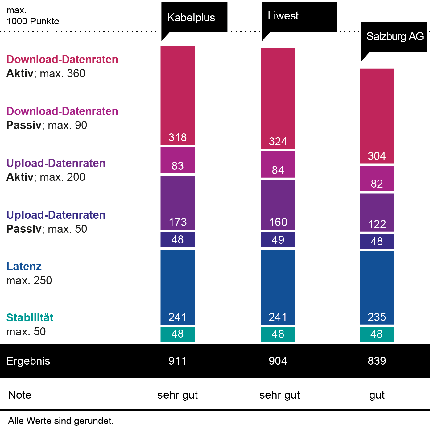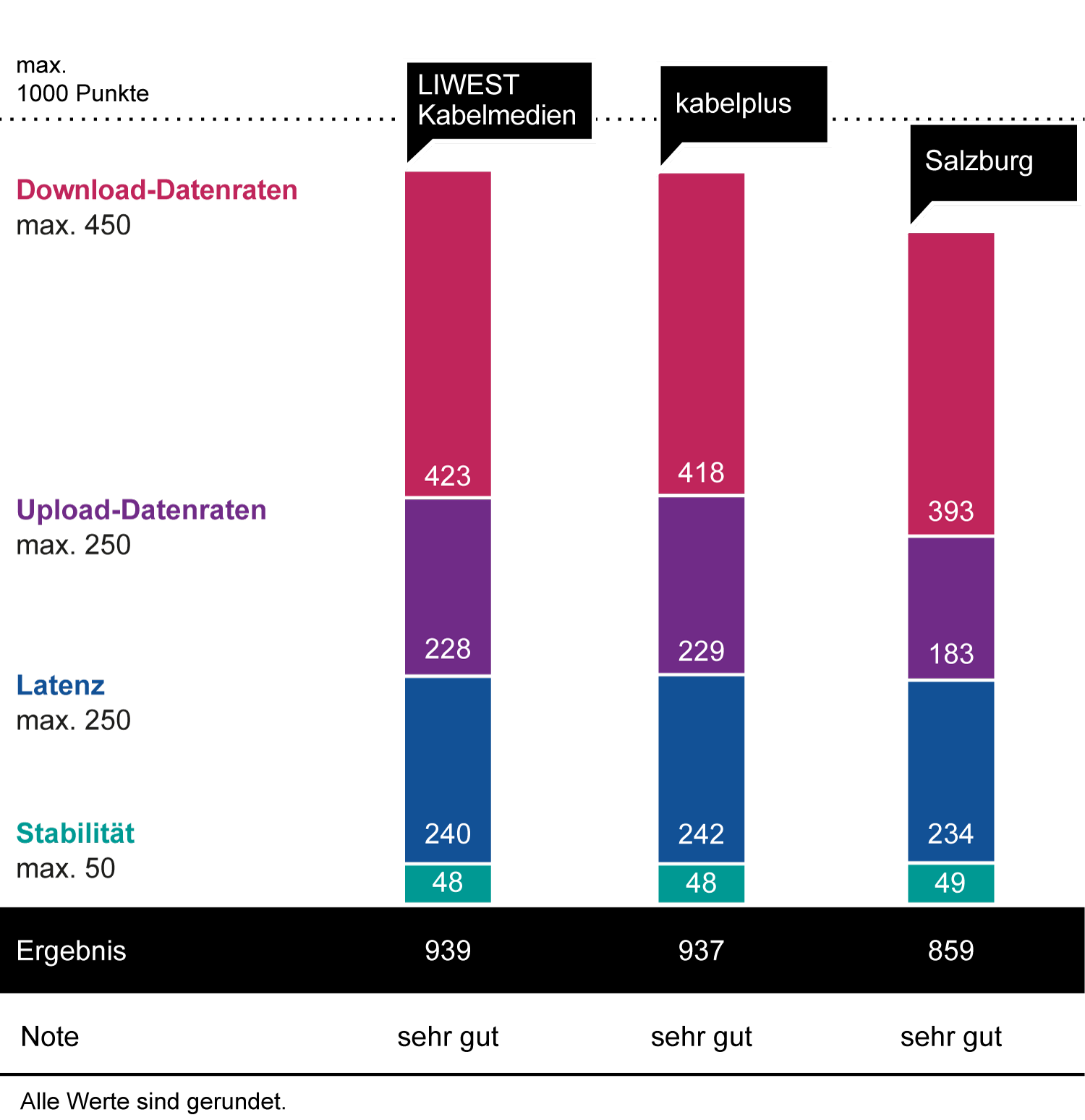 Auf regionaler Ebene siegt Kabelplus mit der Note "sehr gut", gefolgt von Liwest und Salzburg
