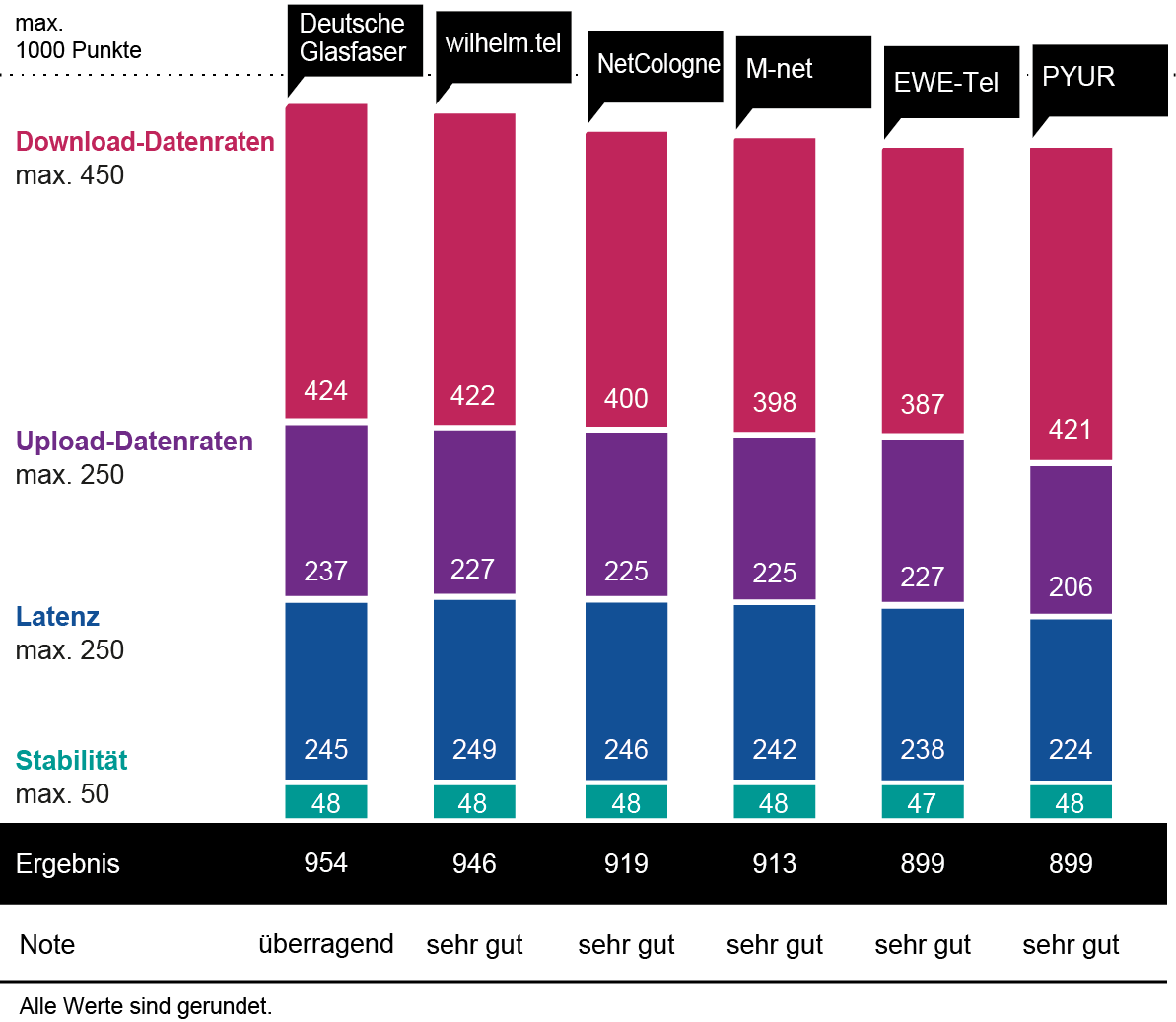 Auf regionaler Ebene siegt Deutsche Glasfaser gefolgt von Pyur – beide mit der Note "sehr gut"