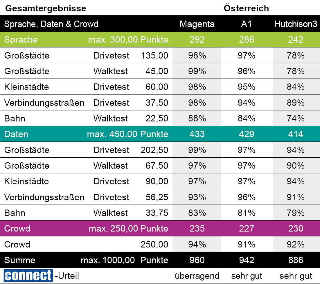 Magenta gewinnt den connect Mobilfunknetztest in Österreich, A1 folgt auf dem zweiten Platz, Drei erreicht Platz drei.