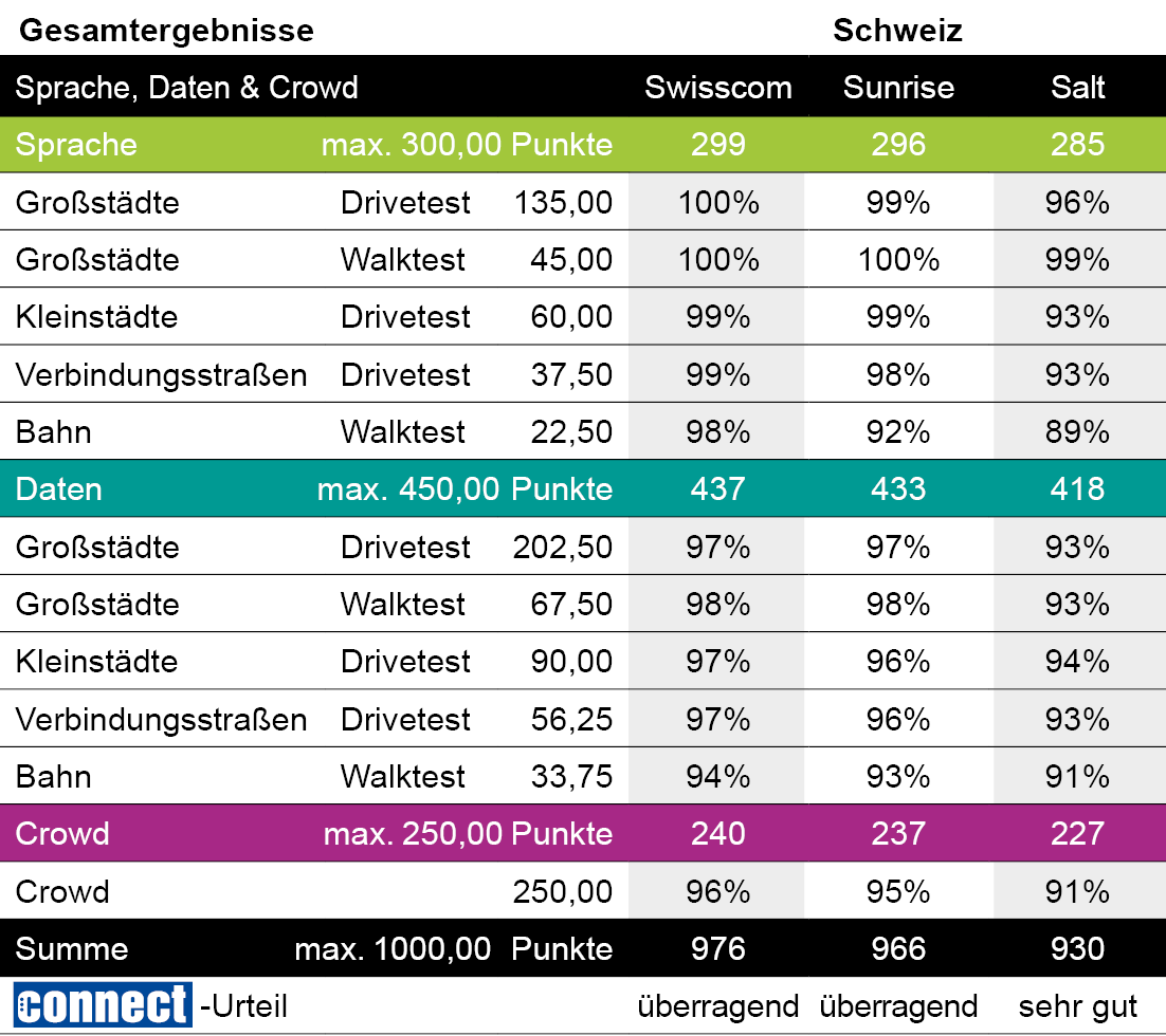 Swisscom gewinnt den connect Mobilfunknetztest in der Schweiz, Sunrise folgt auf dem zweiten Platz, Salt auf dem dritten Platz.