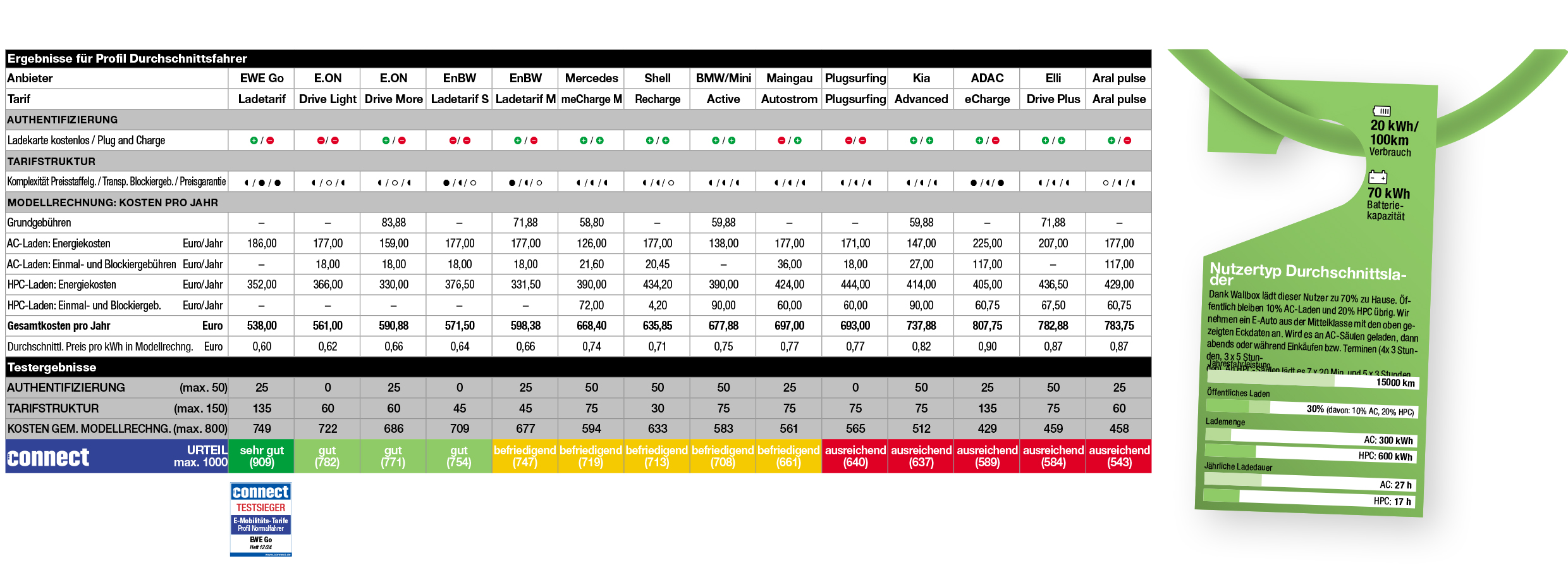 Für den "Durchschnittsfahrer" ist EWE Go auf Platz 1, gefolgt von E.ON mit dem Tarif Drive Light auf Platz 2 und EnBW mit dem Ladetarif S auf Platz 3