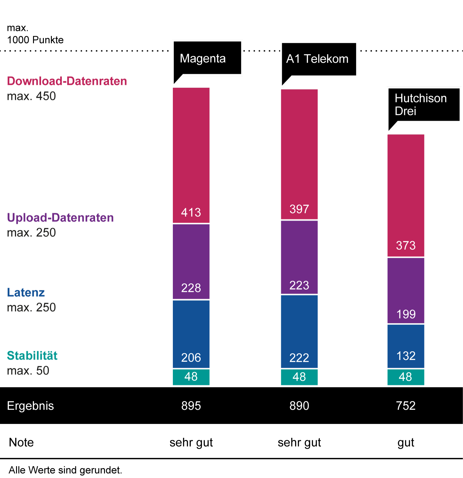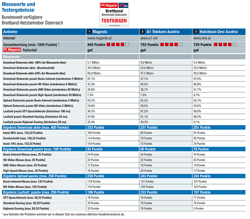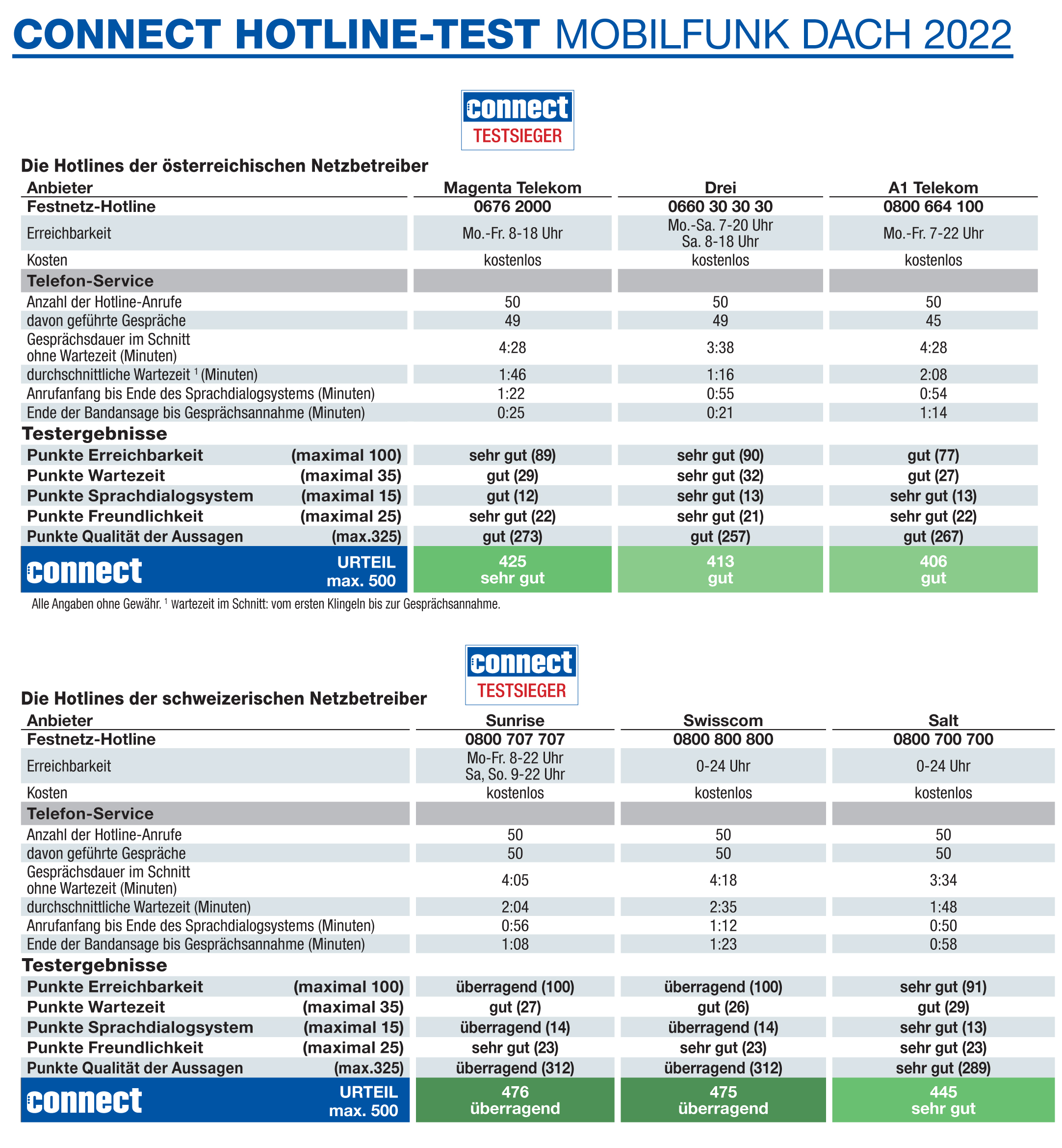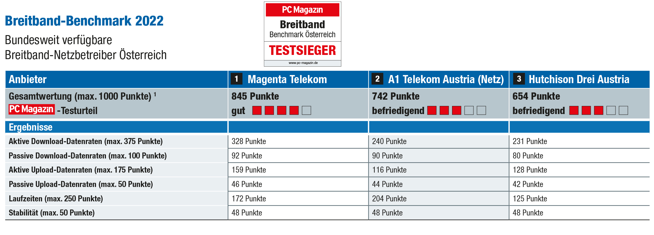Magenta Telekom ist bundesweiter Testsieger im connect Breitband- und Festnetz-test und erhält die Note "sehr gut", gefolgt von A1 Telekom und Hutchison Drei
