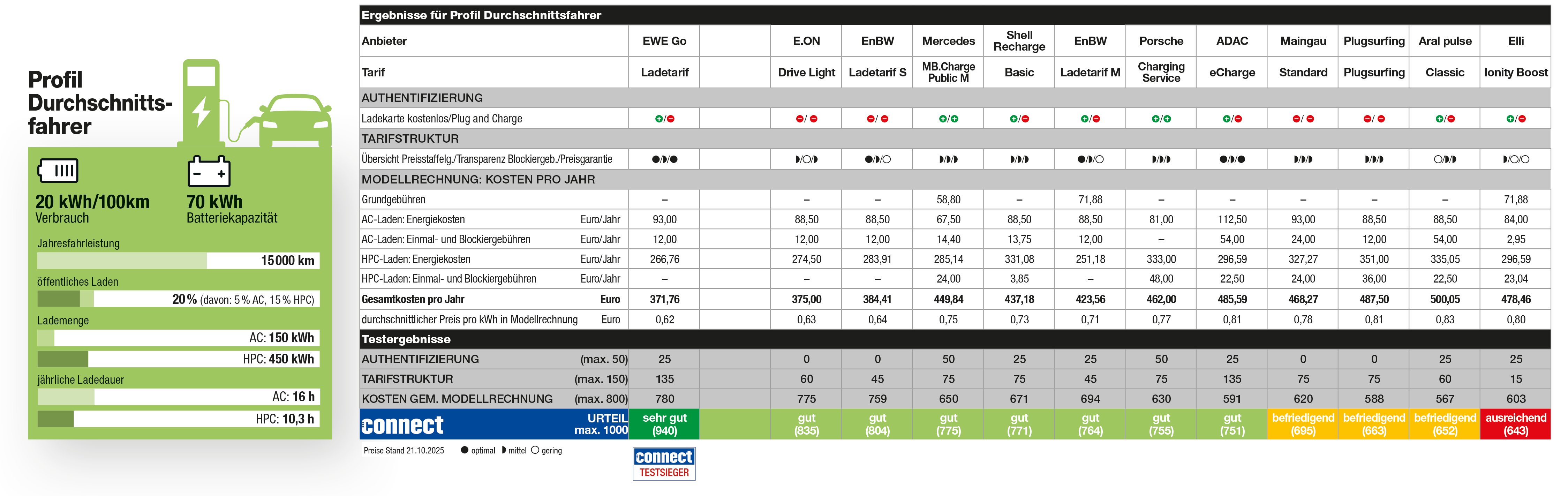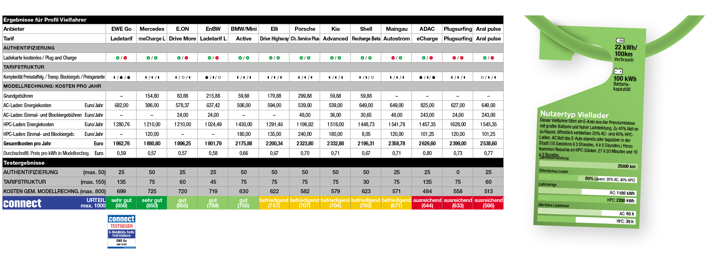 Für den "Vielfahrer", ist Mercedes auf Platz 1. EWE Go und der Premium-Tarif von Elli folgen auf Platz 2, beide Anbieter erzielen dieselbe Punktzahl