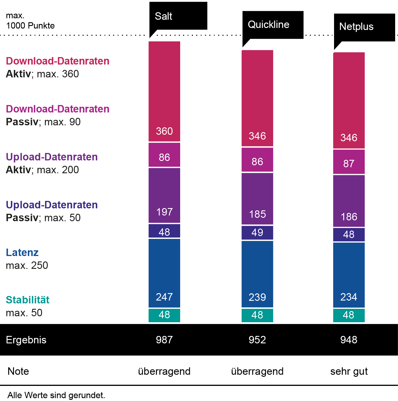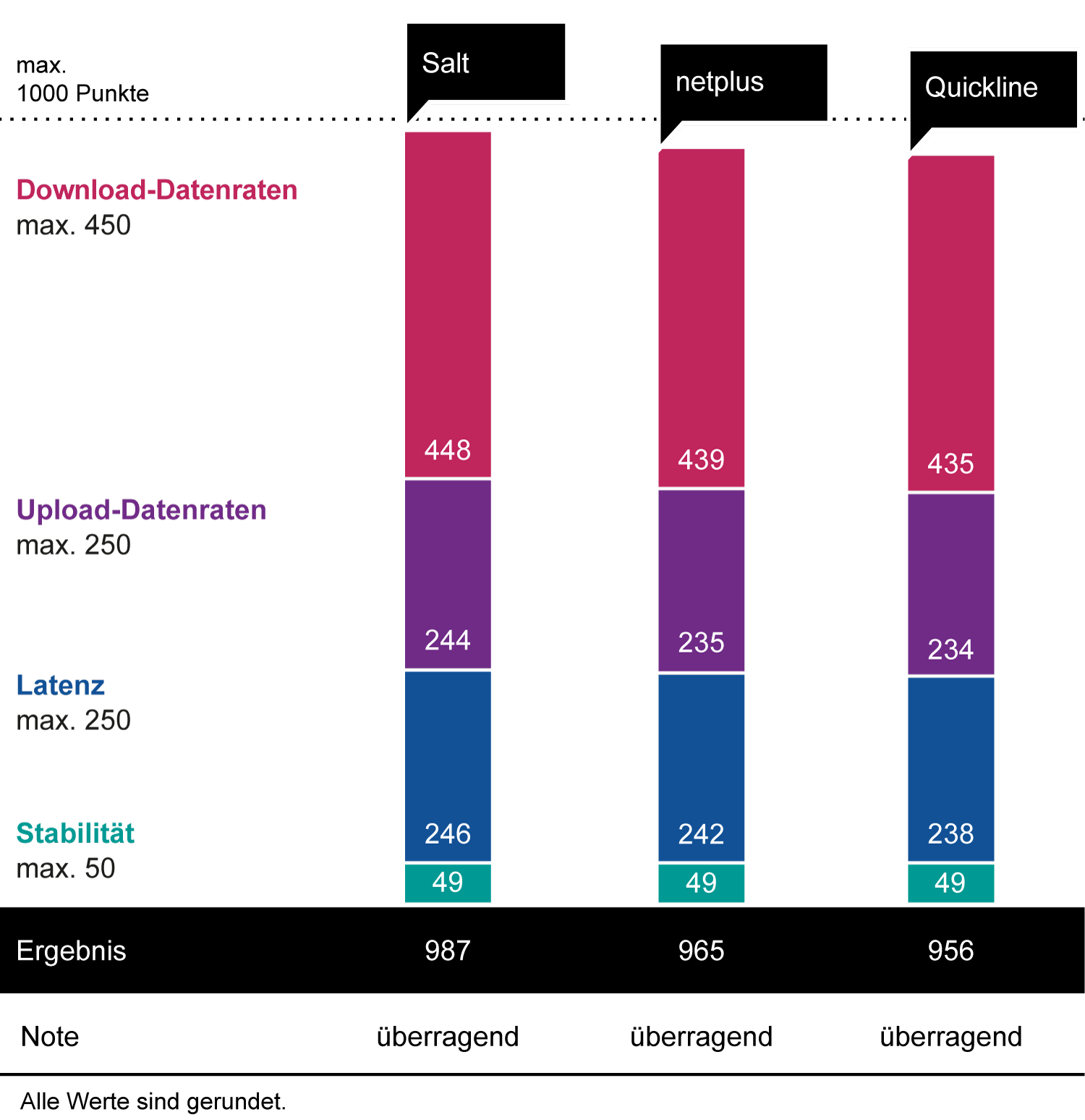 Auf regionaler Ebene siegt Salt mit der Note "überragend", gefolgt von Quickline und Netplus – beide mit der Note "sehr gut"