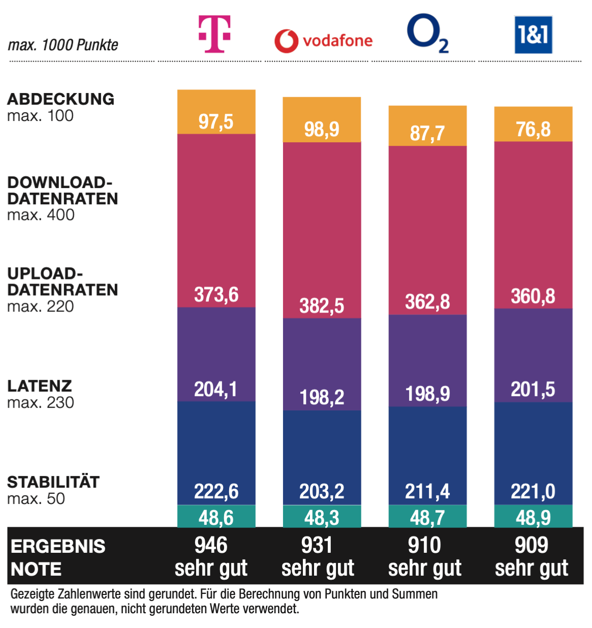 Deutsche Telekom ist Testsieger mit 946 von 1.000 möglichen Punkten und dem Testurteil „sehr gut“. Der Anbieter überzeugt mit den besten Upload-Datenraten und ist führend bei den Latenzen in allen Bewertungsklassen – dank des steigenden Glasfaser-Anteils im Netz sowie der angehobenen Upload-Geschwindigkeiten auch in den DSL-Tarifen.