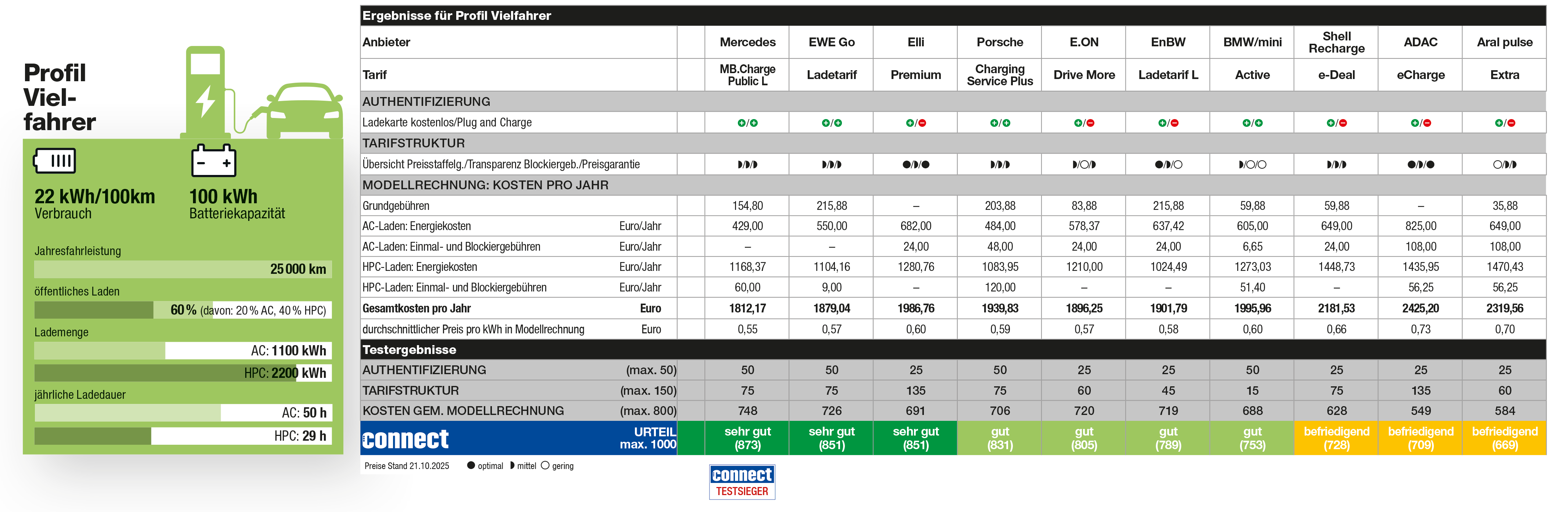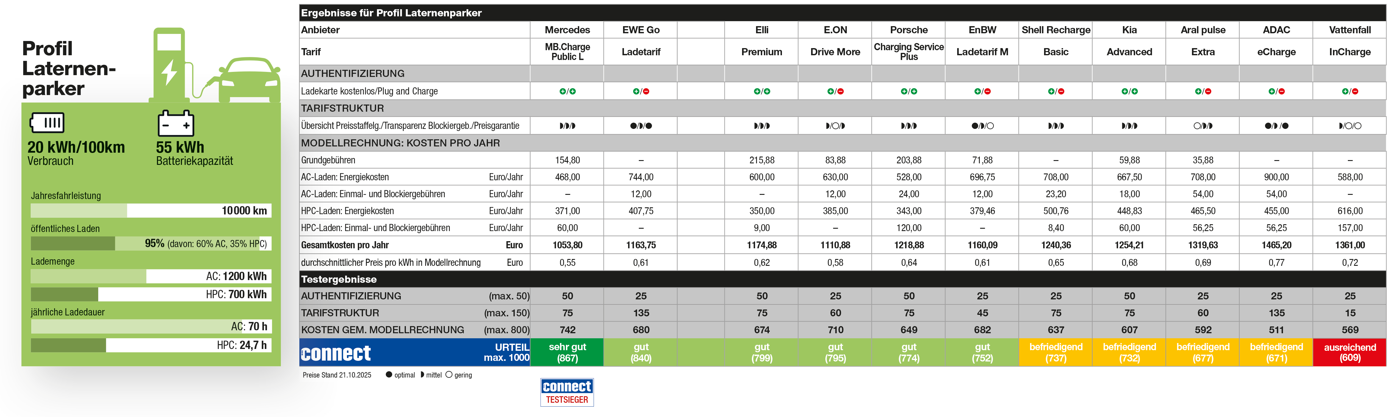 (pressebox) (Haar bei München, 30.10.2025) Welcher Ladetarif passt am besten zum jeweils individuellen Nutzungsverhalten eines E-Auto-Fahrers? Dieser Frage ist die führende Medienmarke connect erneut nachgegangen, gemeinsam mit einem auf Elektromobiltät spezialisierten, unabhängigen Test- und Messpartner. Der connect Tarifcheck vergleicht die Ladetarife von 14 E-Mobilitäts-Anbietern in Deutschland: ADAC, Aral pulse, BMW/Mini, E.ON, Elli, EnBW, EWE Go, Kia, Maingau, Mercedes, Plugsurfing, Porsche, Shell Recharge und Vattenfall. Die Nutzer werden in die Kategorien „Laternenparker“, „Vielfahrer“ und „Durchschnittsfahrer“ eingeteilt, um den für das jeweilige Nutzungsverhalten besten Tarif zu ermitteln. Mercedes ist Testsieger in den Kategorien „Laternenparker“ und „Vielfahrer“, EWE Go in der Kategorie „Durchschnittsfahrer“ – beide Anbieter erhalten die Note „sehr gut“.