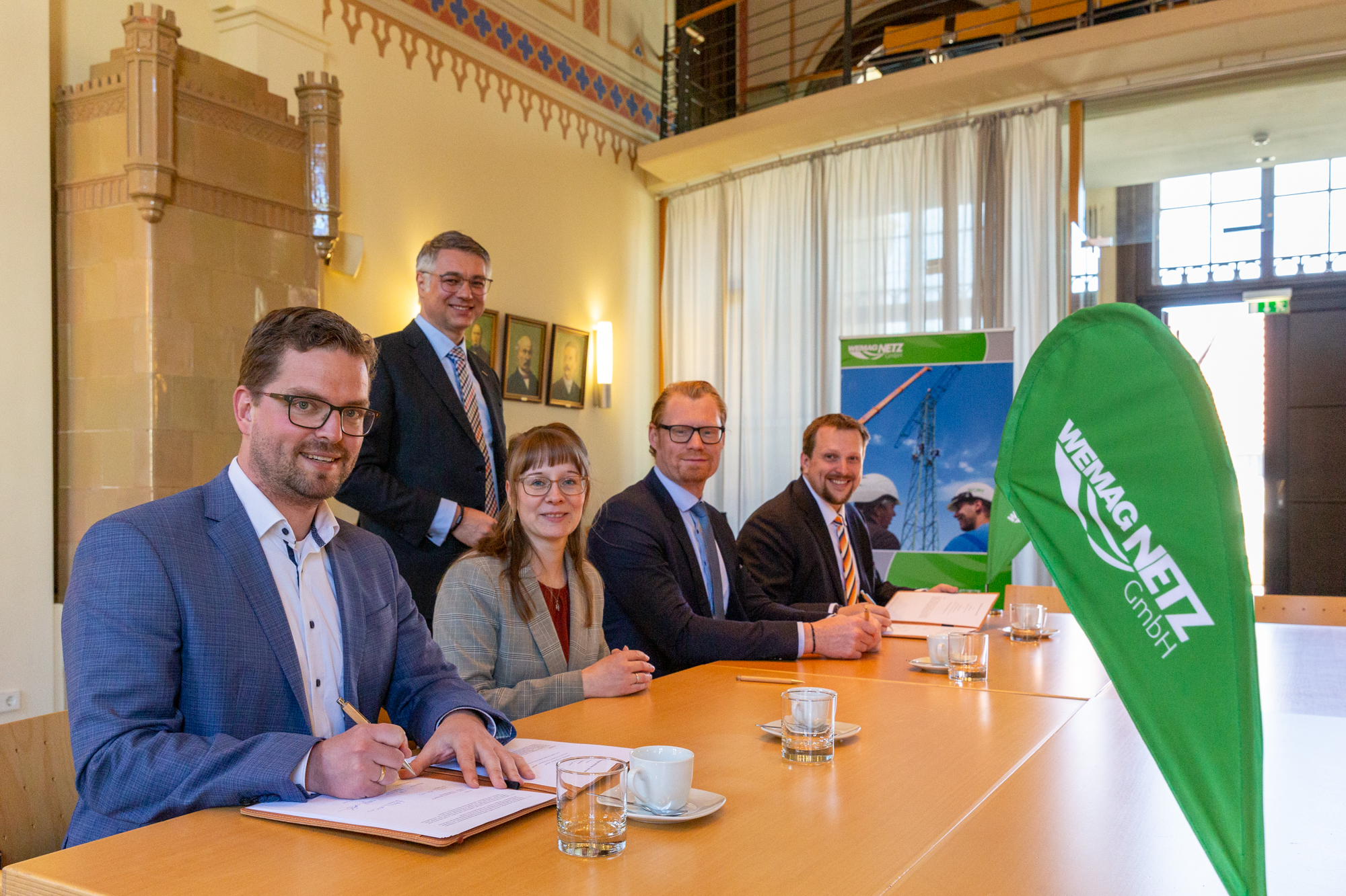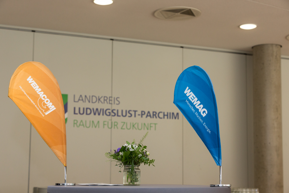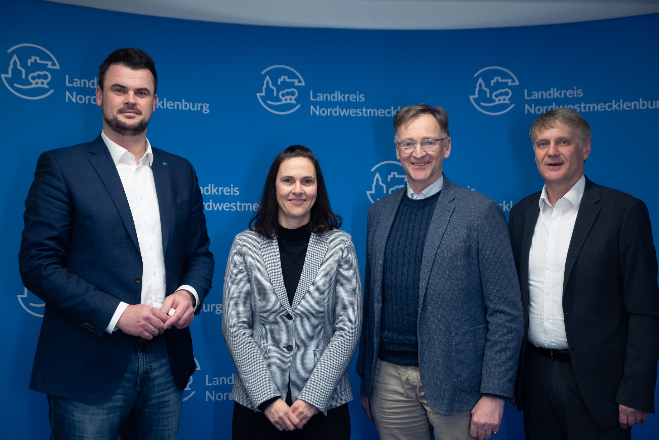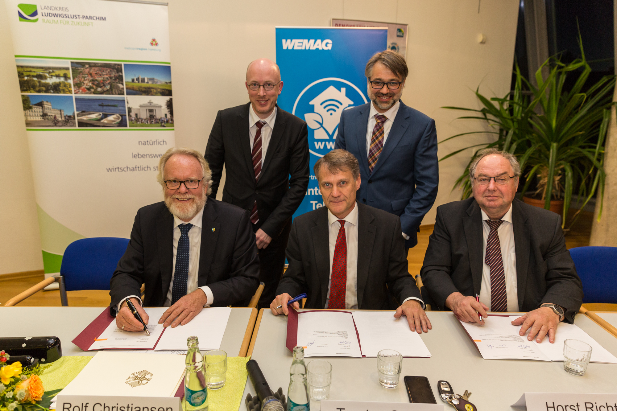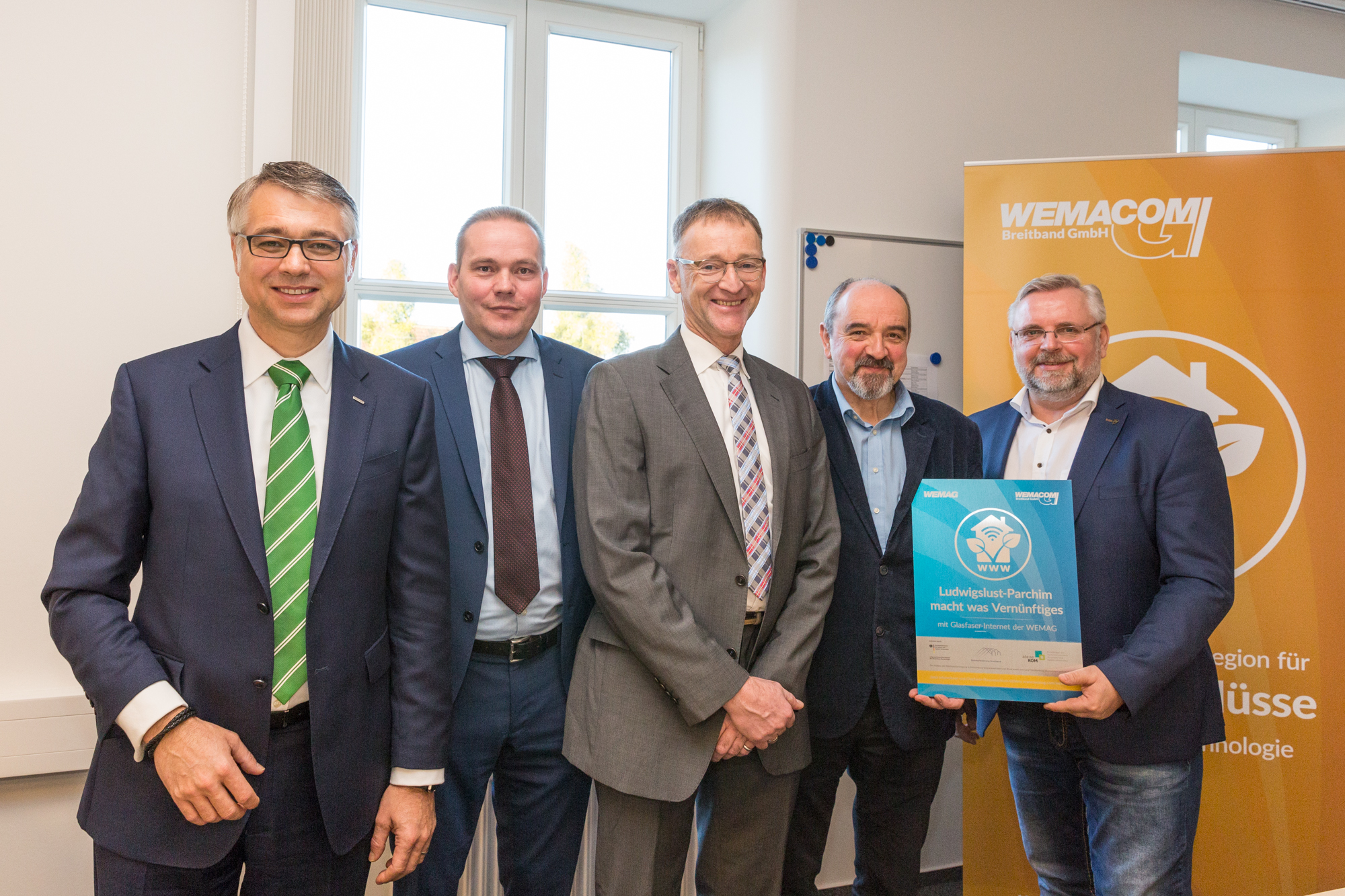 Kerstin Weiss, Landrätin des Landkreises Nordwestmecklenburg, Martin Retzlaff, kaufmännischer Programmleiter des Breitbandausbaus in der WEMAG-Unternehmensgruppe, Dr. Roland Finke, Leiter der Stabsstelle Wirtschaftsförderung, Regionalentwicklung und Planen, Michael Hillmann, Vertriebsleiter der WEMAG, Peter Schimanski, technischer Projektleiter des Breitbandausbaus in der WEMACOM (v.l.n.r.) beim Pressegespräch in Wismar. Foto: Landkreis Nordwestmecklenburg/ Eik Schäfer