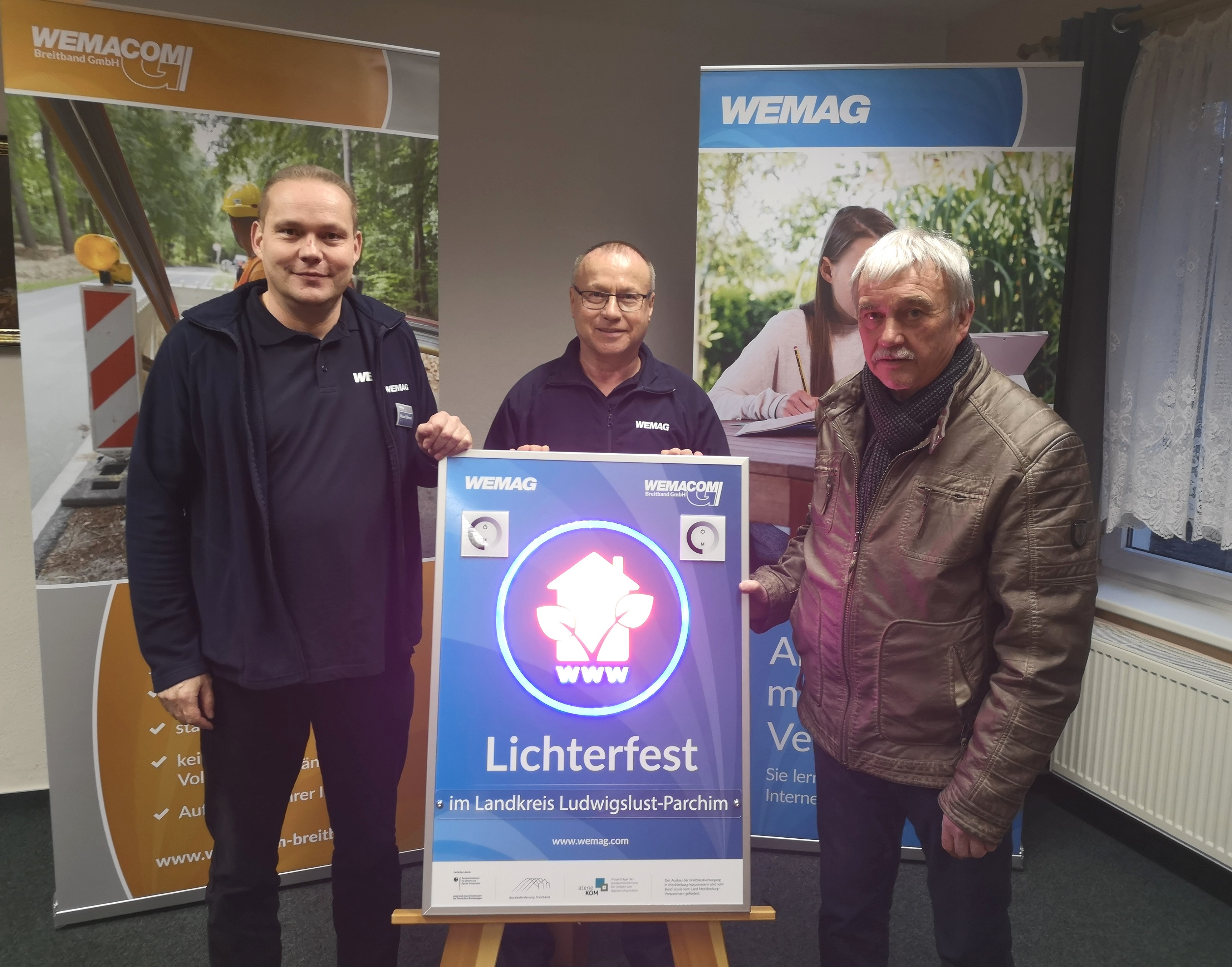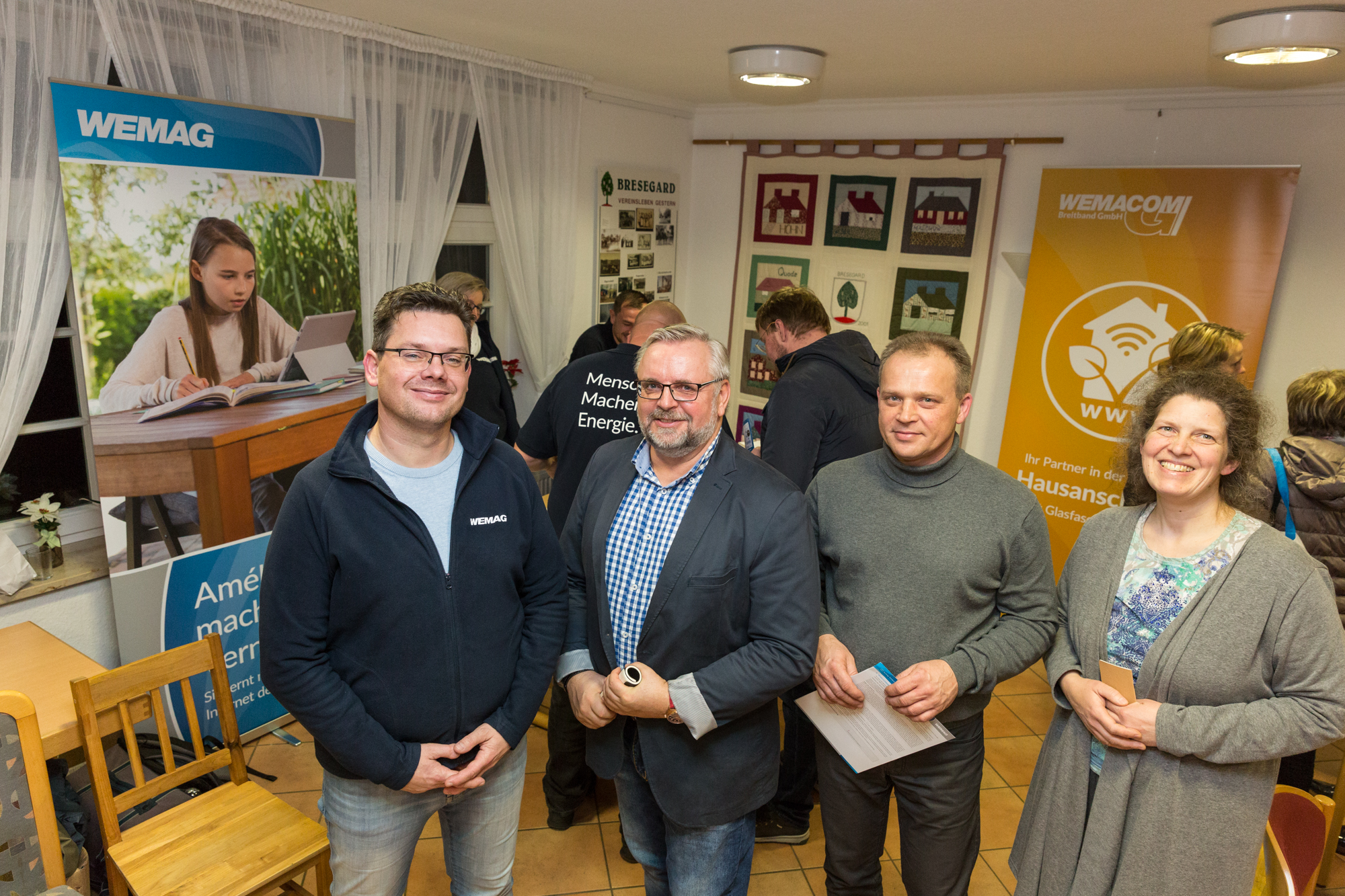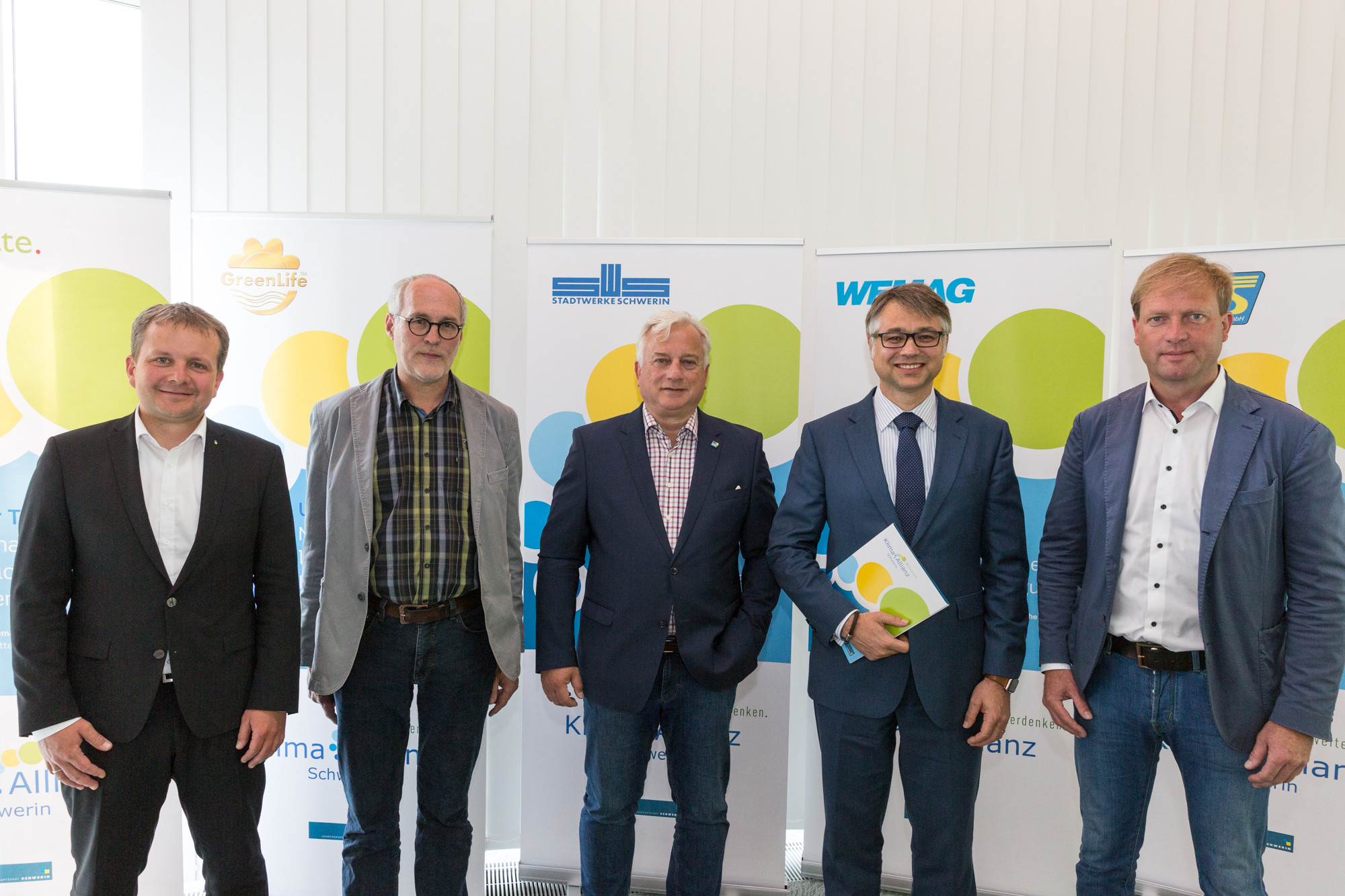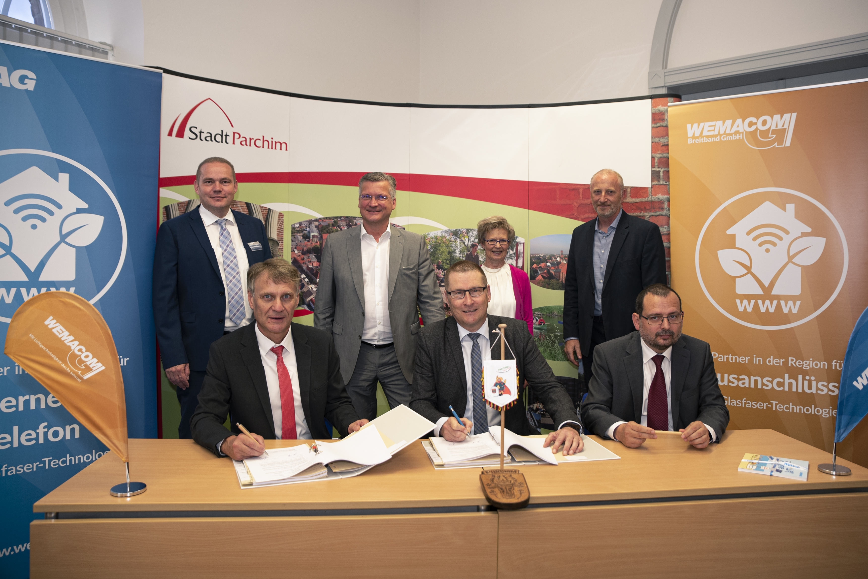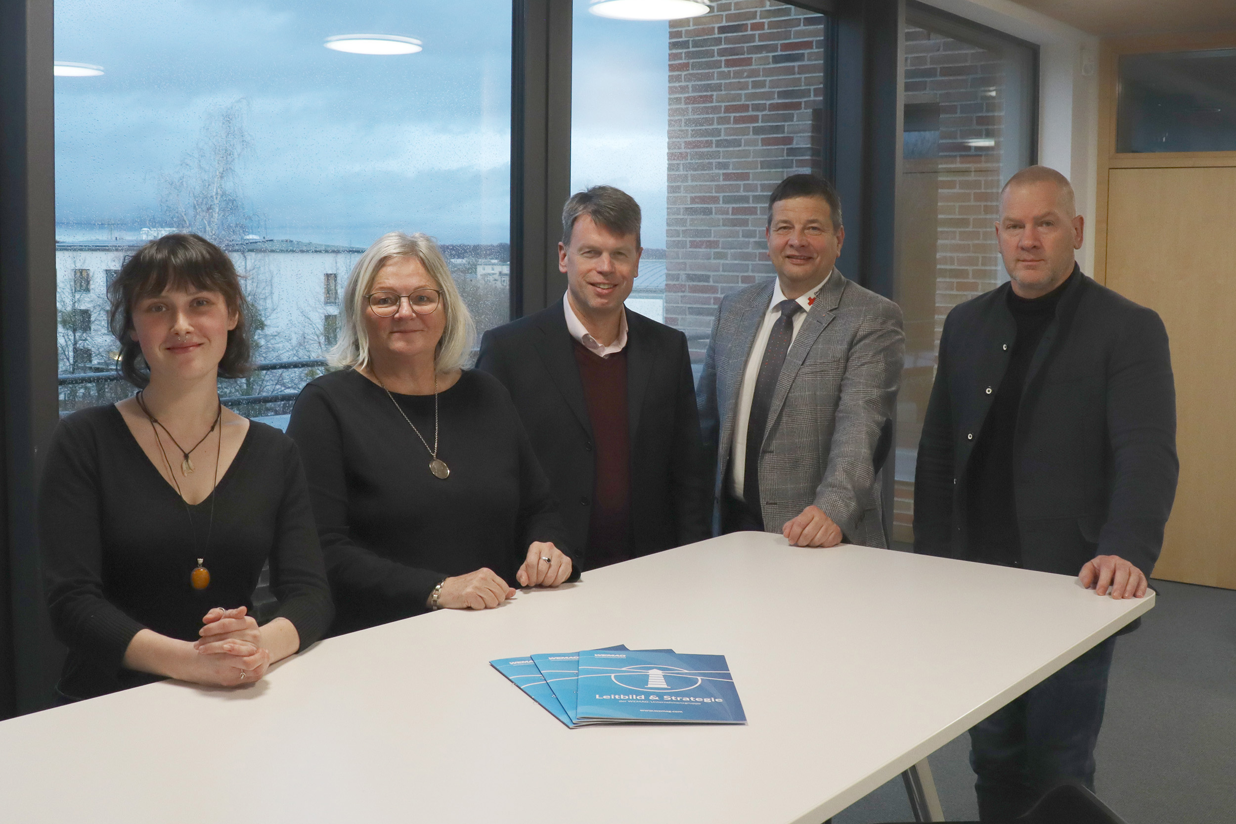 Kerstin Weiss, Landrätin des Landkreises Nordwestmecklenburg, Martin Retzlaff, kaufmännischer Programmleiter des Breitbandausbaus in der WEMAG-Unternehmensgruppe, Dr. Roland Finke, Leiter der Stabsstelle Wirtschaftsförderung, Regionalentwicklung und Planen, Michael Hillmann, Vertriebsleiter der WEMAG, Peter Schimanski, technischer Projektleiter des Breitbandausbaus in der WEMACOM (v.l.n.r.) beim Pressegespräch in Wismar. Foto: Landkreis Nordwestmecklenburg/ Eik Schäfer