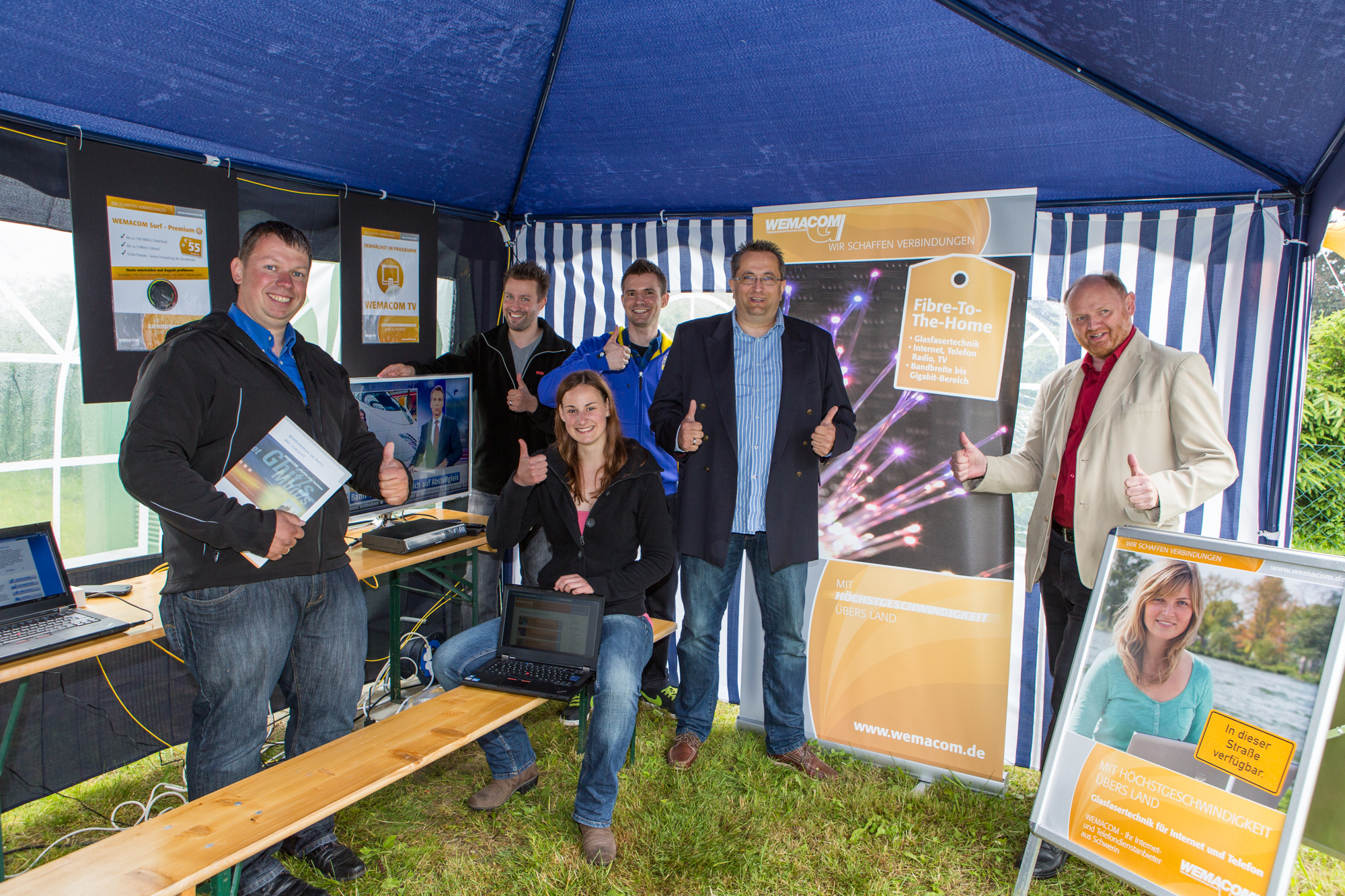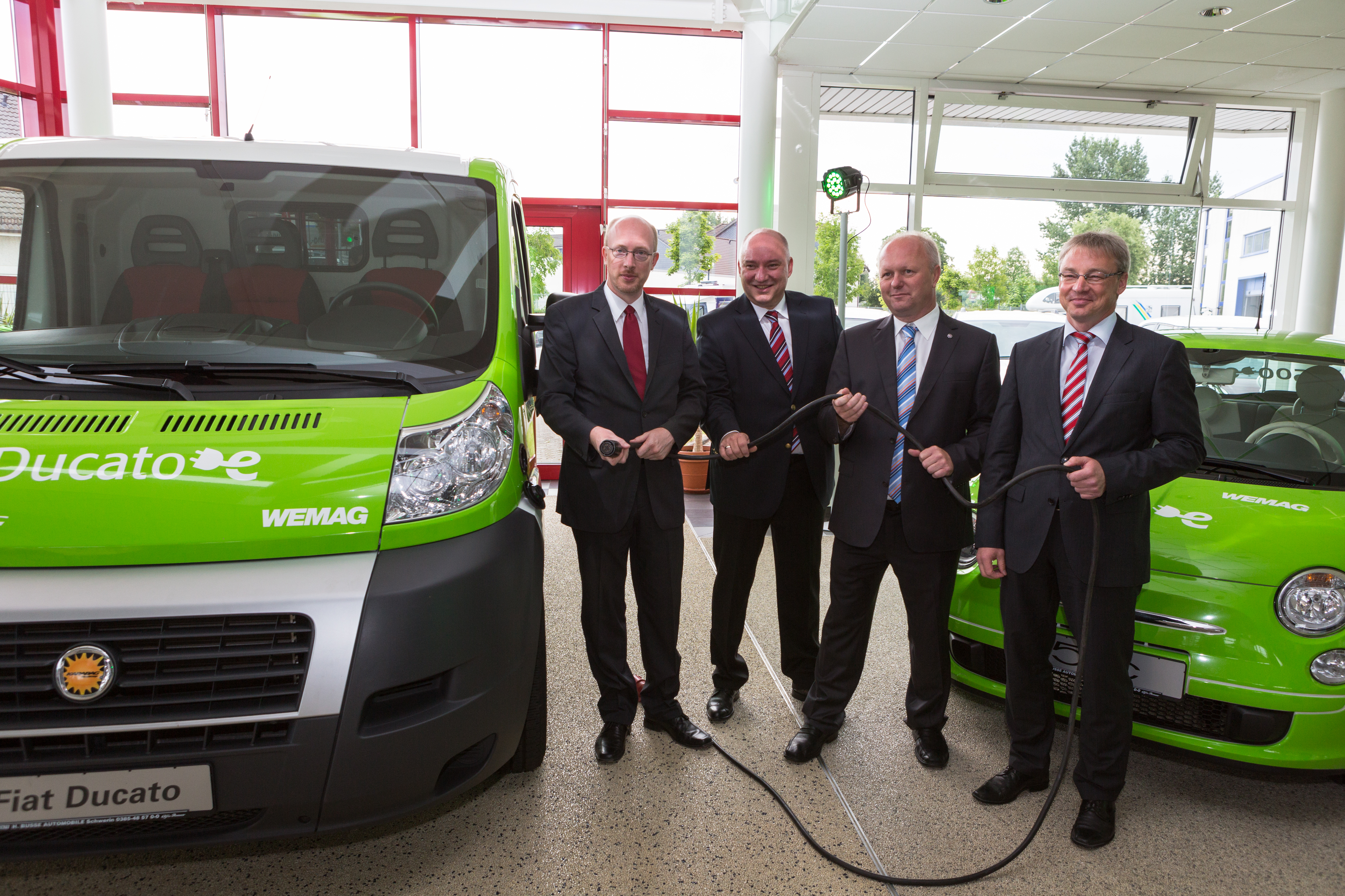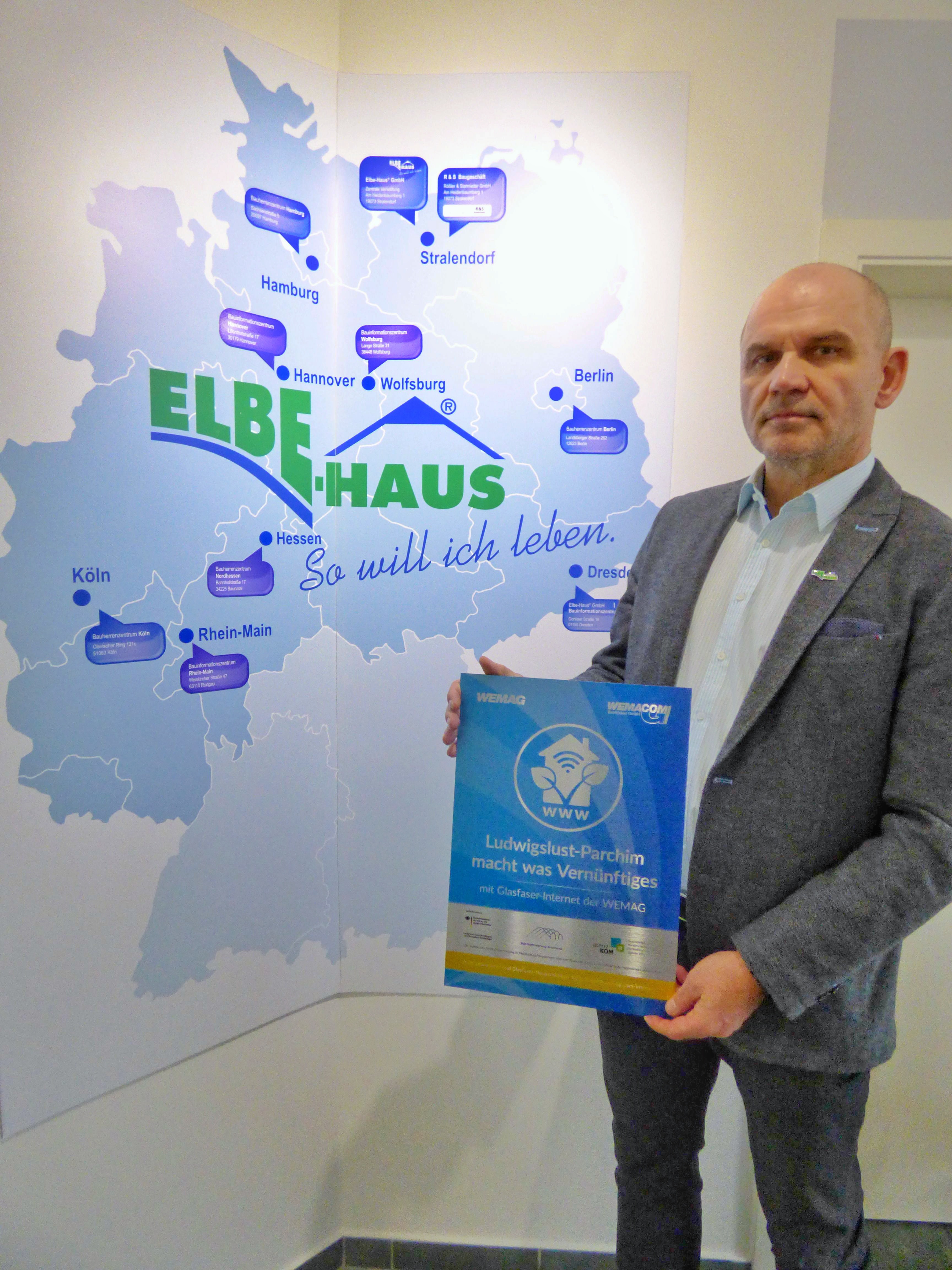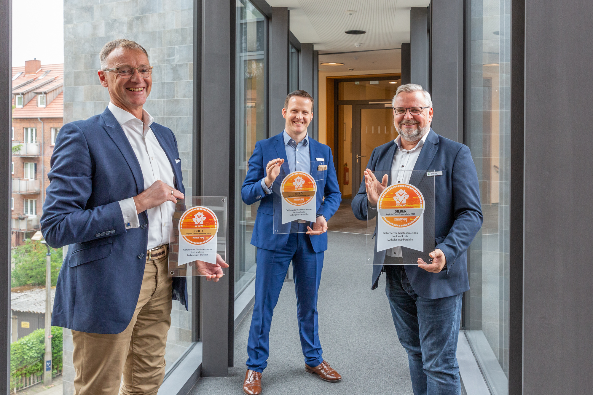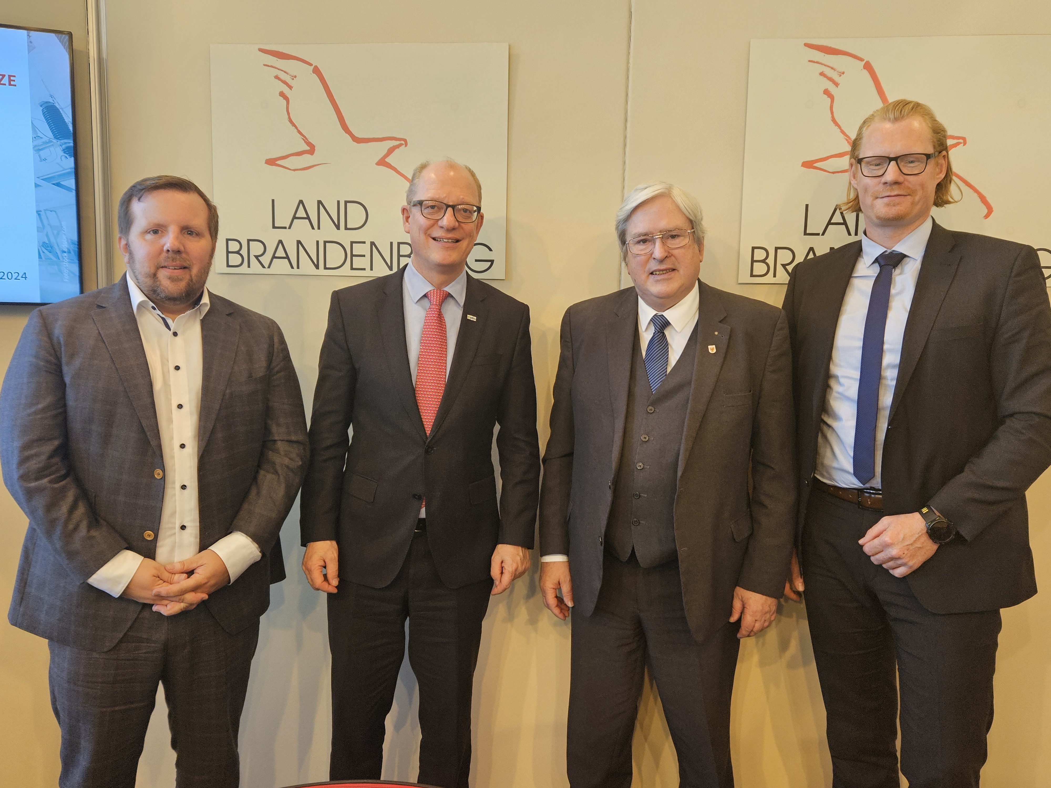 Kerstin Weiss, Landrätin des Landkreises Nordwestmecklenburg, Martin Retzlaff, kaufmännischer Programmleiter des Breitbandausbaus in der WEMAG-Unternehmensgruppe, Dr. Roland Finke, Leiter der Stabsstelle Wirtschaftsförderung, Regionalentwicklung und Planen, Michael Hillmann, Vertriebsleiter der WEMAG, Peter Schimanski, technischer Projektleiter des Breitbandausbaus in der WEMACOM (v.l.n.r.) beim Pressegespräch in Wismar. Foto: Landkreis Nordwestmecklenburg/ Eik Schäfer