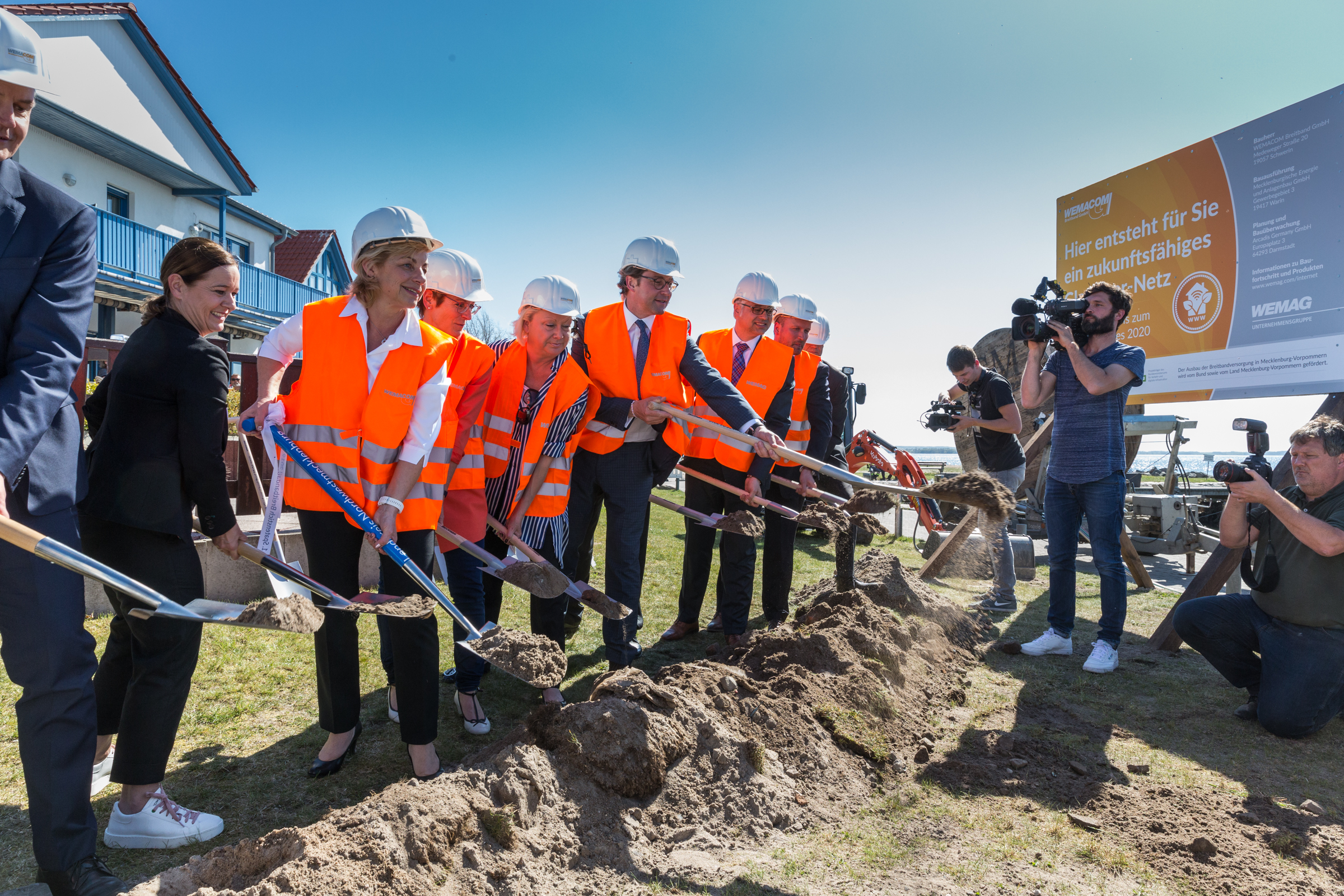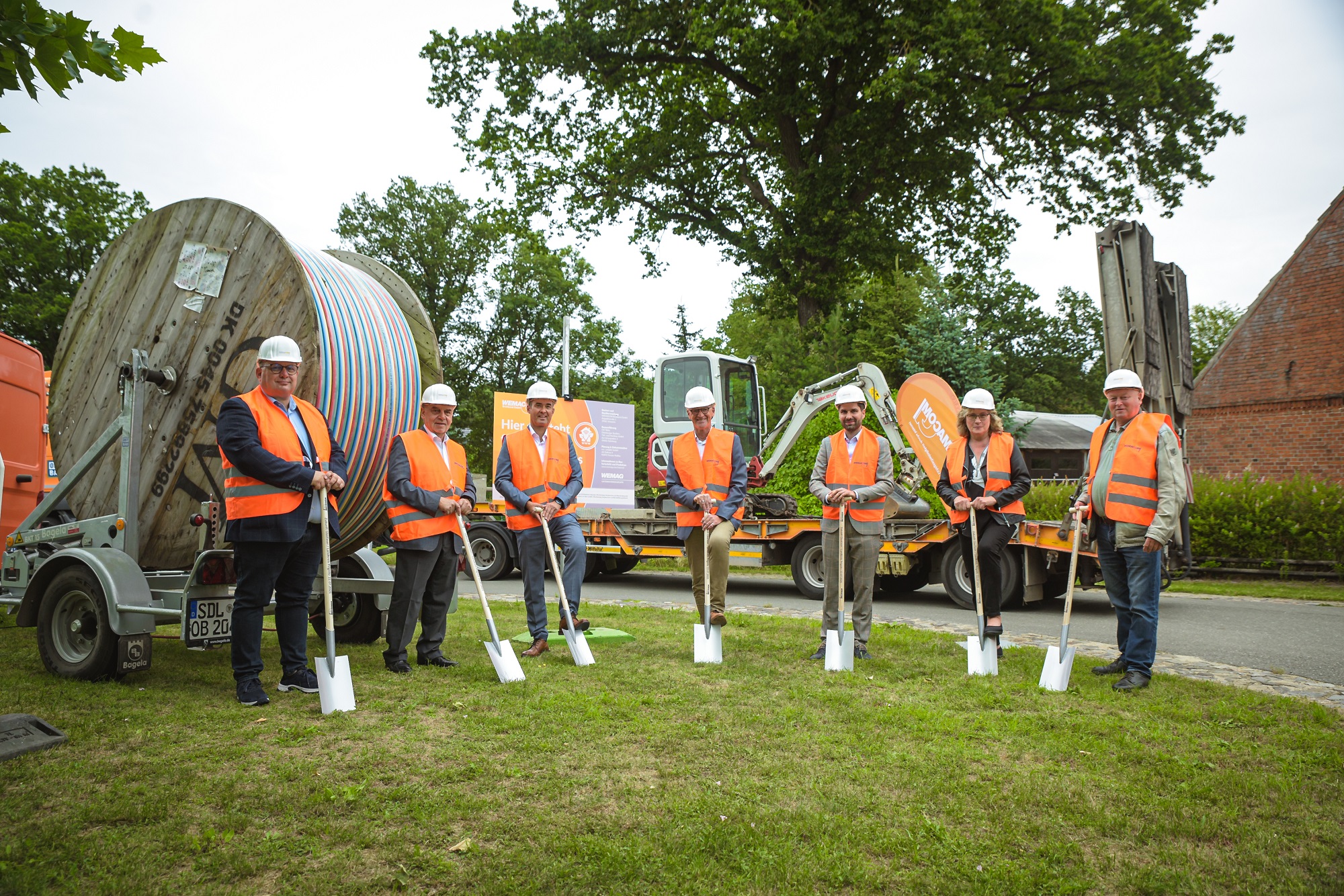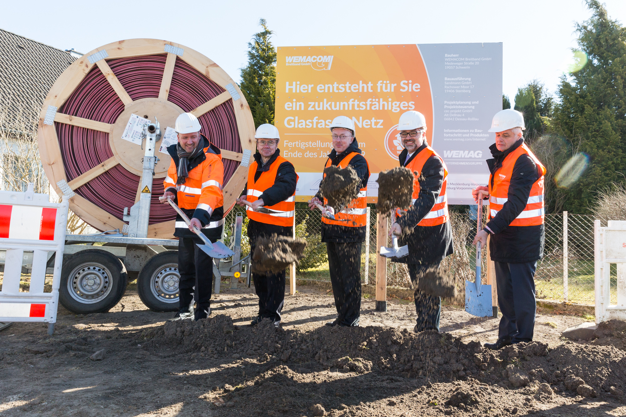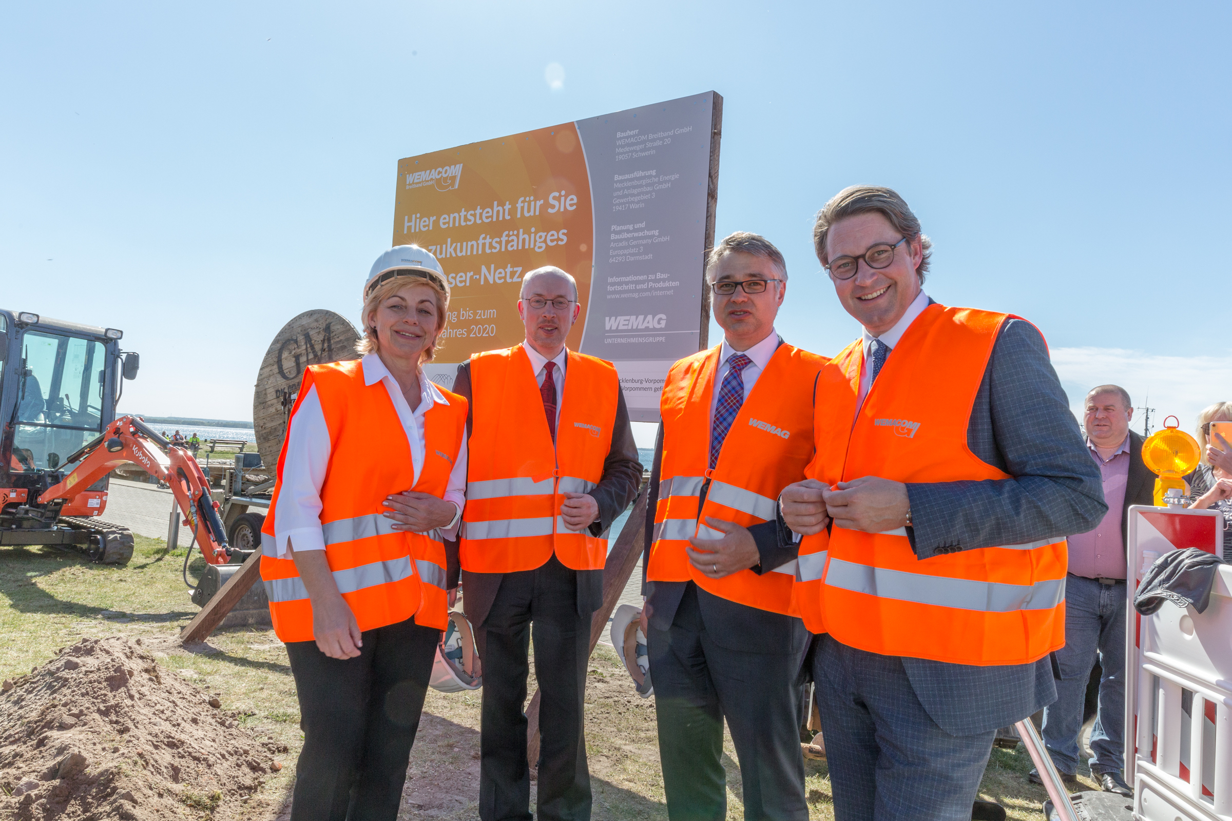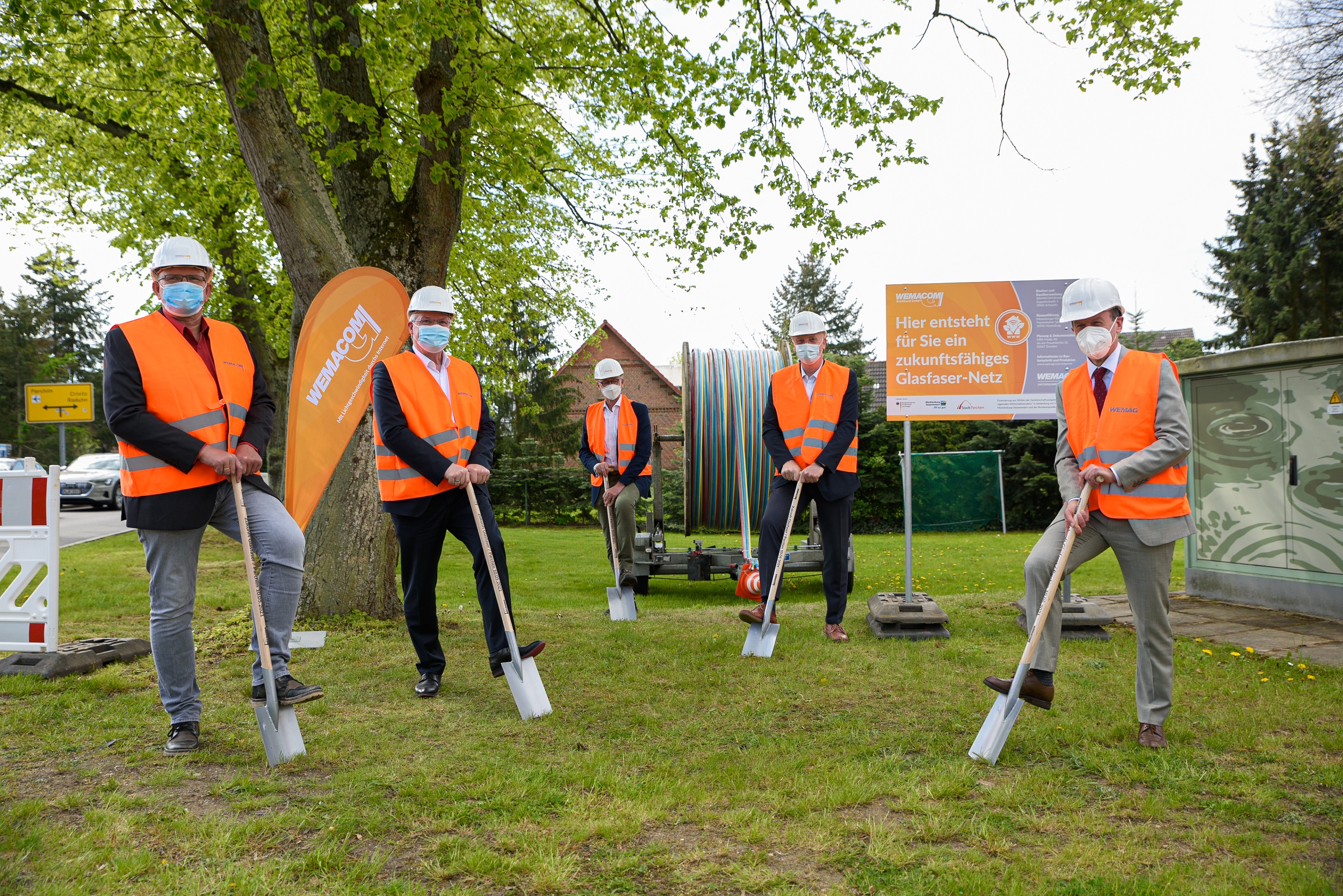 Martin Retzlaff, Geschäftsführer der WEMACOM Breitband GmbH, MdB Frank Junge, Christian Pegel, Minister für Energie, Infrastruktur und Digitalisierung, WEMAG-Vorstand Thomas Murche und Wolfgang Schmülling, 1. Stellvertreter des Landrates des Landkreises Ludwigslust-Parchim (v.l.), haben in Neuburg, Gemeinde Siggelkow, den symbolischen Spatenstich für den Breitbandausbau durchgeführt / Foto: WEMAG/Stephan Rudolph-Kramer