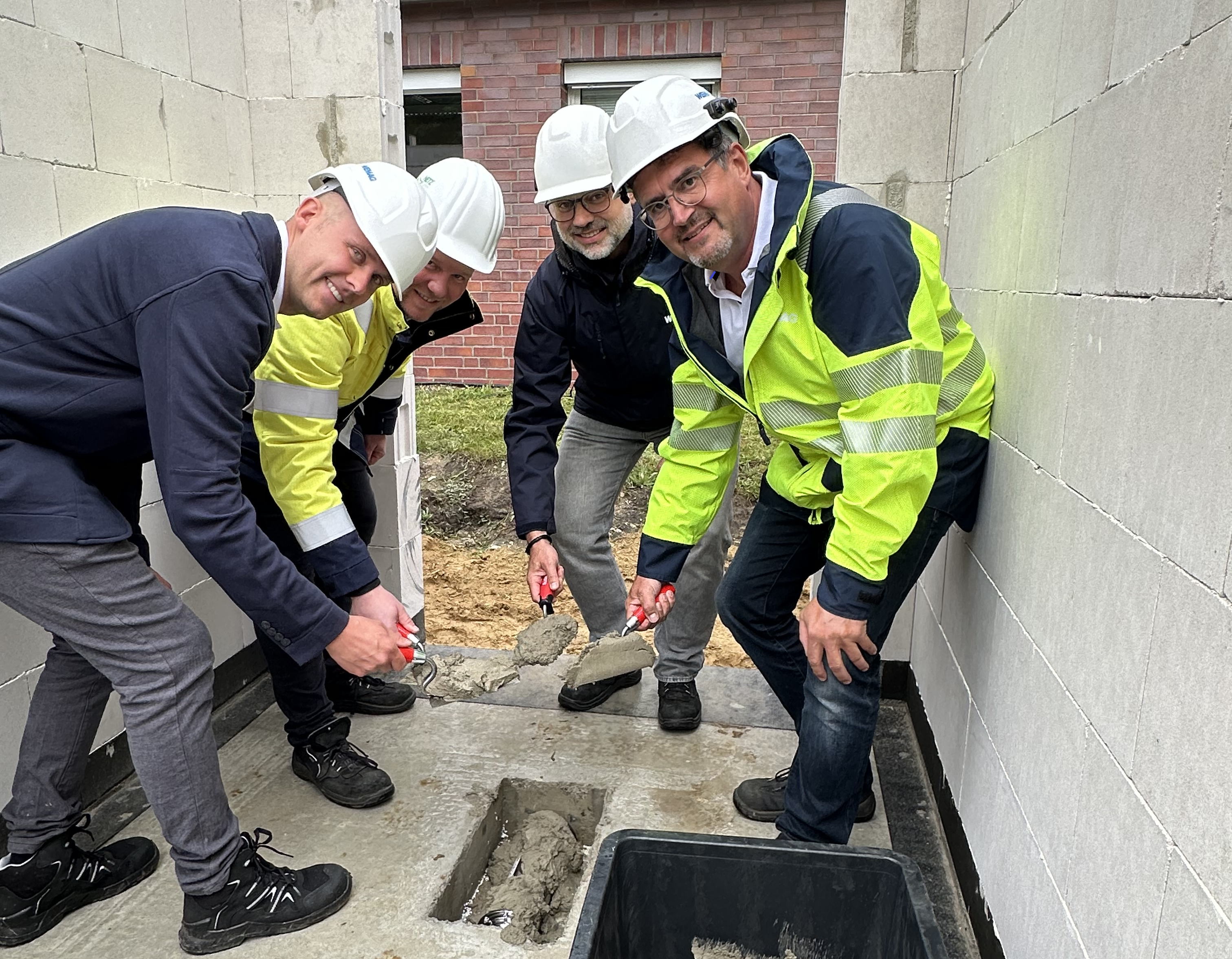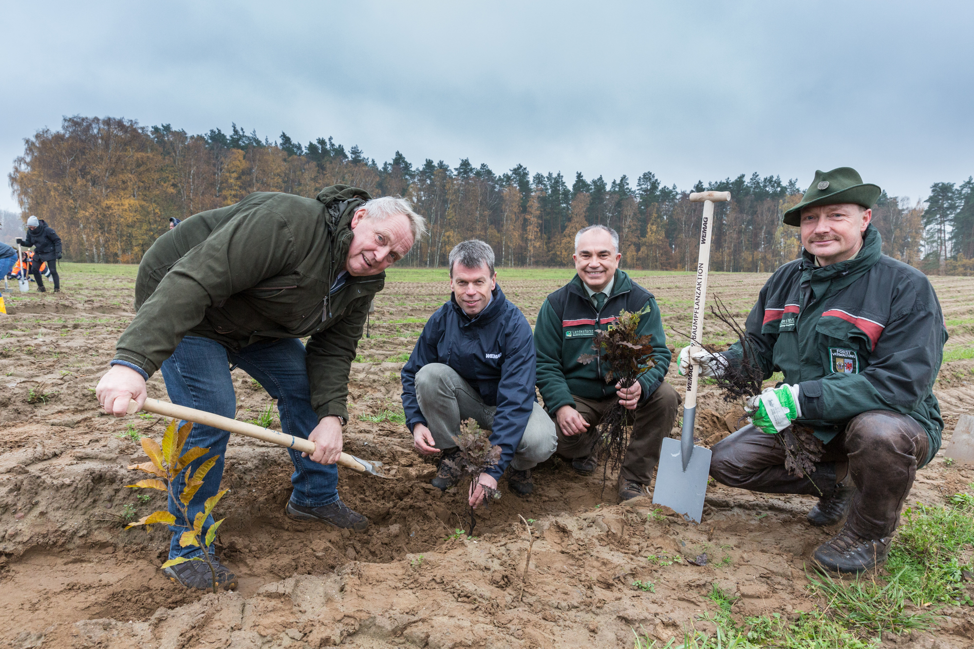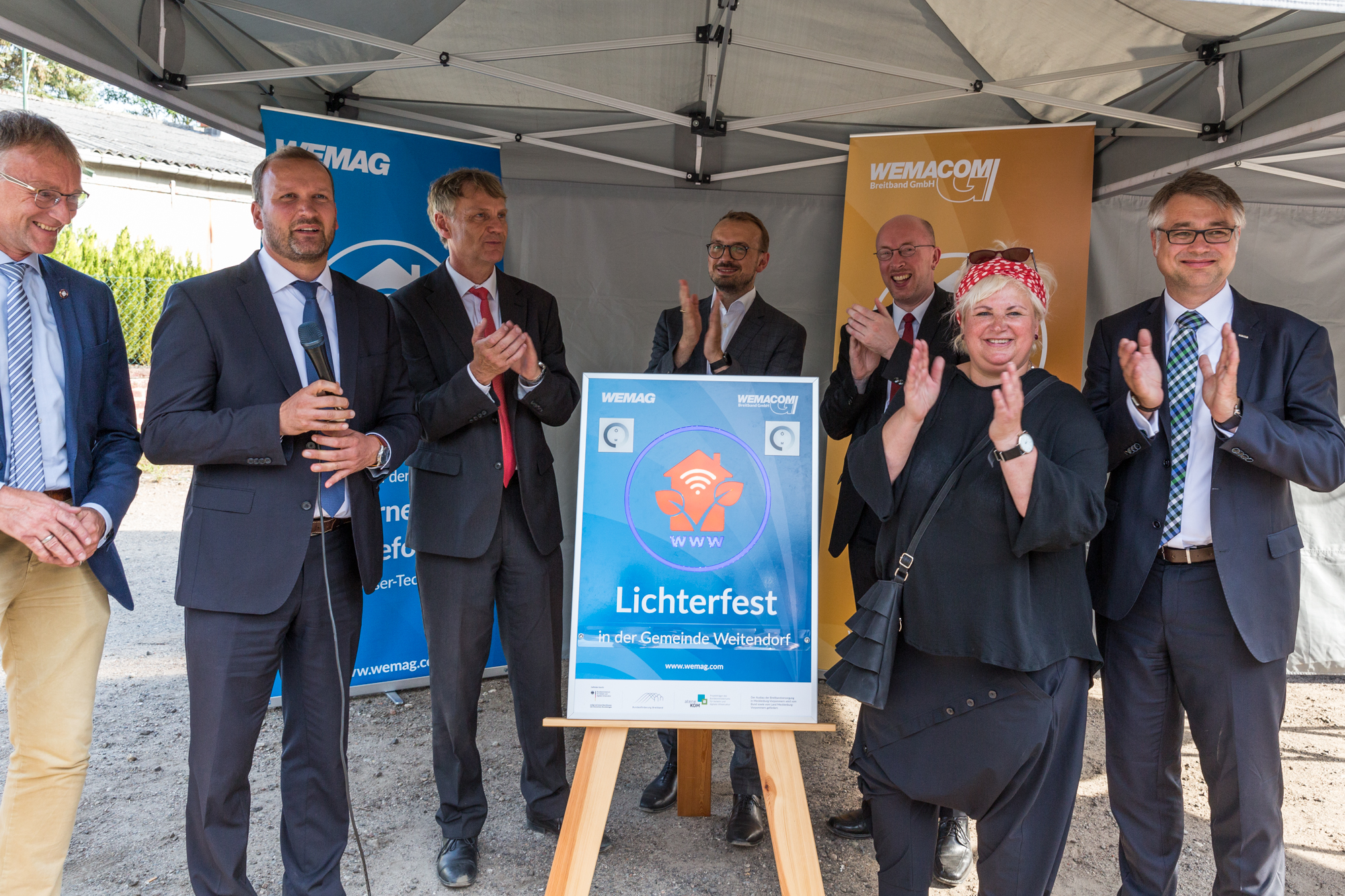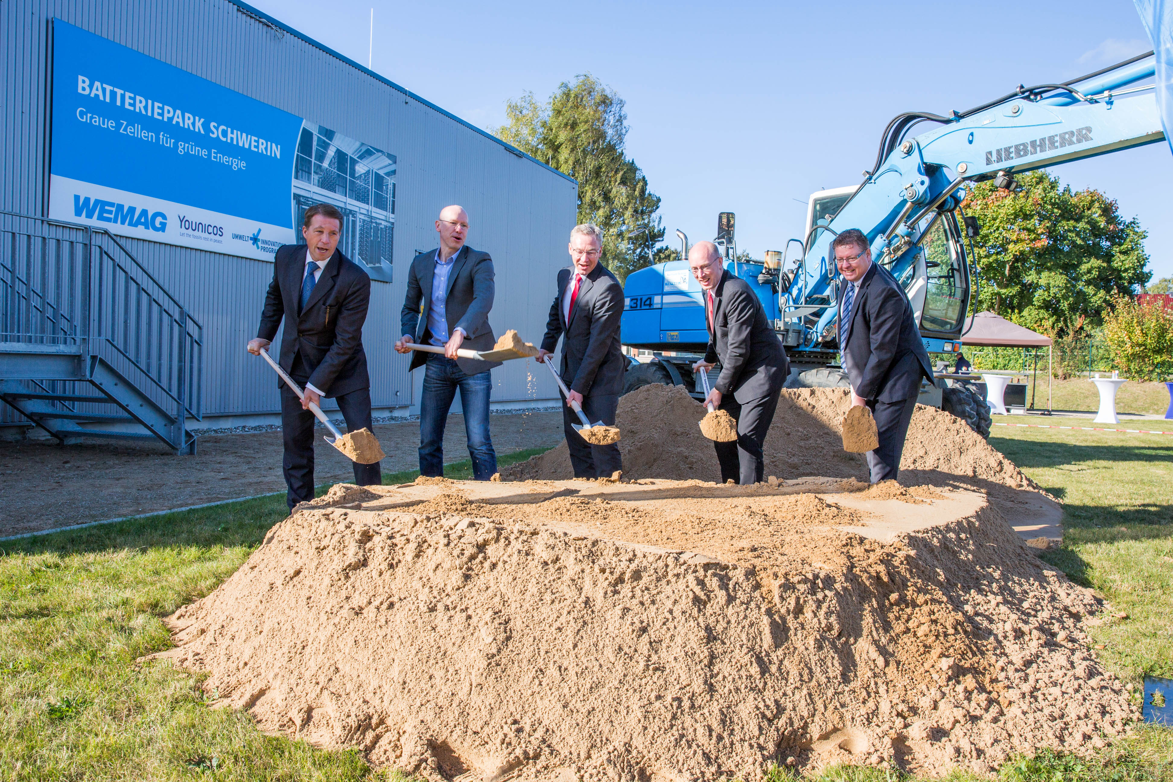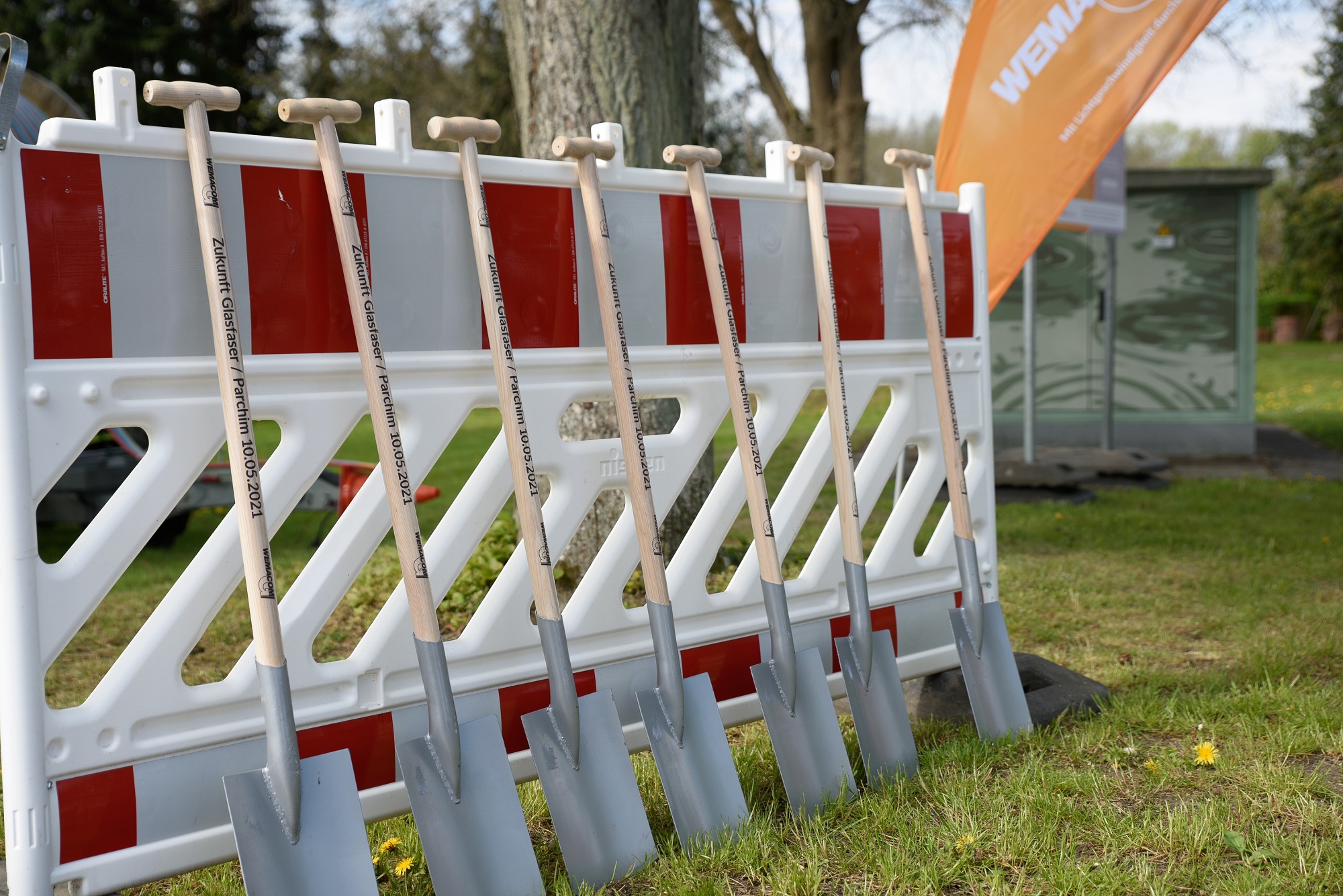 Martin Retzlaff, Geschäftsführer der WEMACOM Breitband GmbH, MdB Frank Junge, Christian Pegel, Minister für Energie, Infrastruktur und Digitalisierung, WEMAG-Vorstand Thomas Murche und Wolfgang Schmülling, 1. Stellvertreter des Landrates des Landkreises Ludwigslust-Parchim (v.l.), haben in Neuburg, Gemeinde Siggelkow, den symbolischen Spatenstich für den Breitbandausbau durchgeführt / Foto: WEMAG/Stephan Rudolph-Kramer