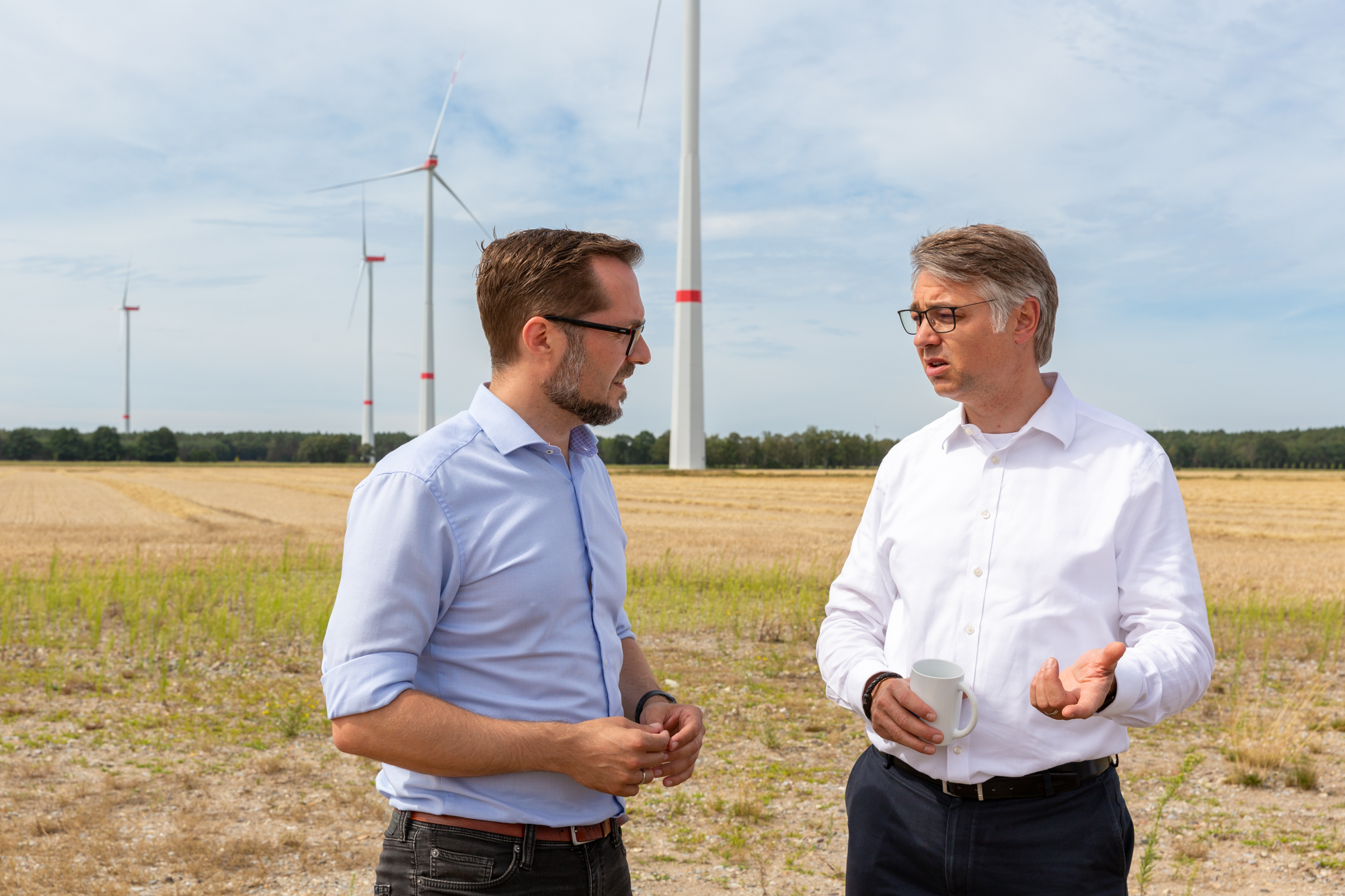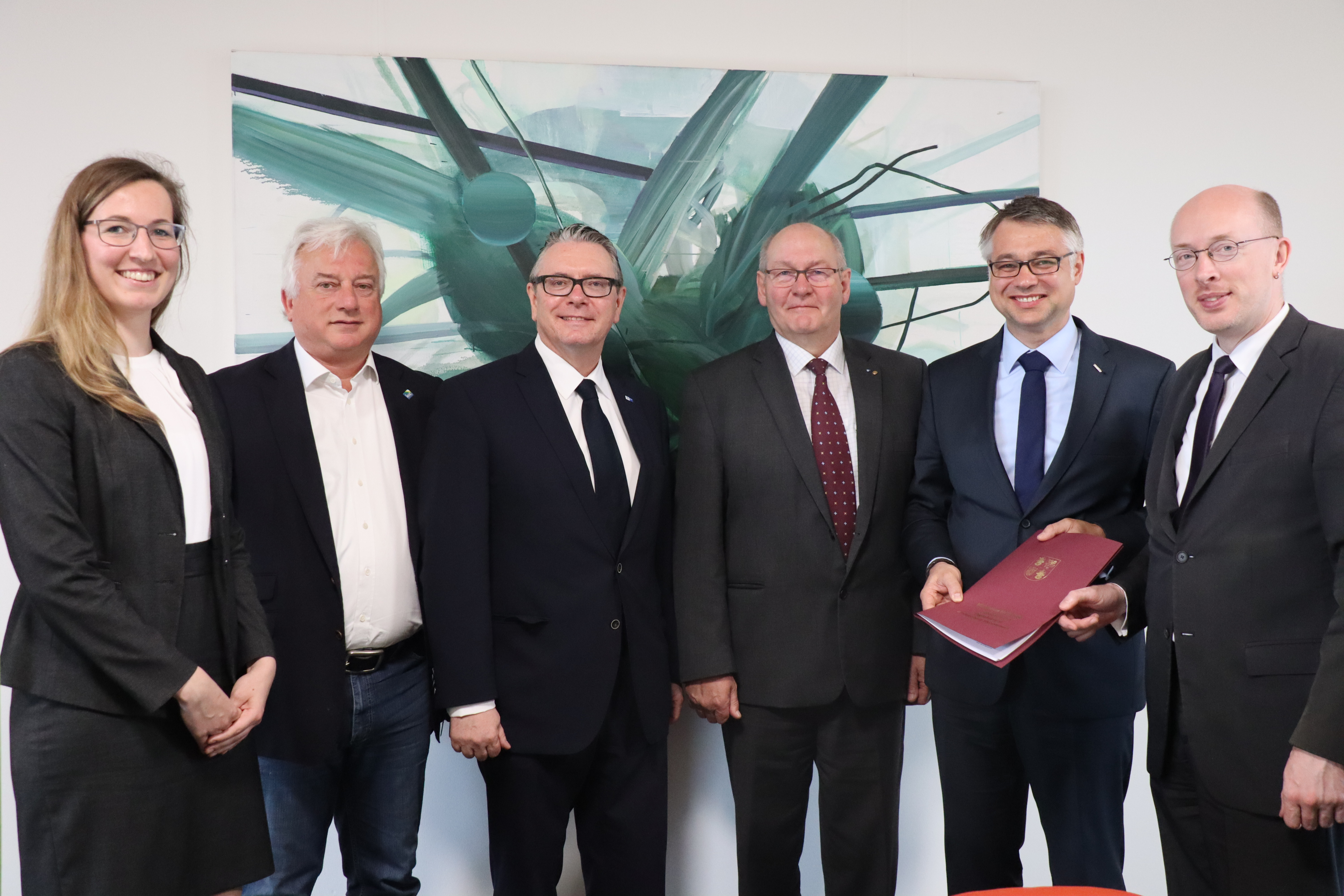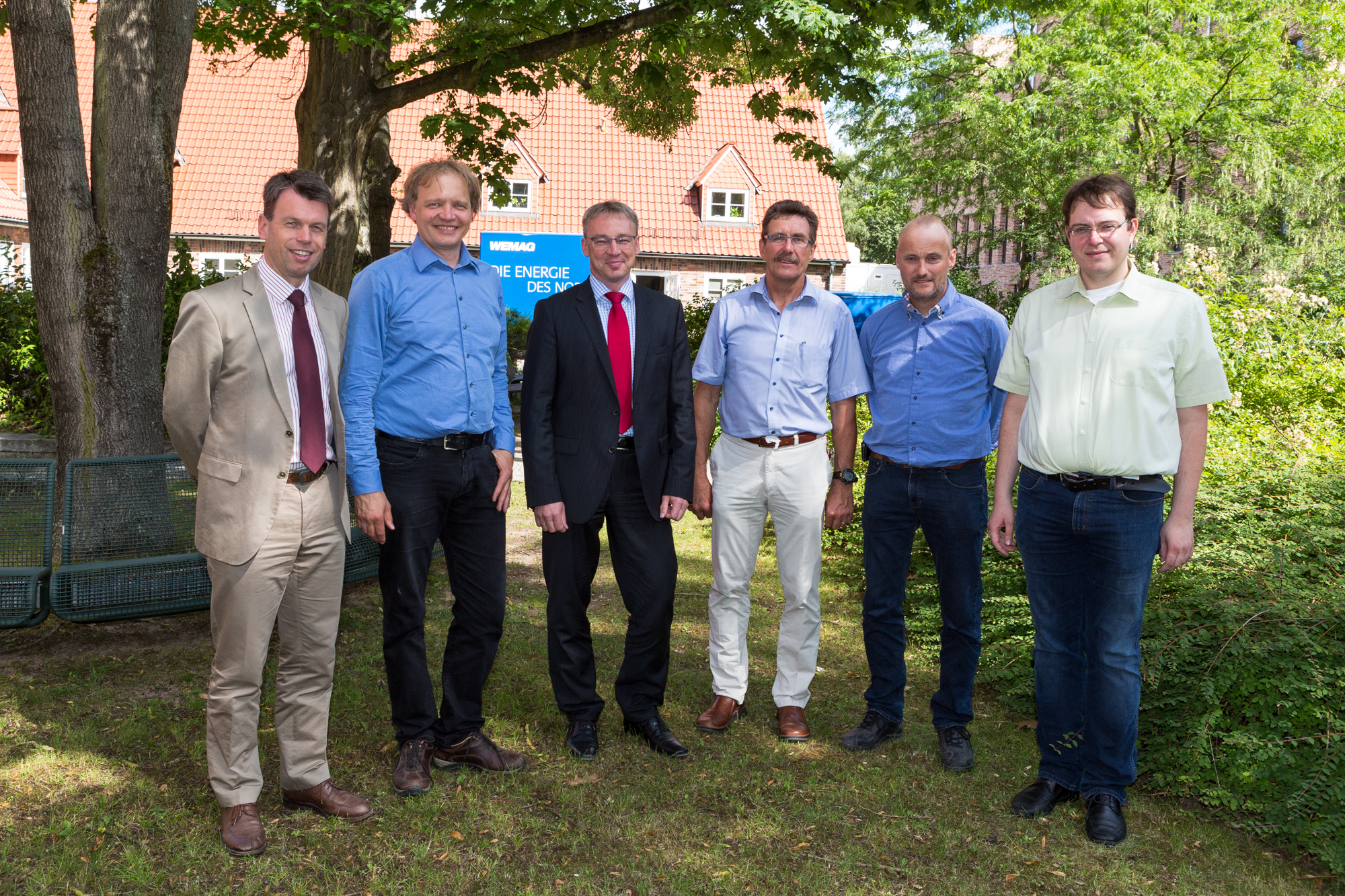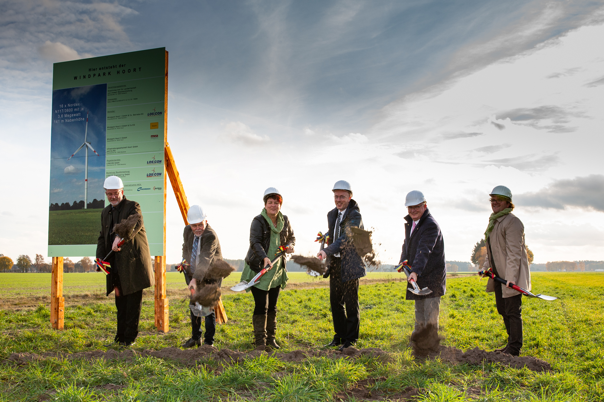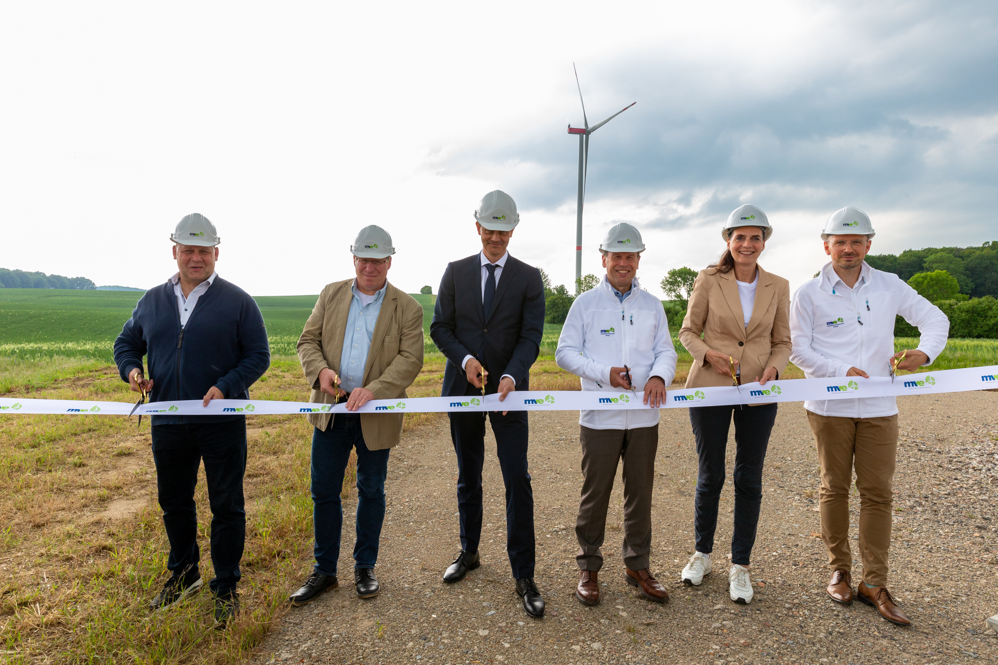 Eröffnen gemeinsam den Windpark Rieps (v. l.): Torsten Hinrichs, Geschäftsführer der mea und der mve, Dirk Fröhling, Bürgermeister der Gemeinde Rieps, Dr. Roland Ilper, Geschäftsführer der Energieverbund Nord und der mve, Caspar Baumgart, Vorstand der WEMAG, Ines Jesse, Staatssekretärin im Ministerium für Wirtschaft, Infrastruktur, Tourismus und Arbeit Mecklenburg-Vorpommern, und Stephan Sternberg, Aufsichtsrat Energieverbund Nord und Landrat des Landkreises Ludwigslust-Parchim.