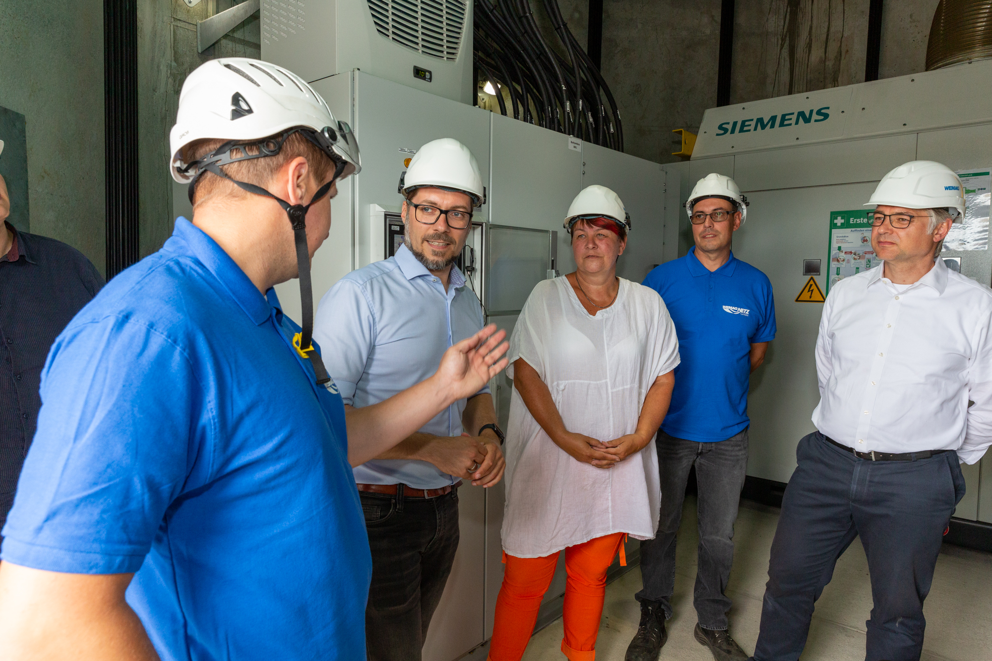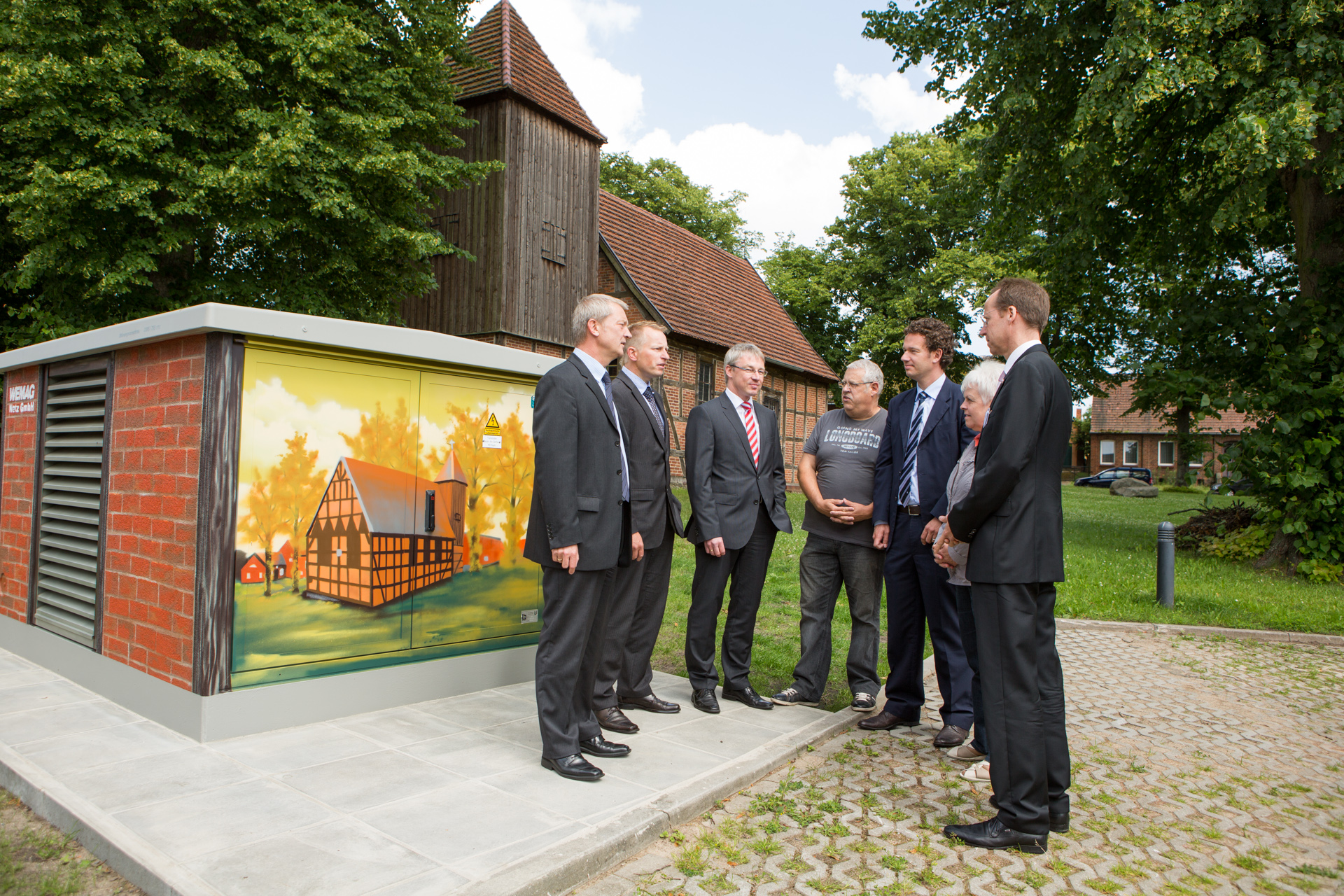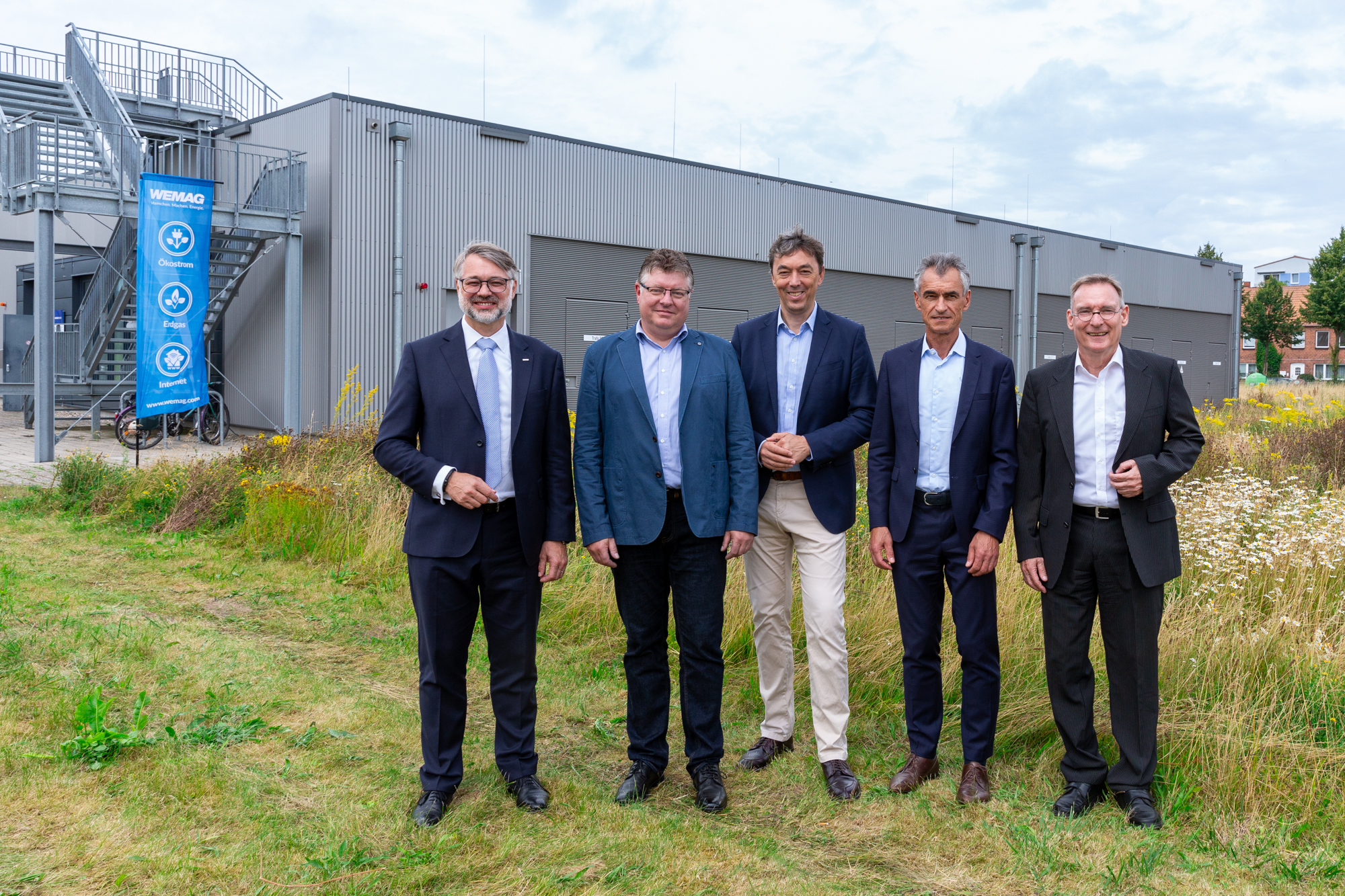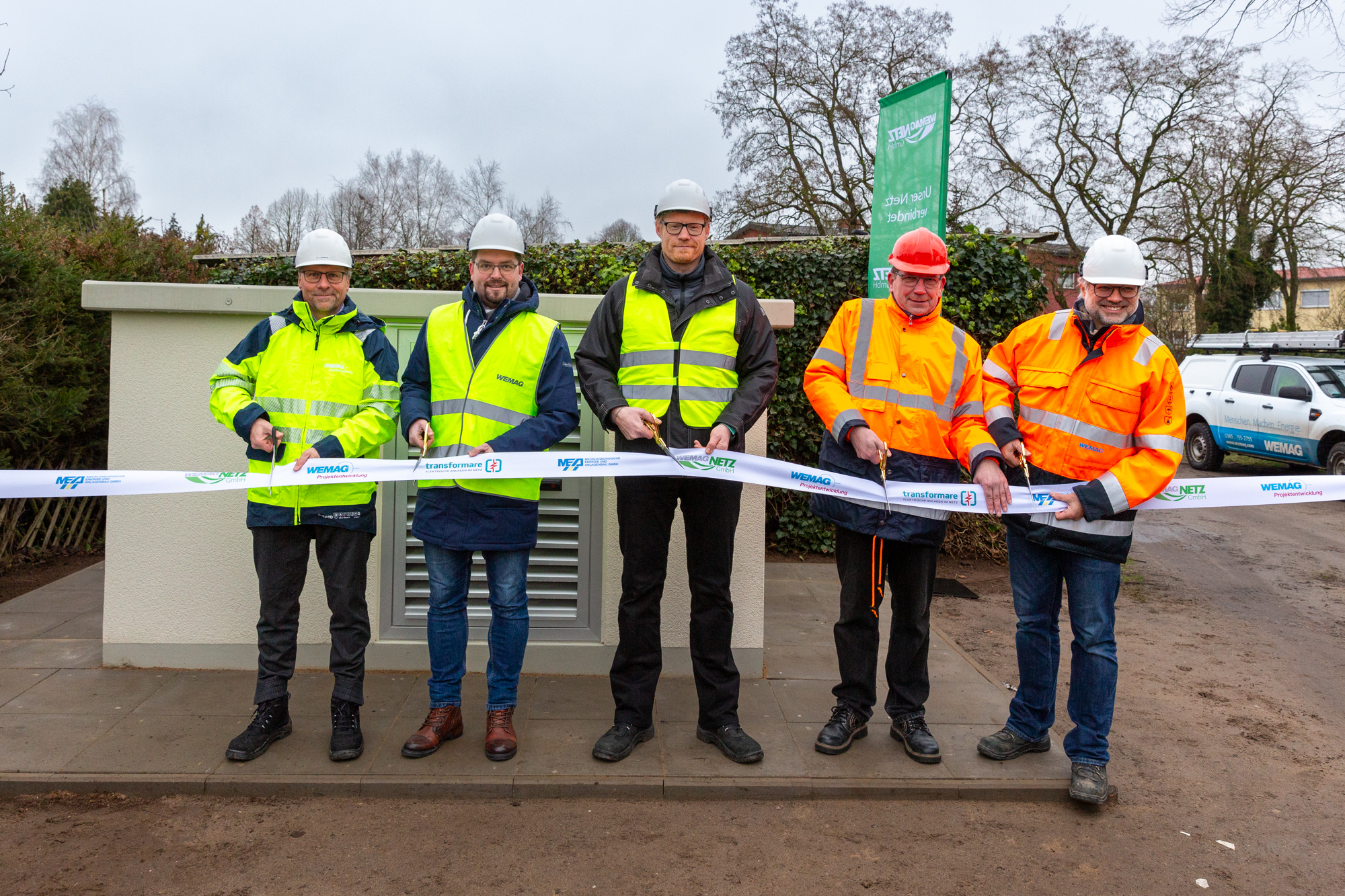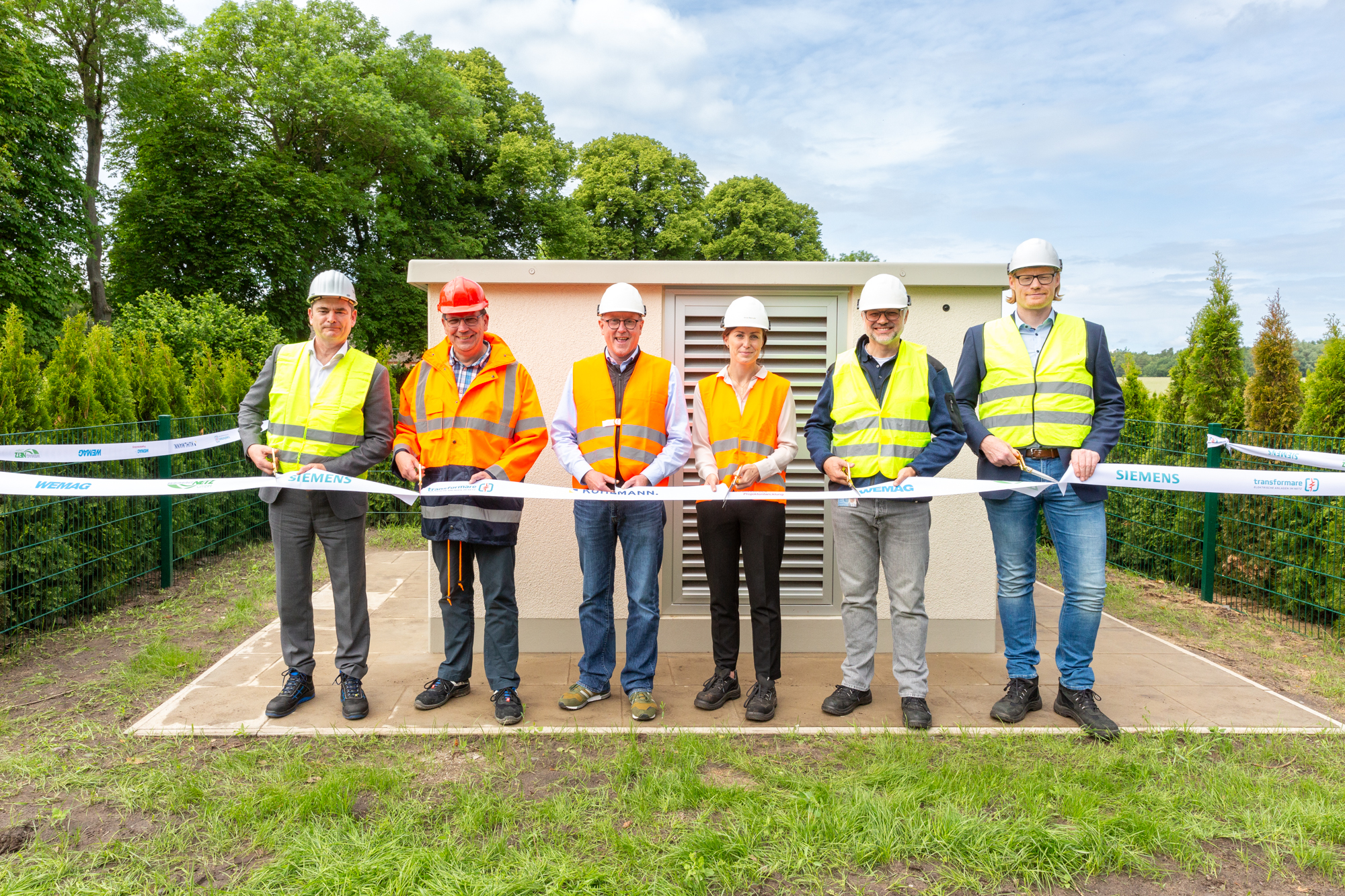 Offizielle Inbetriebnahme der Schaltstation in Kirch Jesar (v. l.): Frank Haacker, Siemens-Niederlassung Rostock, Christian Winkelmann, Transformare GmbH Wittenberge, Bernd Alvermann, Kuhlmann Leitungsbau GmbH, Anne Reimuck, WEMAG Projektentwicklung GmbH, Thomas Murche, WEMAG-Vorstand, Tim Stieger, WEMAG Netz GmbH. / Foto: WEMAG/Stephan Rudolph-Kramer