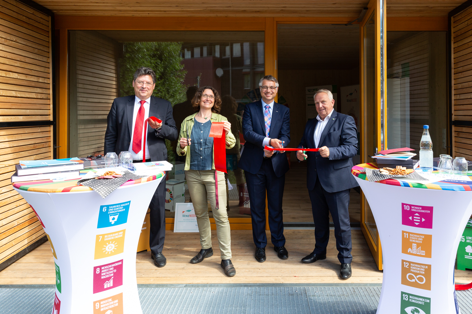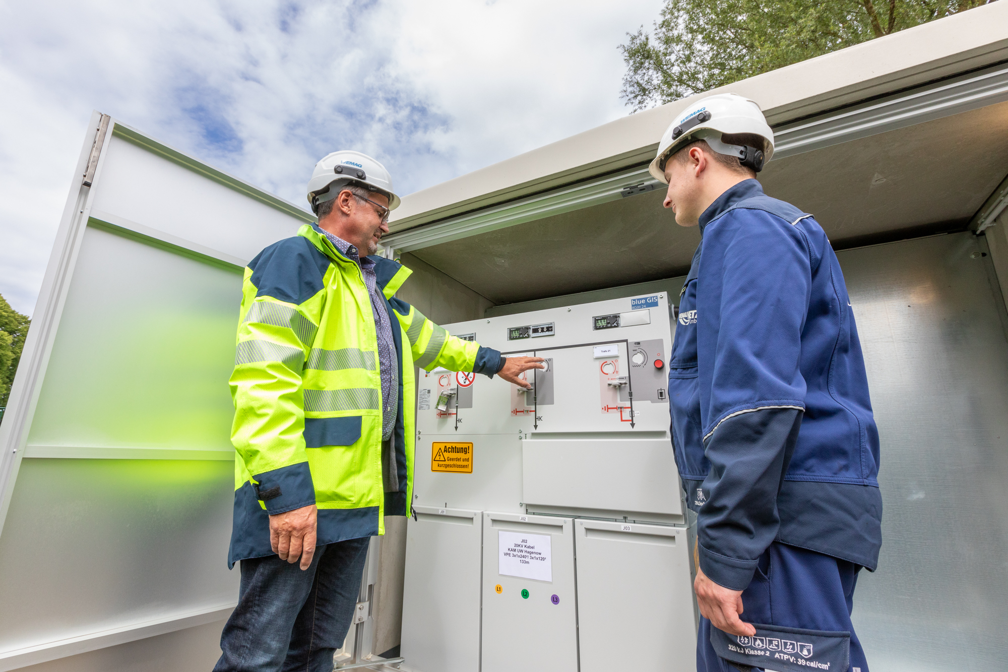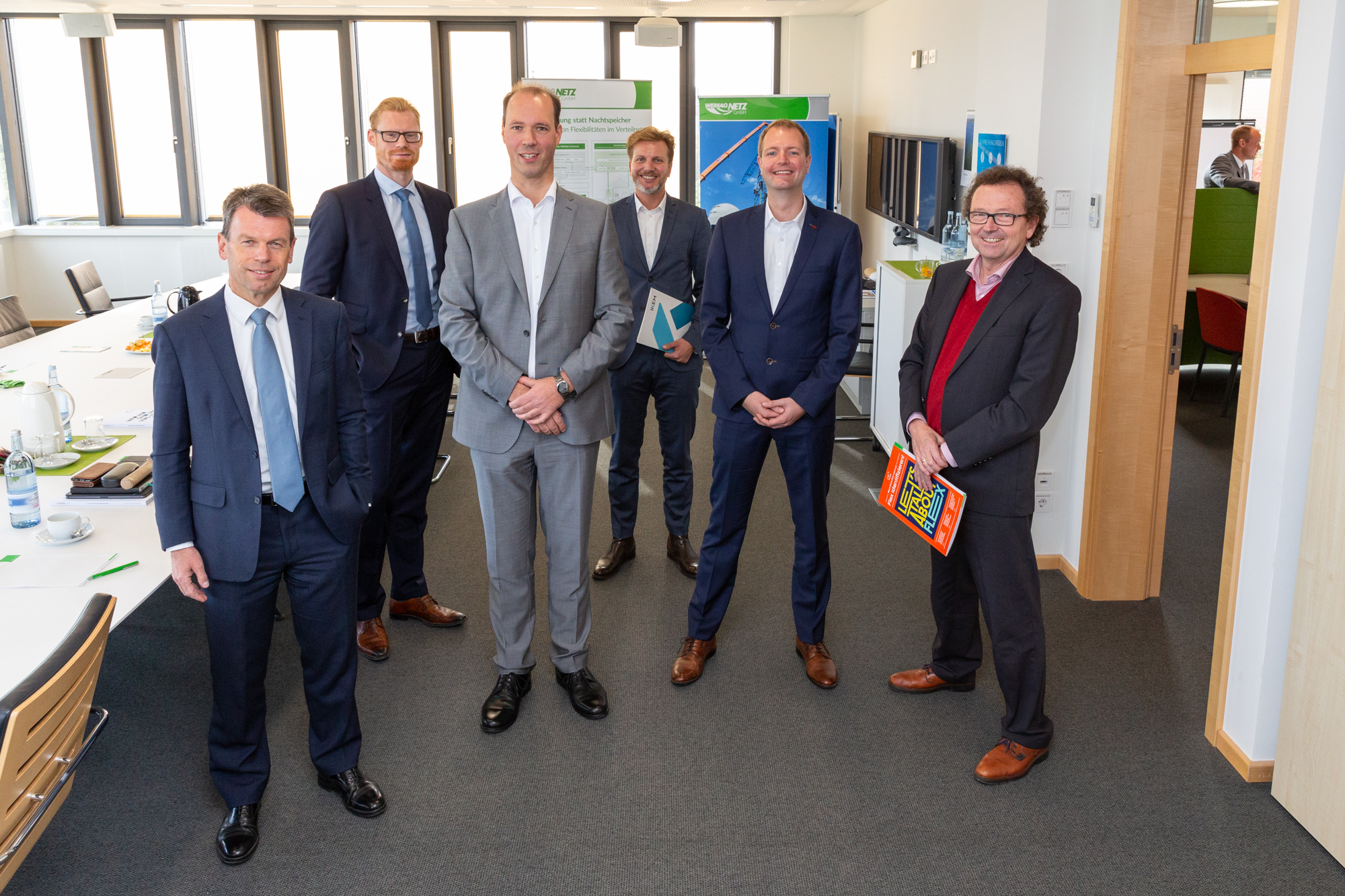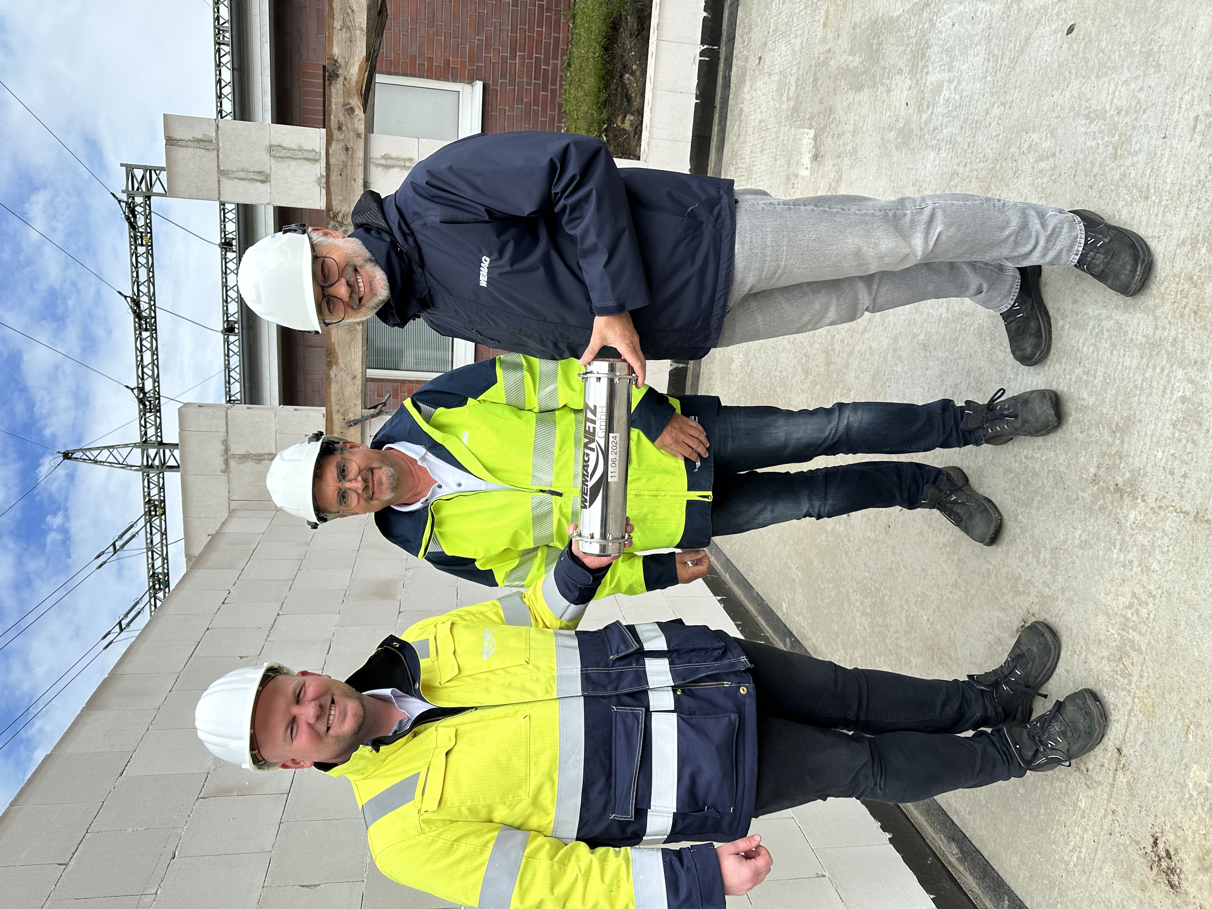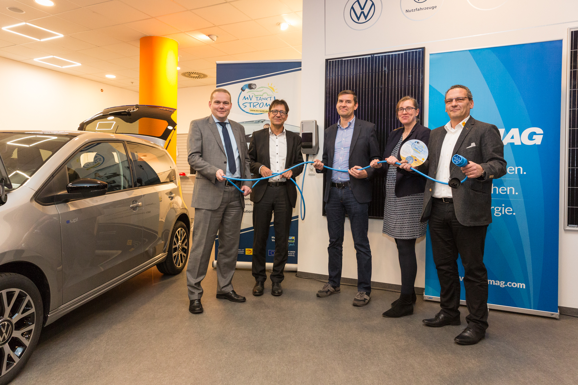 Offizielle Inbetriebnahme der Schaltstation in Kirch Jesar (v. l.): Frank Haacker, Siemens-Niederlassung Rostock, Christian Winkelmann, Transformare GmbH Wittenberge, Bernd Alvermann, Kuhlmann Leitungsbau GmbH, Anne Reimuck, WEMAG Projektentwicklung GmbH, Thomas Murche, WEMAG-Vorstand, Tim Stieger, WEMAG Netz GmbH. / Foto: WEMAG/Stephan Rudolph-Kramer