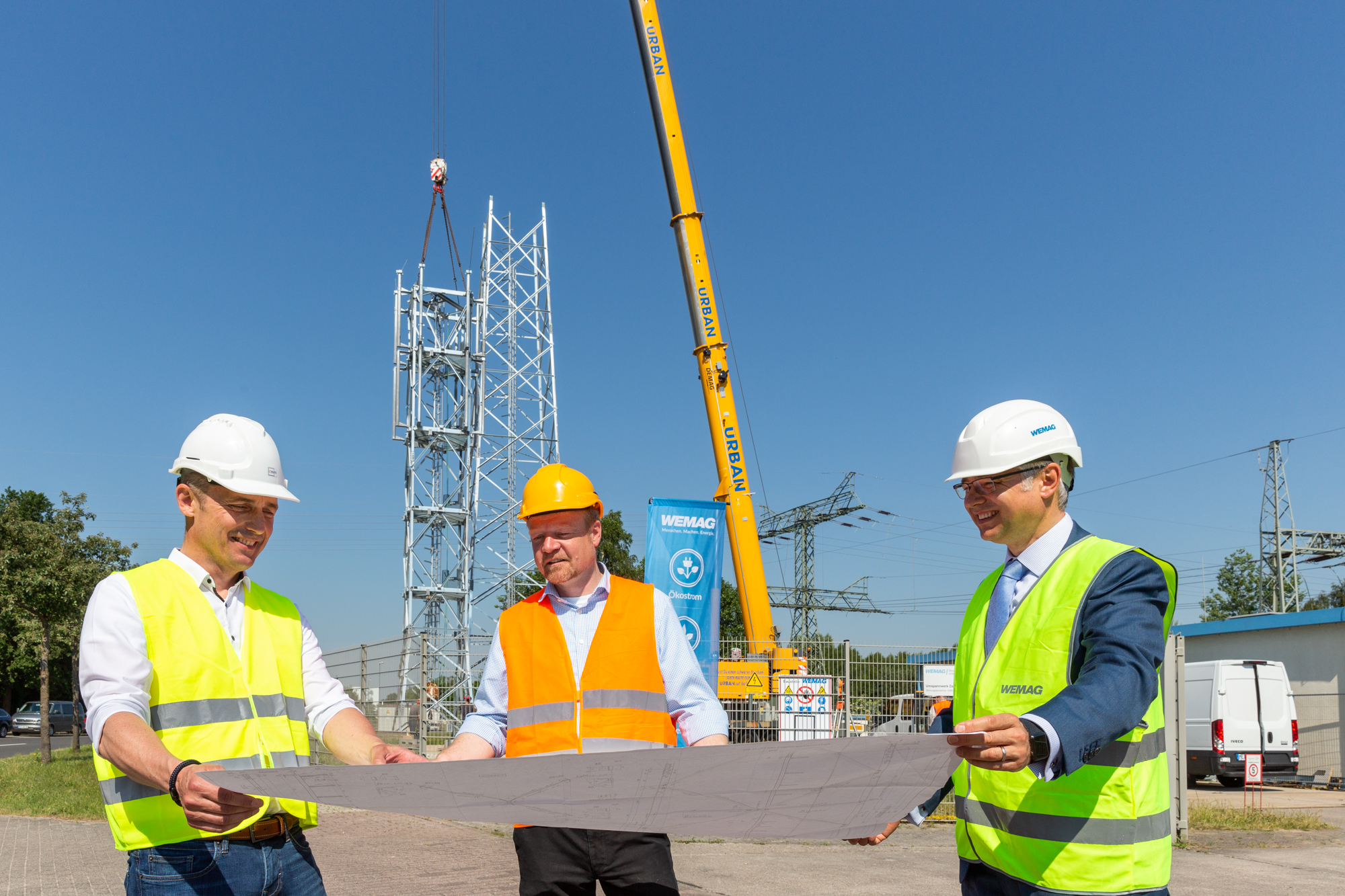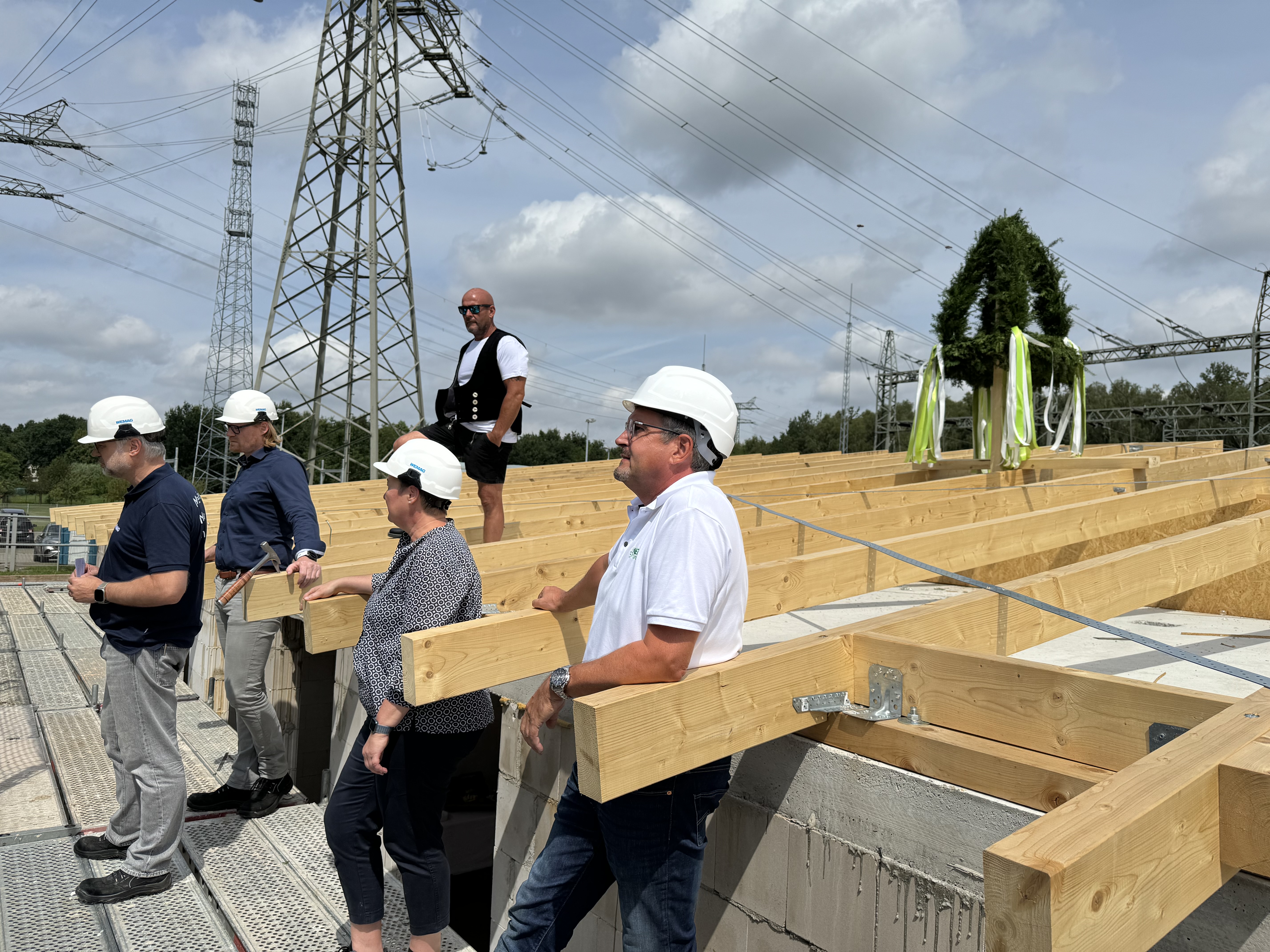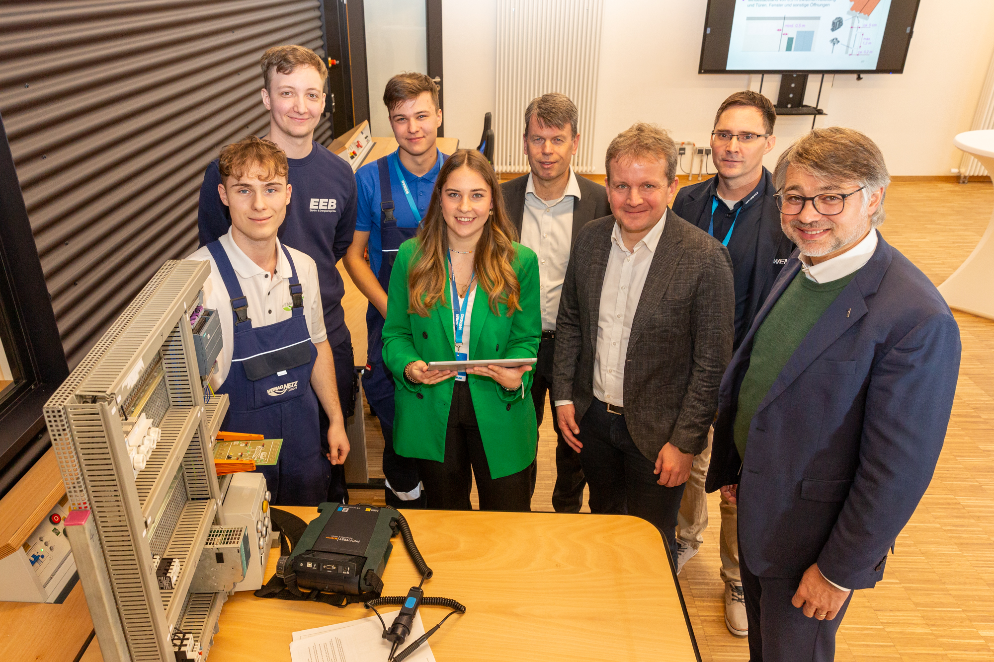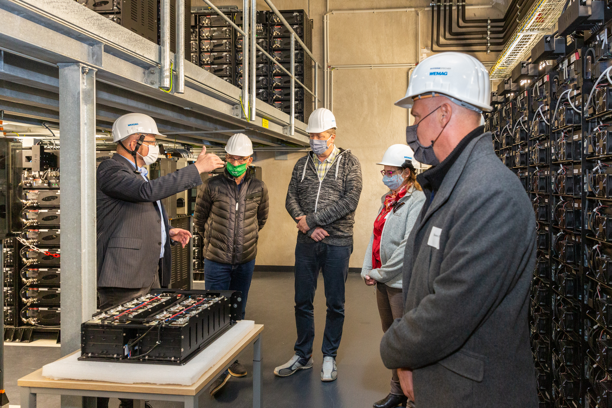 Offizielle Inbetriebnahme der Schaltstation in Kirch Jesar (v. l.): Frank Haacker, Siemens-Niederlassung Rostock, Christian Winkelmann, Transformare GmbH Wittenberge, Bernd Alvermann, Kuhlmann Leitungsbau GmbH, Anne Reimuck, WEMAG Projektentwicklung GmbH, Thomas Murche, WEMAG-Vorstand, Tim Stieger, WEMAG Netz GmbH. / Foto: WEMAG/Stephan Rudolph-Kramer