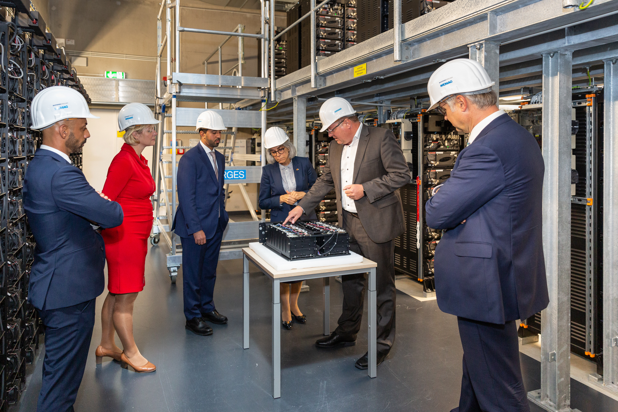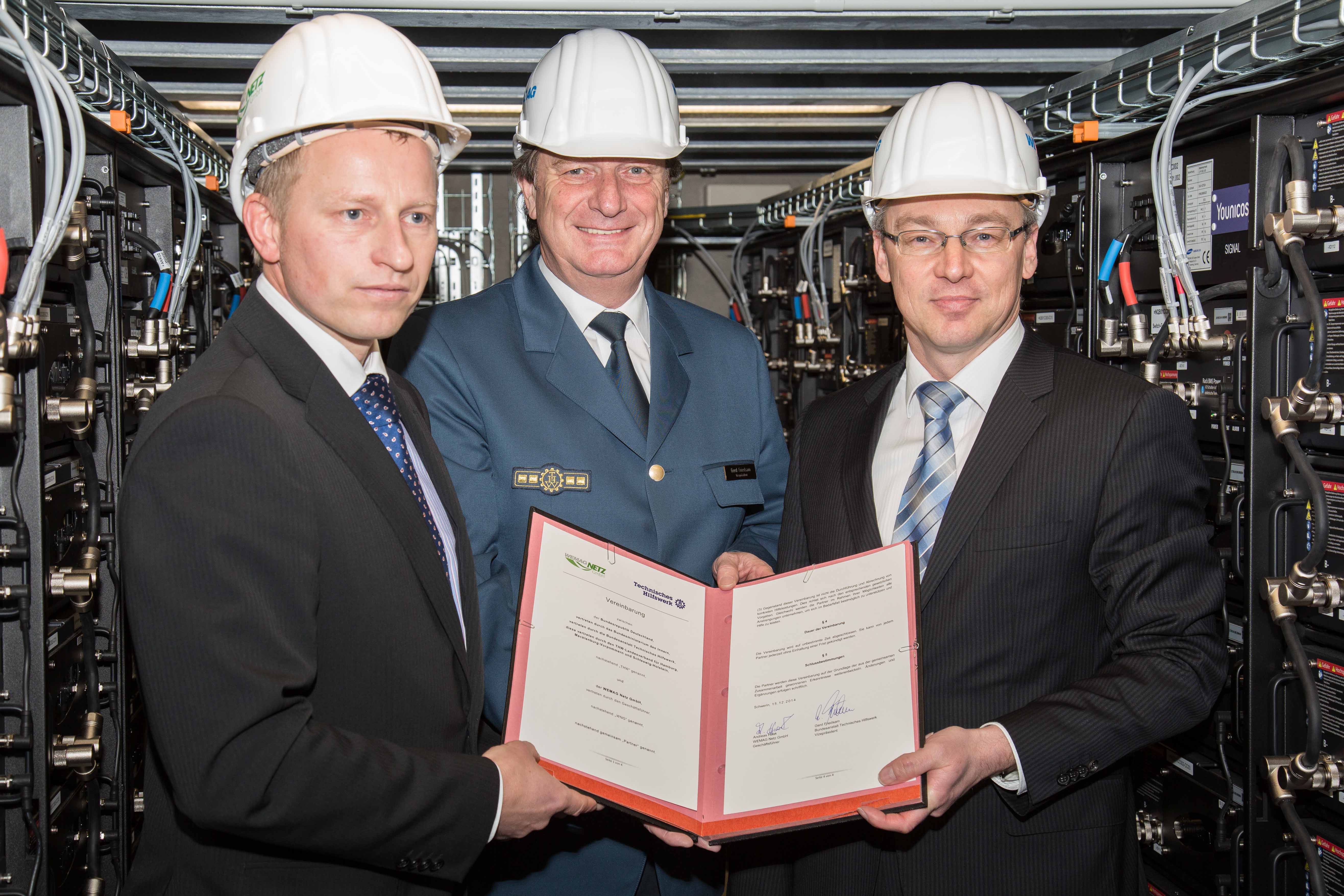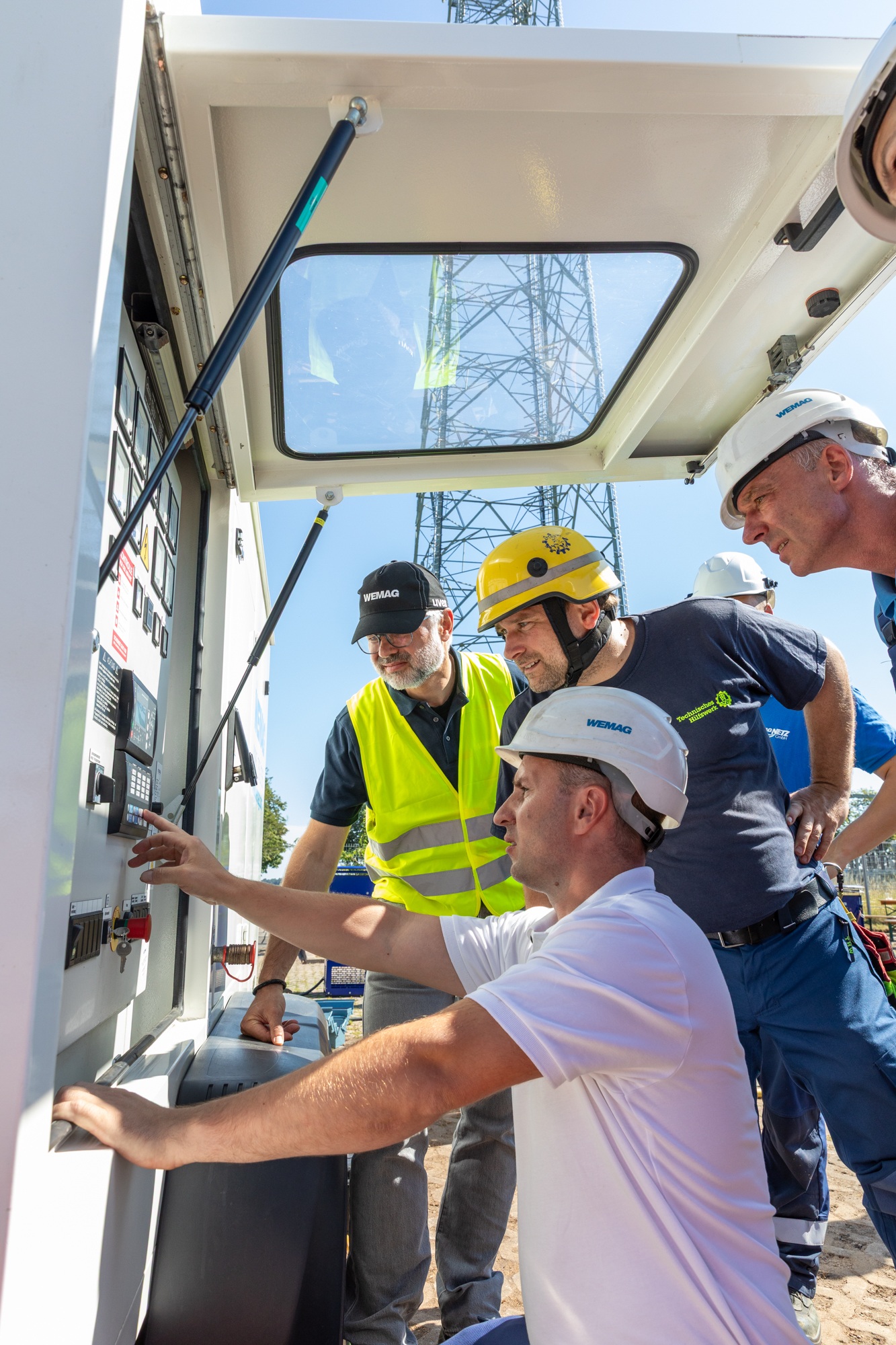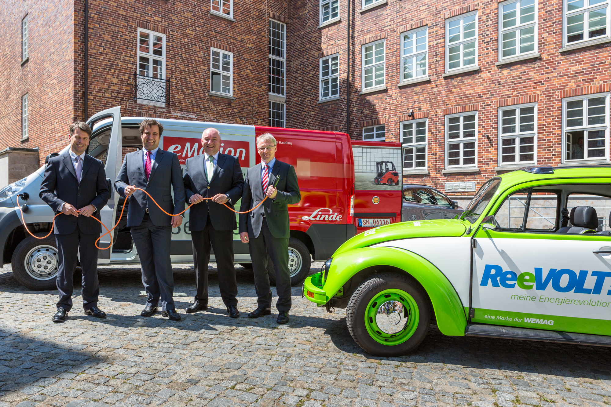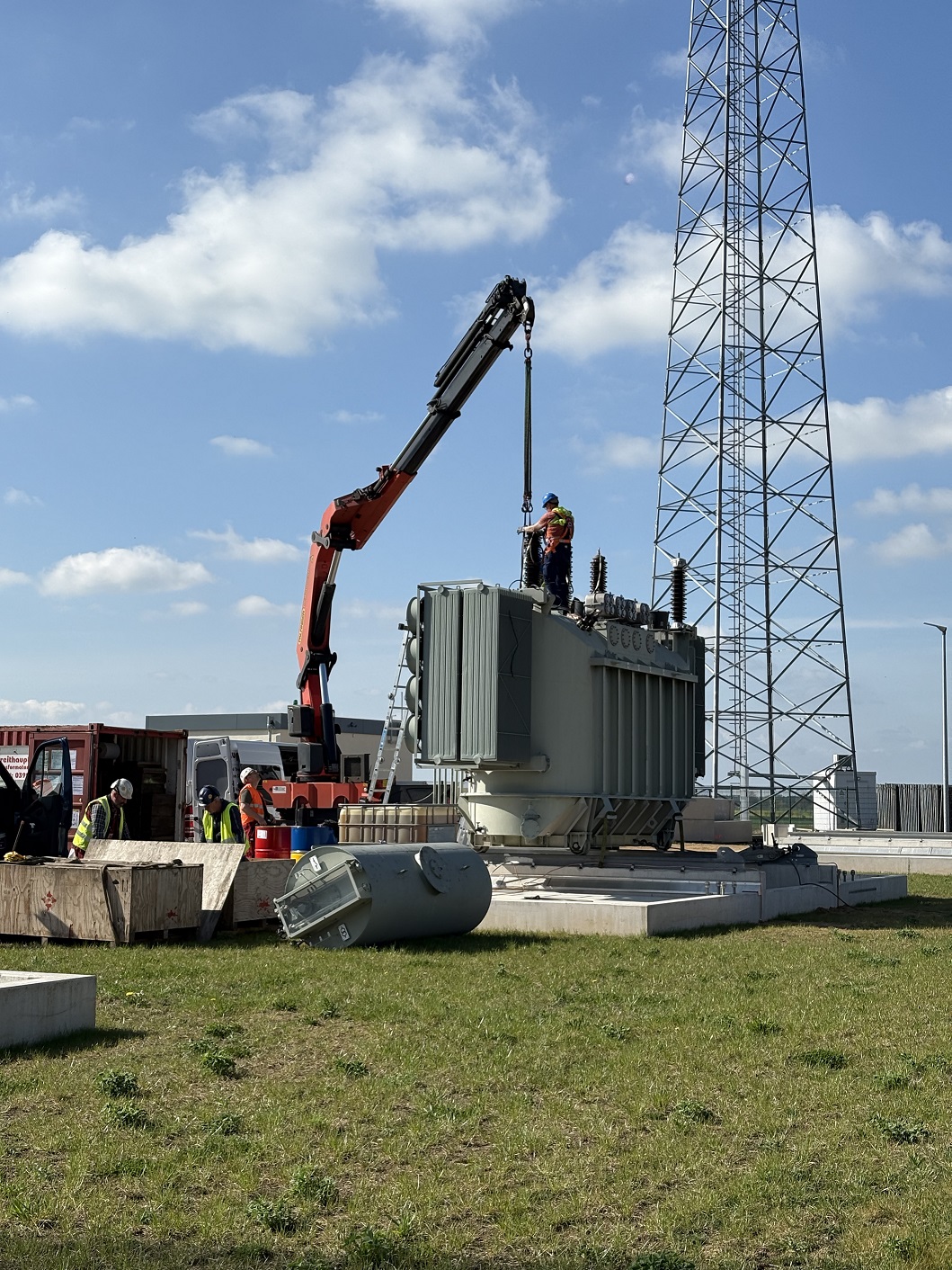 Offizielle Inbetriebnahme der Schaltstation in Kirch Jesar (v. l.): Frank Haacker, Siemens-Niederlassung Rostock, Christian Winkelmann, Transformare GmbH Wittenberge, Bernd Alvermann, Kuhlmann Leitungsbau GmbH, Anne Reimuck, WEMAG Projektentwicklung GmbH, Thomas Murche, WEMAG-Vorstand, Tim Stieger, WEMAG Netz GmbH. / Foto: WEMAG/Stephan Rudolph-Kramer