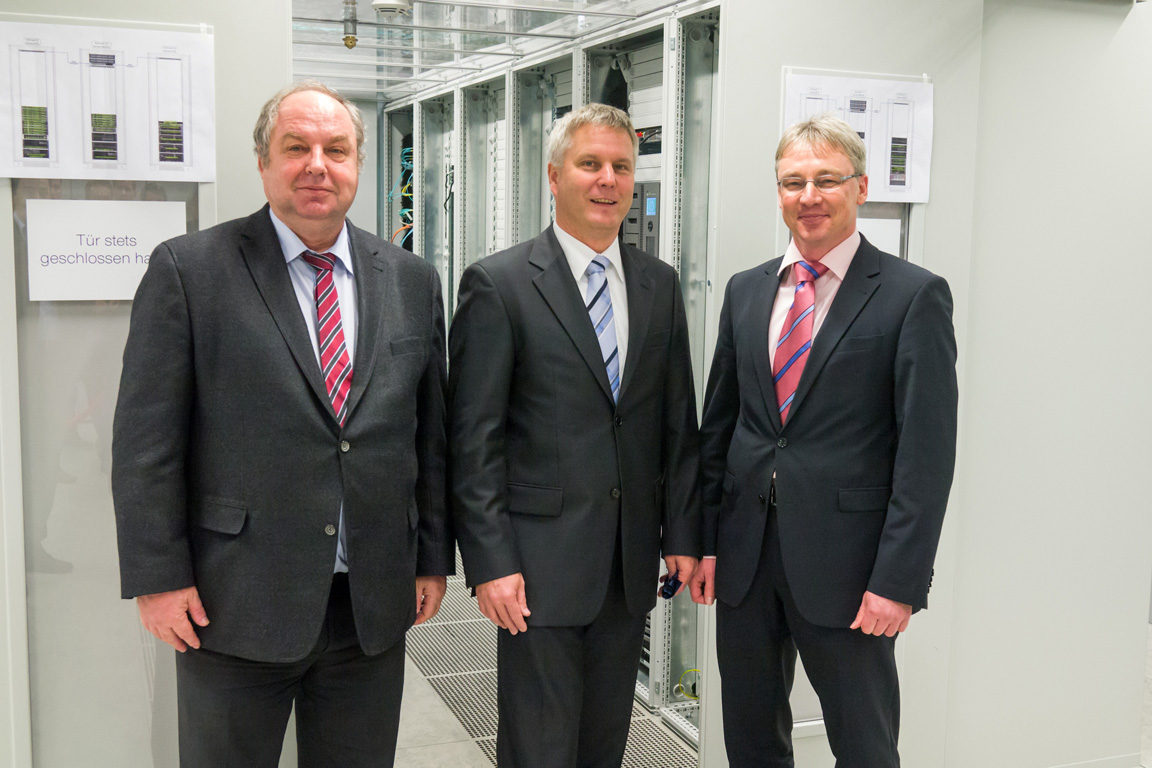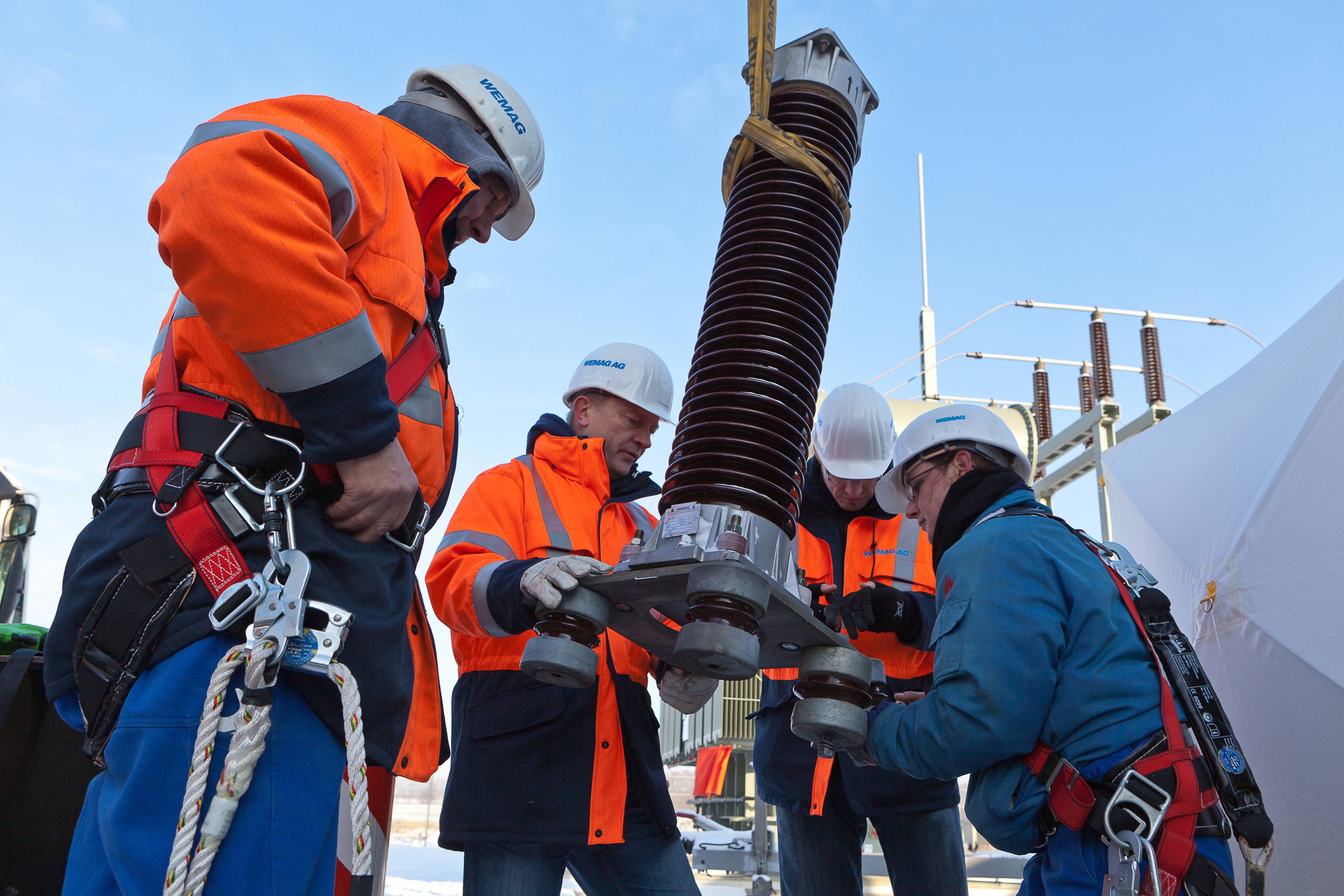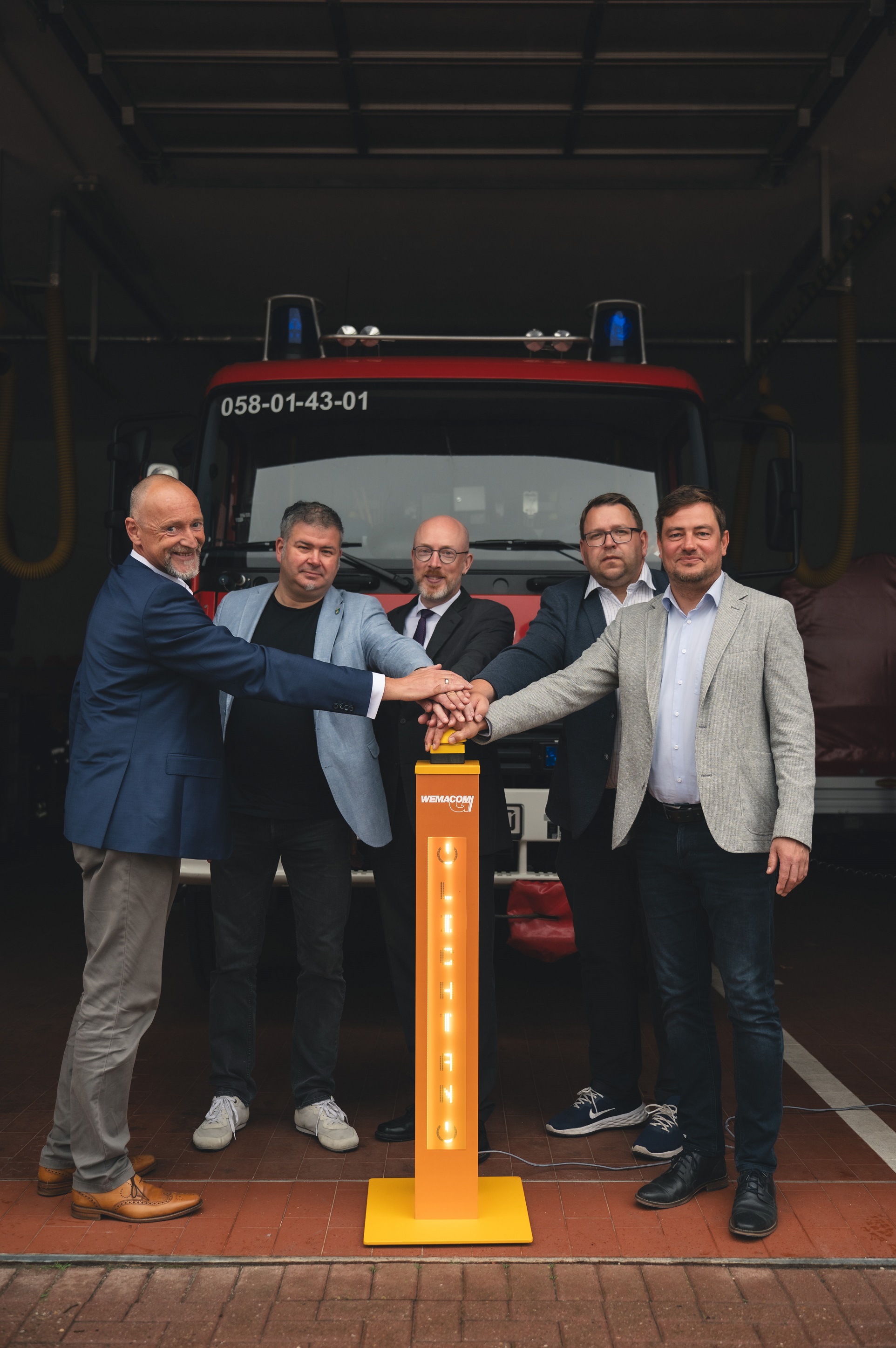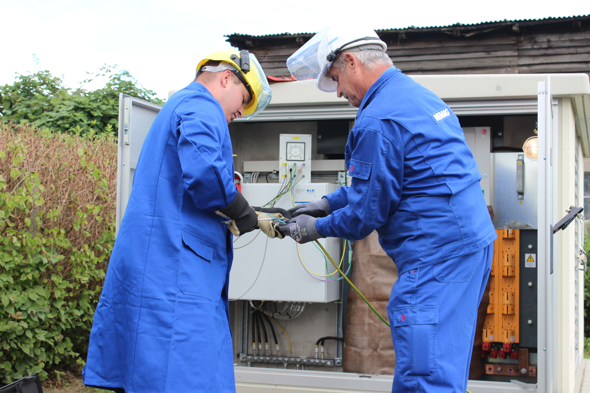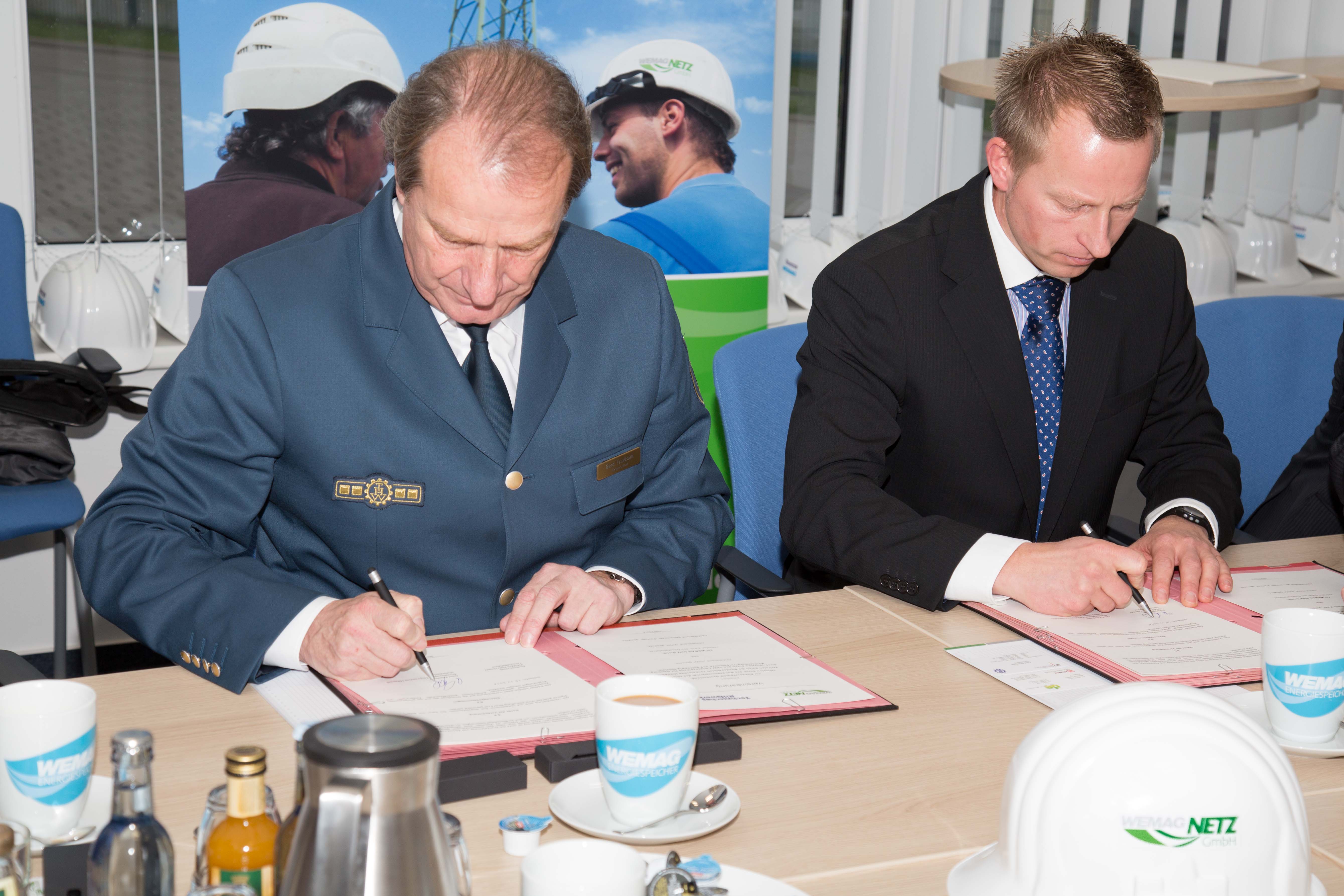 Offizielle Inbetriebnahme der Schaltstation in Kirch Jesar (v. l.): Frank Haacker, Siemens-Niederlassung Rostock, Christian Winkelmann, Transformare GmbH Wittenberge, Bernd Alvermann, Kuhlmann Leitungsbau GmbH, Anne Reimuck, WEMAG Projektentwicklung GmbH, Thomas Murche, WEMAG-Vorstand, Tim Stieger, WEMAG Netz GmbH. / Foto: WEMAG/Stephan Rudolph-Kramer