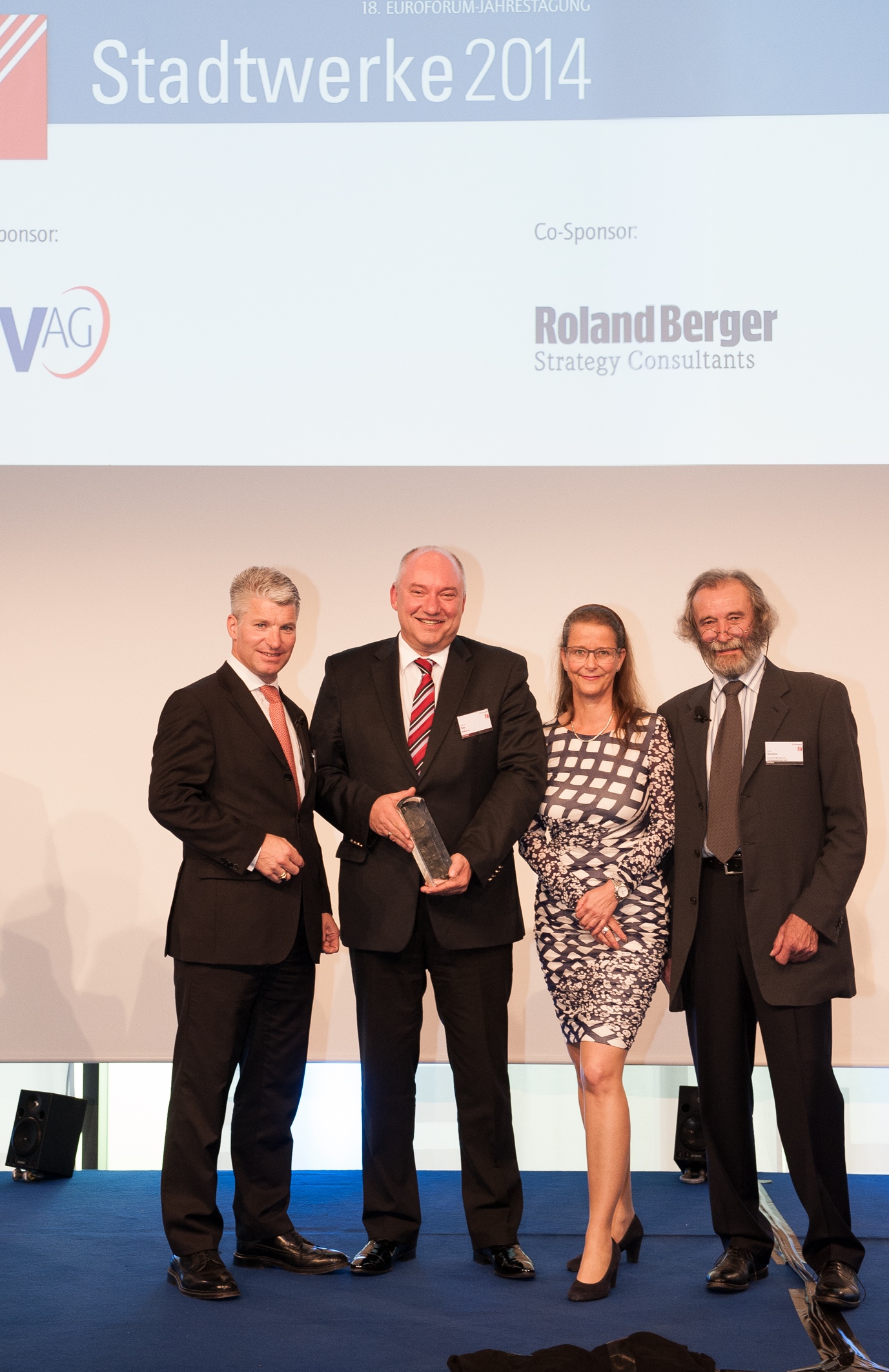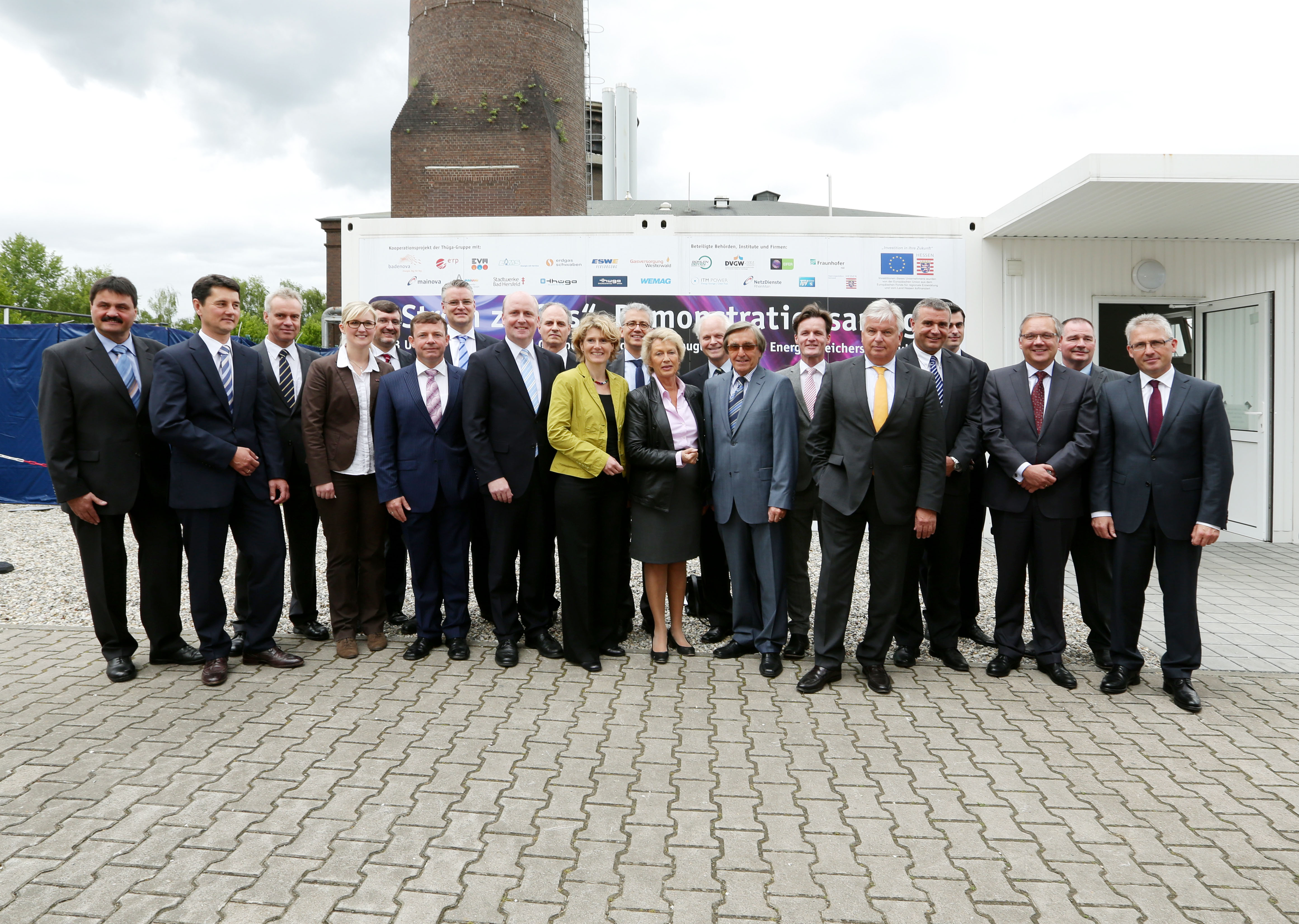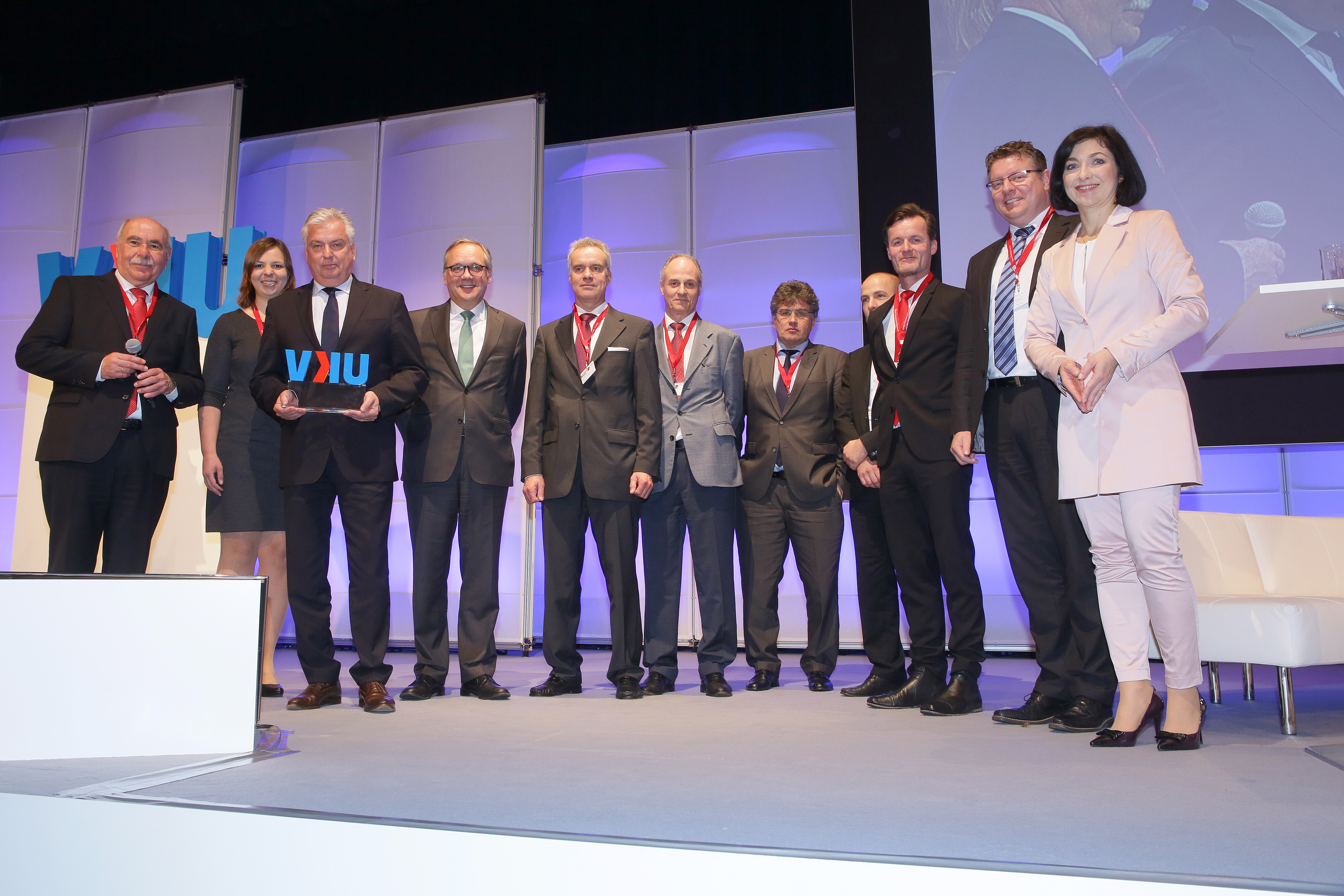 Die Strom zu Gas-Projektpartner bei der VKU-Preisverleihung in Berlin v.l.n.r. Ivo Gönner (VKU), Elke Wanke (Thüga), Michael Riechel (Thüga), Ralf Schodlok (ESWE), Roland Moritzer (Stadtwerke Ansbach), Phil Doran (ITM Power), Uwe Berlinghoff (Mainova),Ingo Franke (Mainova),Dieter Sommerhalter (badenova Netz),Tobias Struck (WEMAG), Katharina Reiche (VKU). Foto: VKU