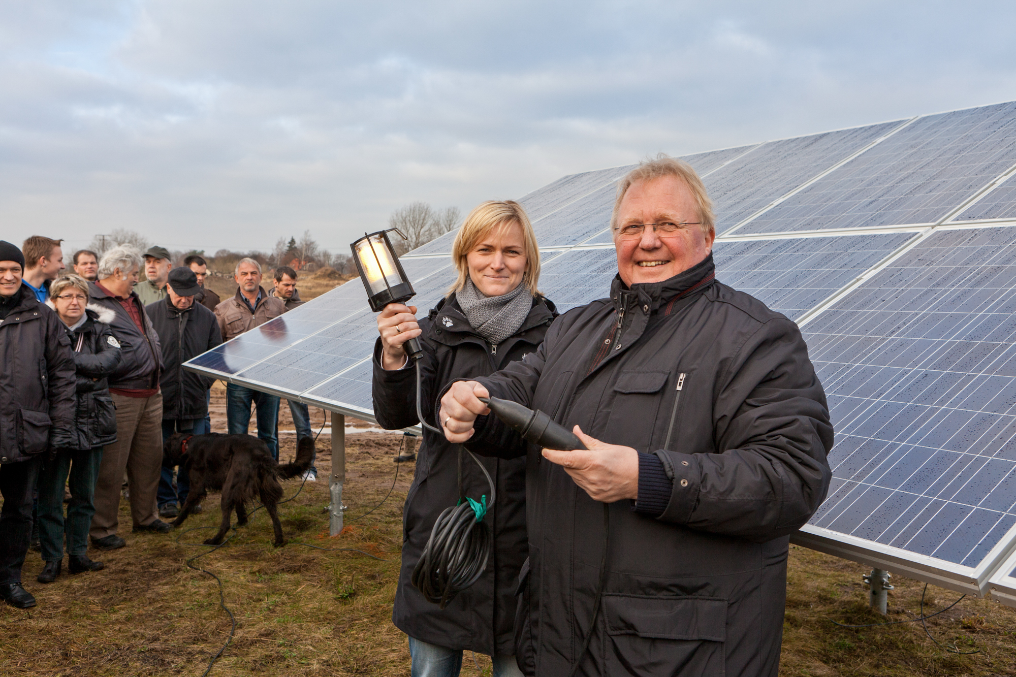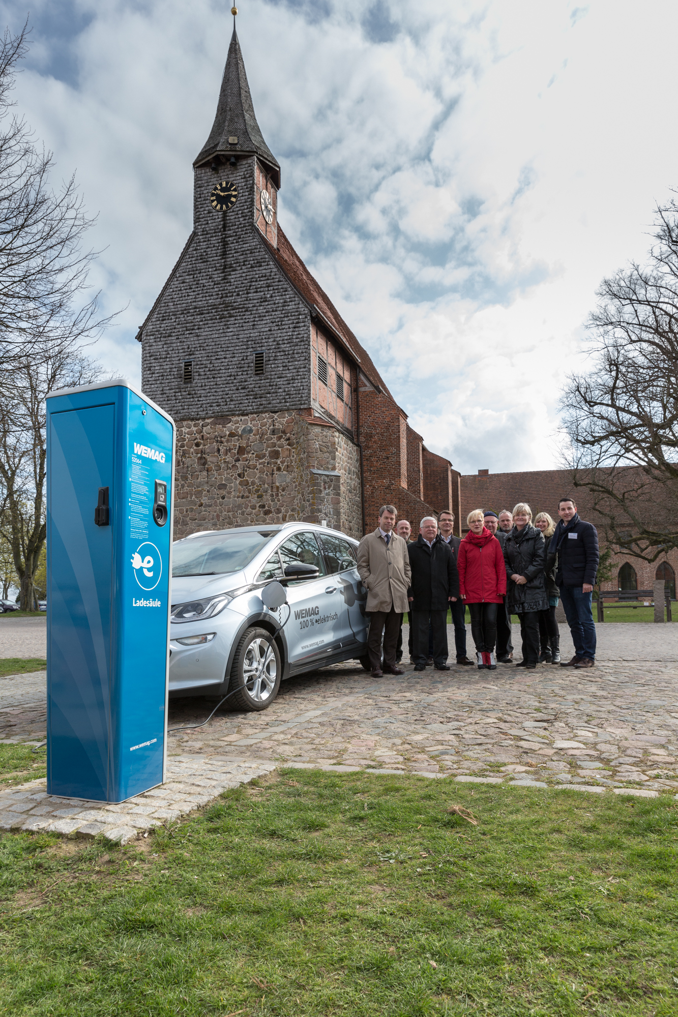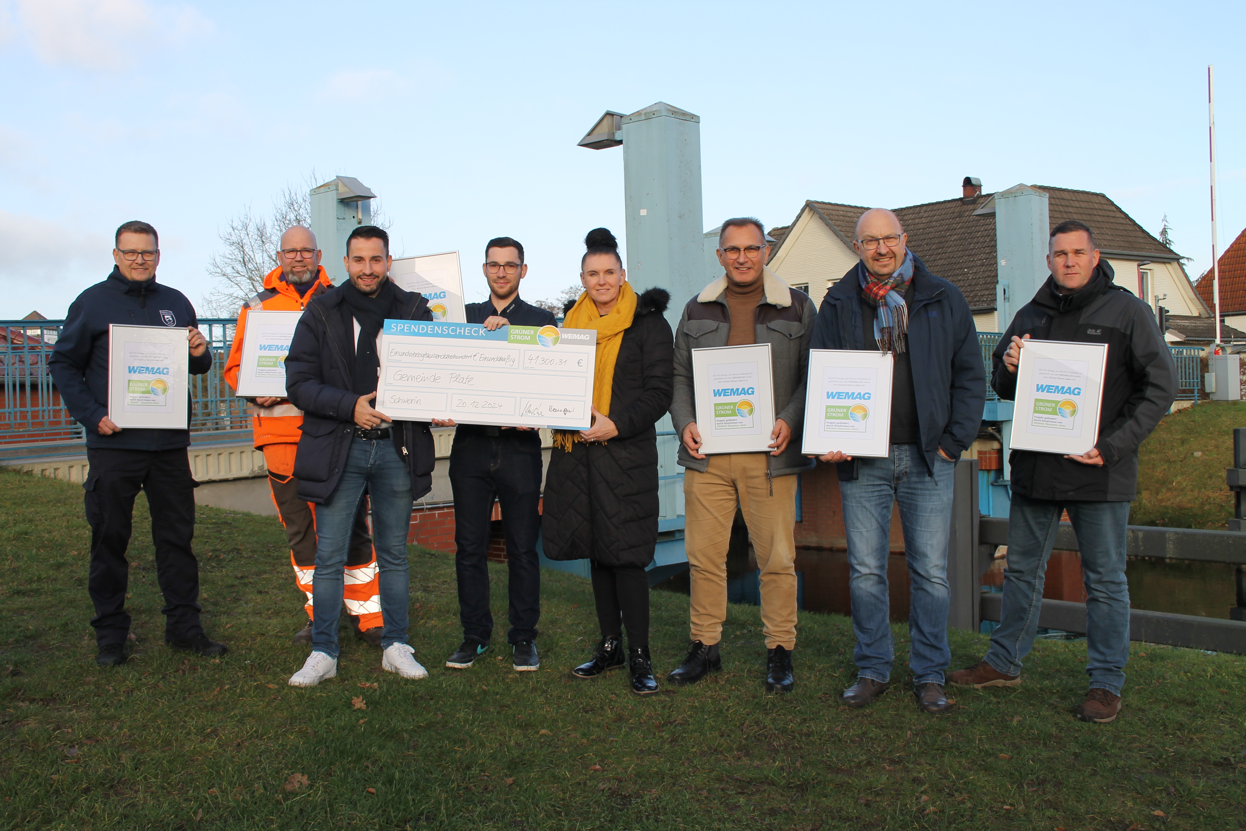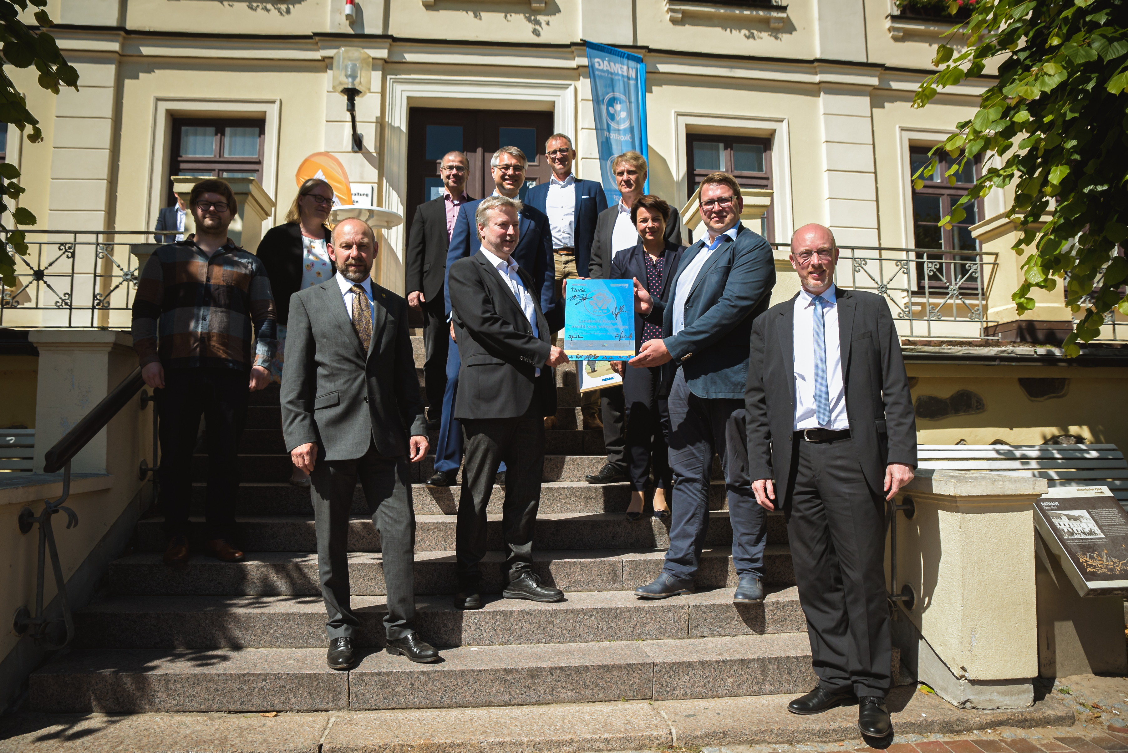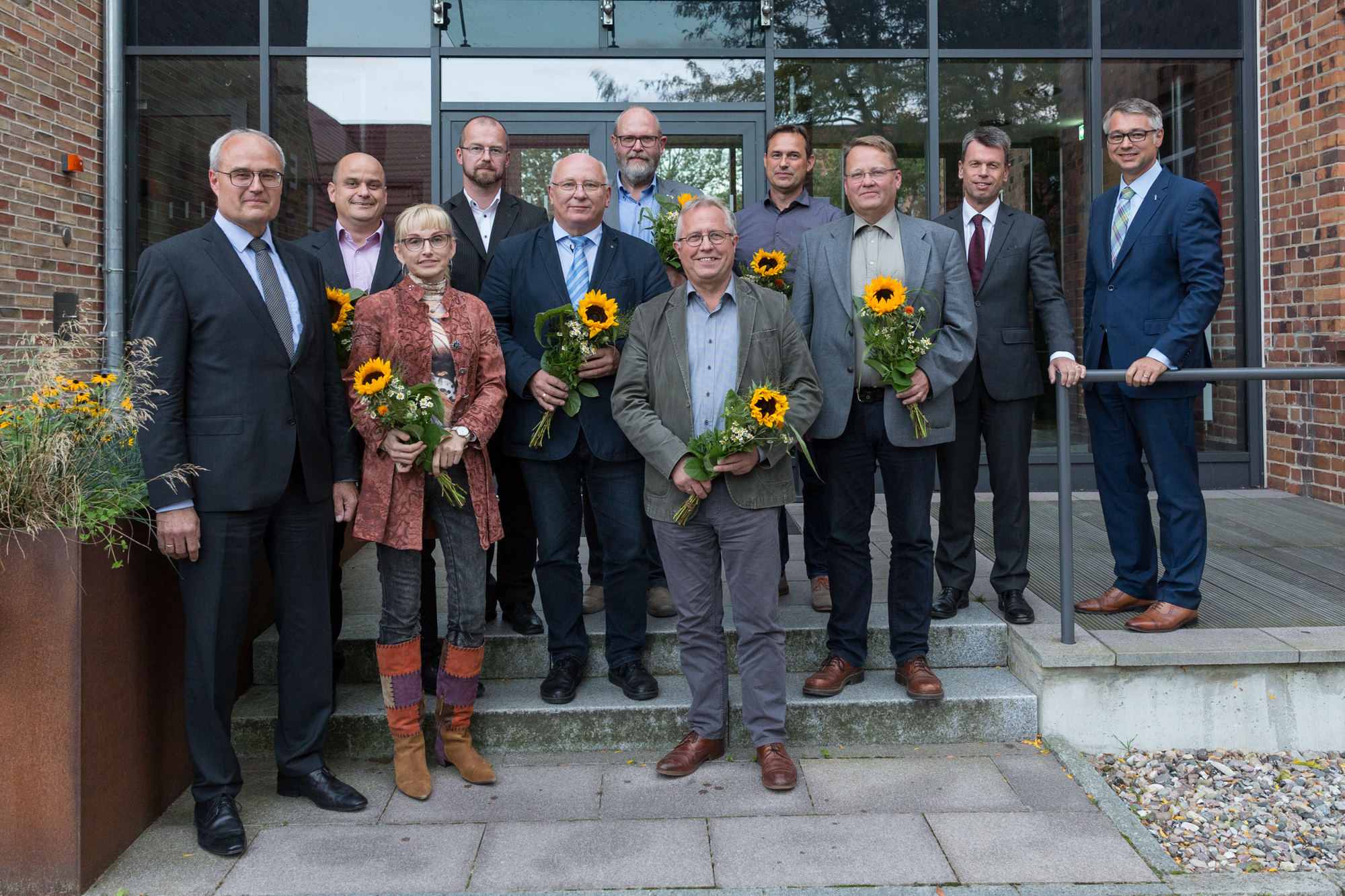Christian Pegel, Energieminister der Landes Mecklenburg-Vorpommern, Thomas Murche, WEMAG-Vorstand, Sabine Foth, Synodalpräsidentin der Evangelischen Landeskirche, Dr. Martin Kastrup, Finanzdezernent der Evangelischen Landeskirche, Wilfried Baldermann, Bürgermeister der Gemeinde Dobbin-Linstow, Karl-Heinz Garbe, Geschäftsführer der MES – Moderne Energie Systeme GmbH, Jens Eckhoff, Güstrower Kies und Mörtel GmbH, Tobias Schüssler, Geschäftsführer der Goldbeck Solar GmbH, Oliver Sommer, Projektleiter Enertek Anlagenbau GmbH (v.l.) / Foto: Stephan Rudolph-Kramer