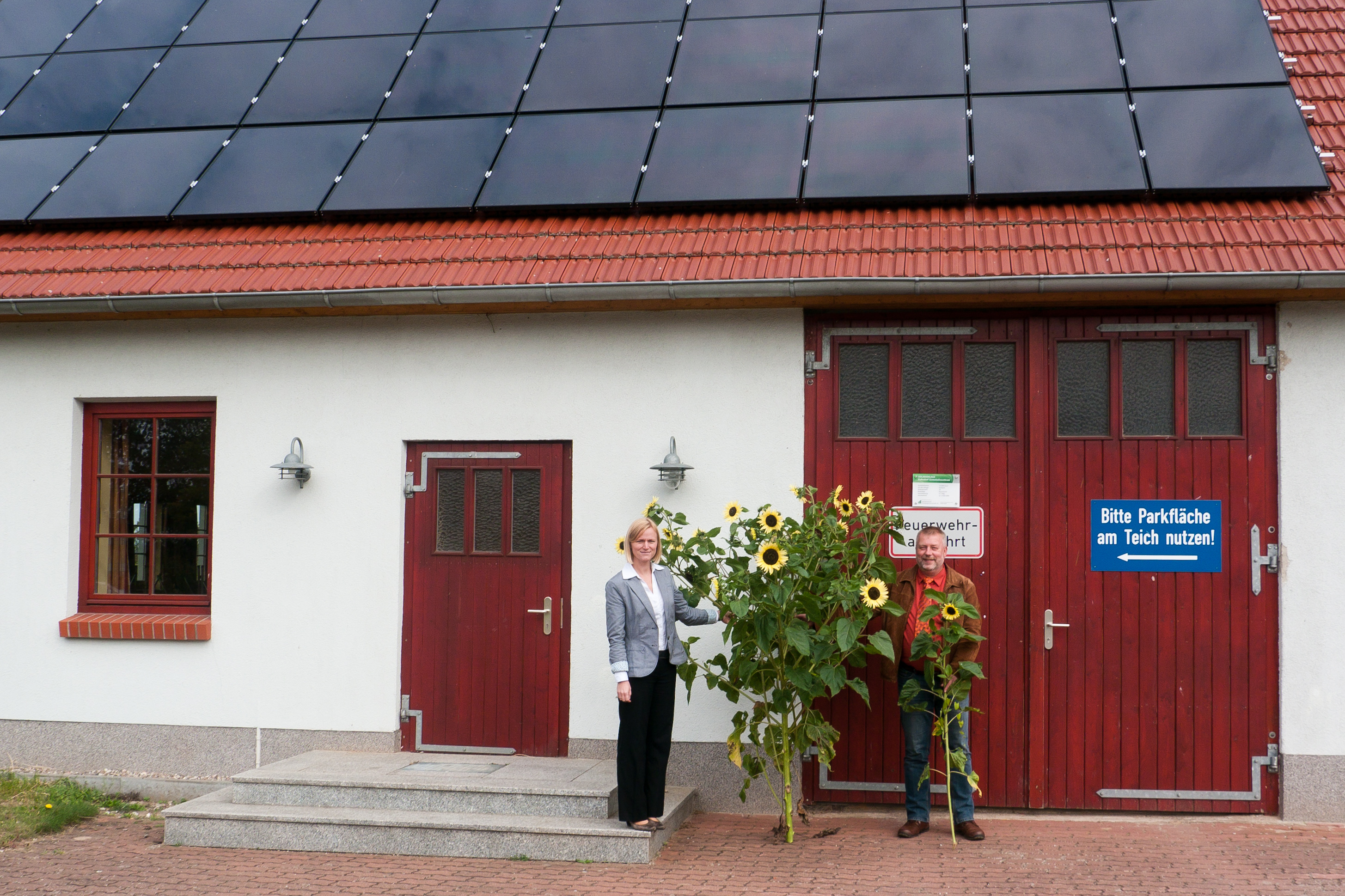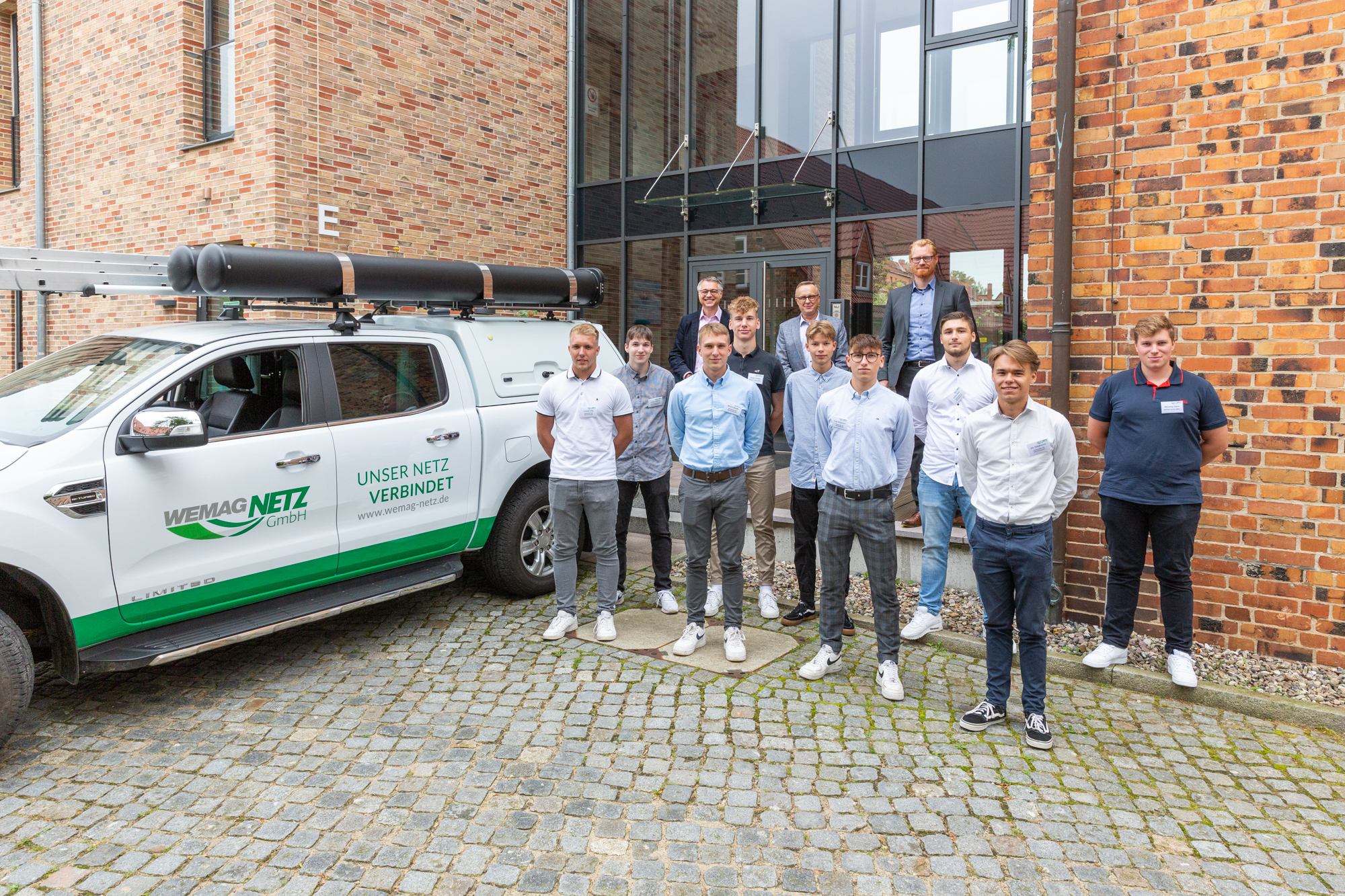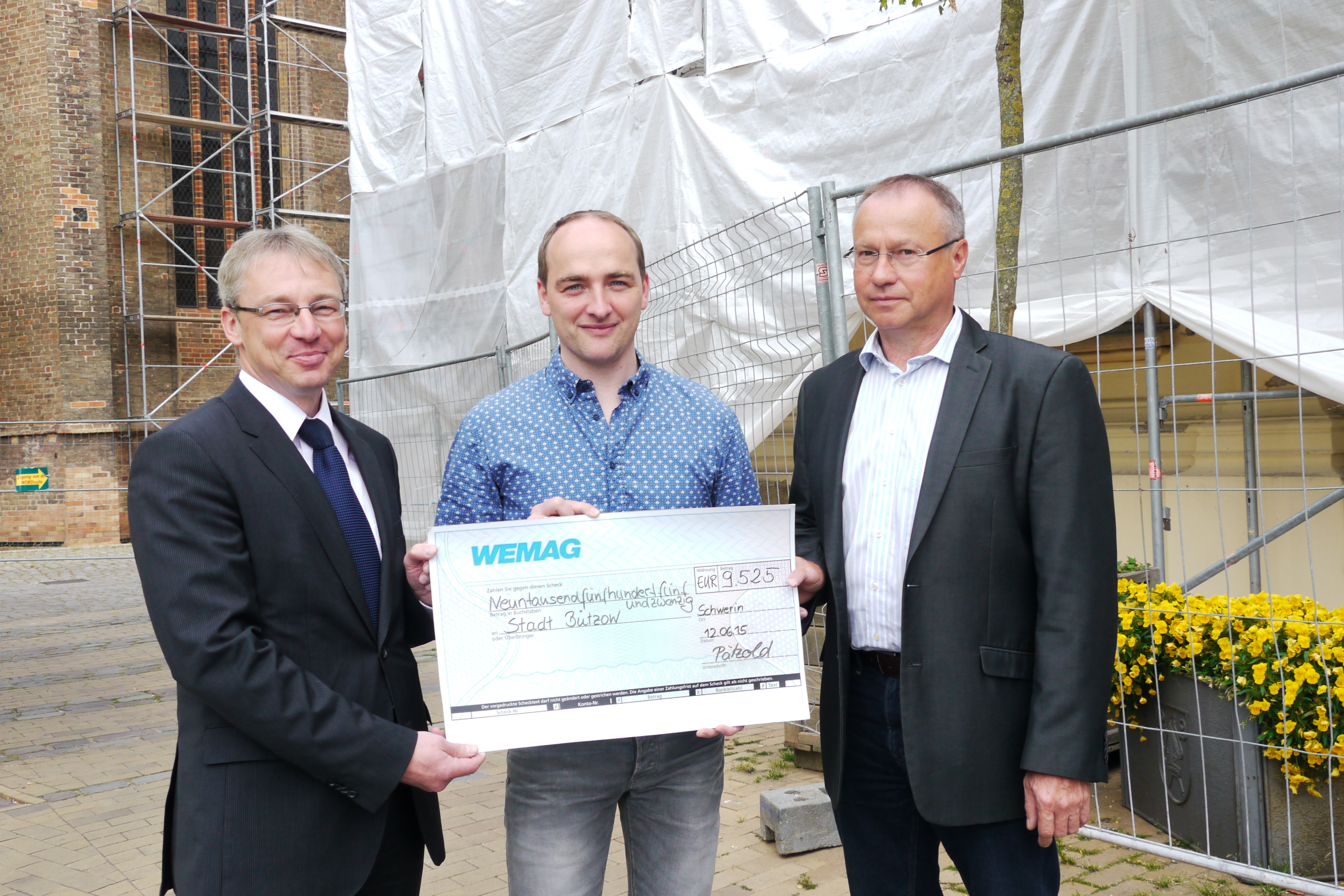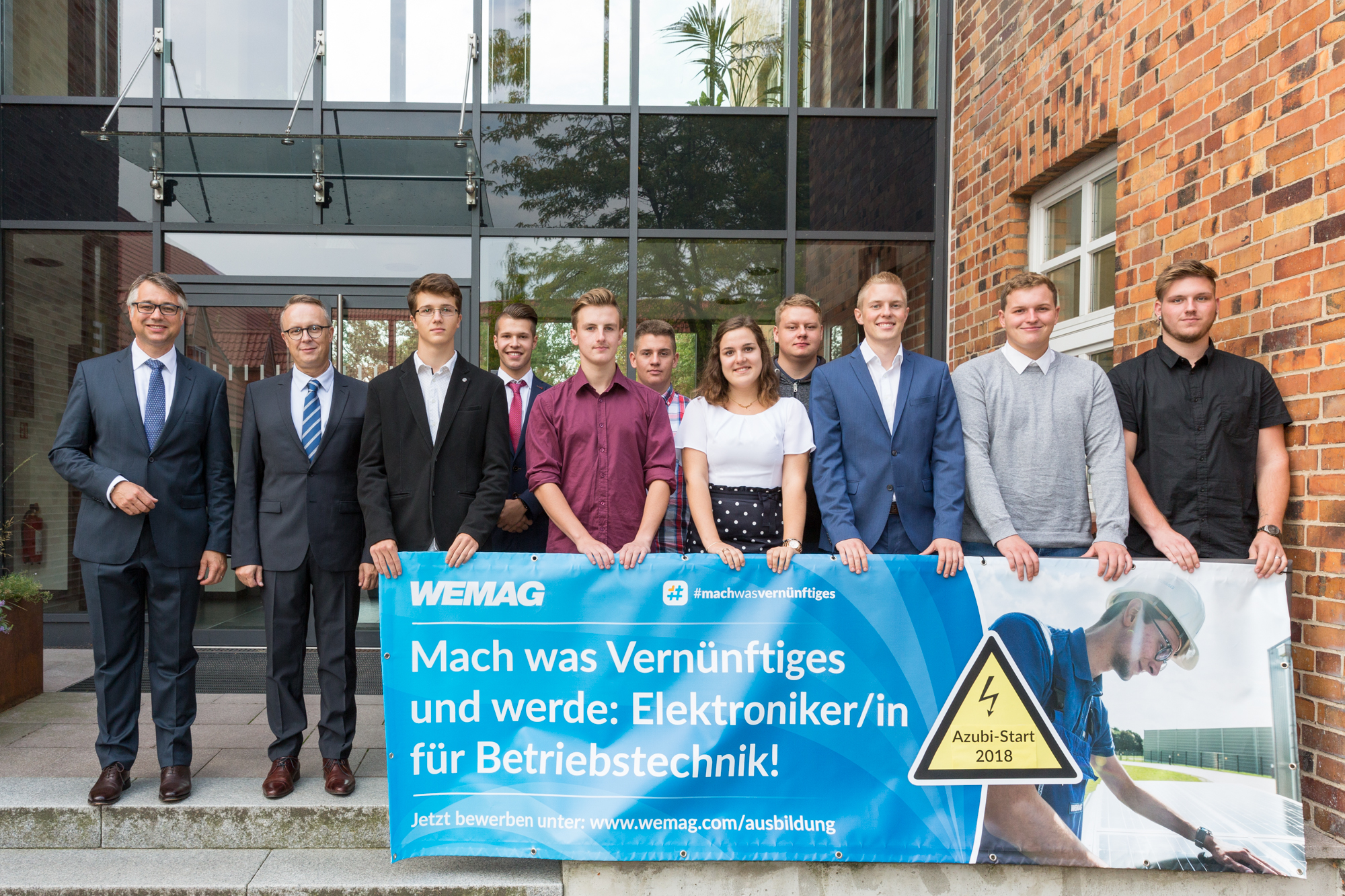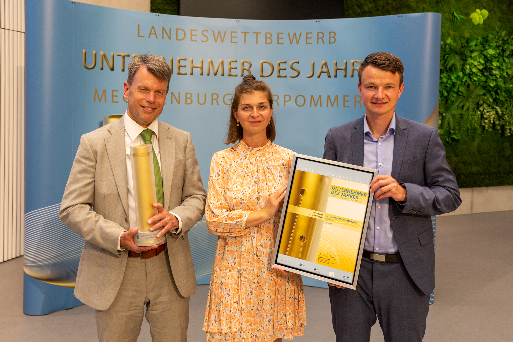 Christian Pegel, Energieminister der Landes Mecklenburg-Vorpommern, Thomas Murche, WEMAG-Vorstand, Sabine Foth, Synodalpräsidentin der Evangelischen Landeskirche, Dr. Martin Kastrup, Finanzdezernent der Evangelischen Landeskirche, Wilfried Baldermann, Bürgermeister der Gemeinde Dobbin-Linstow, Karl-Heinz Garbe, Geschäftsführer der MES – Moderne Energie Systeme GmbH, Jens Eckhoff, Güstrower Kies und Mörtel GmbH, Tobias Schüssler, Geschäftsführer der Goldbeck Solar GmbH, Oliver Sommer, Projektleiter Enertek Anlagenbau GmbH (v.l.) / Foto: Stephan Rudolph-Kramer
