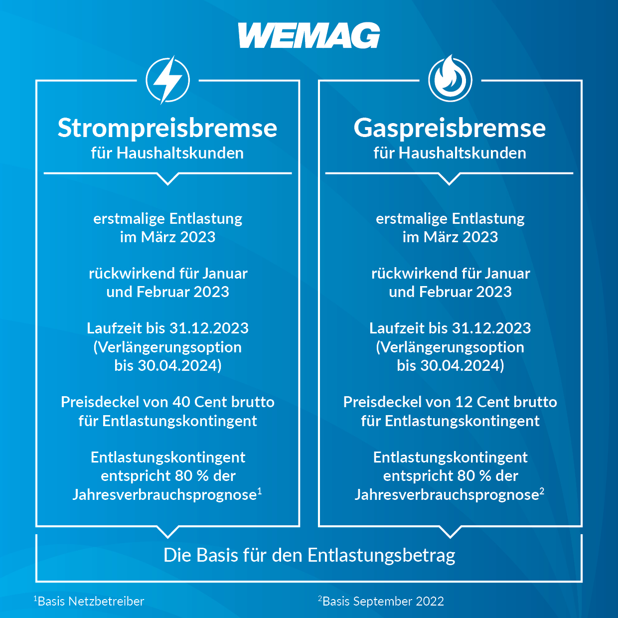 Nachdem der Staat den Abschlag für Gas und Fernwärme für Dezember 2022 in Form einer Entlastungszahlung finanziert hat, greift für die meisten Kunden ab März 2023 die Strom-, Gas- und Wärmepreisbremse. Die Entlastungen durch die Preisbremsen gelten bereits ab Januar 2023. Die erstmalige Verrechnung für die Kunden soll im März 2023 stattfinden und die Entlastung für Januar und Februar berücksichtigen.