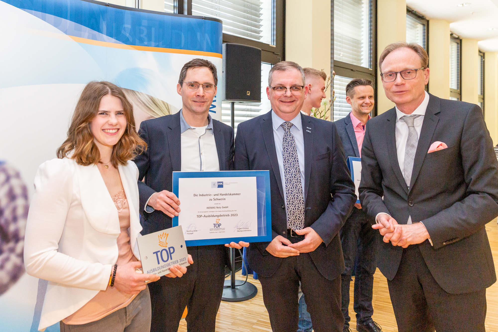 Die Industrie- und Handelskammer zu Schwerin (IHK) hat jetzt zum 13. Mal in Folge die WEMAG für ihre überdurchschnittlichen Leistungen als TOP-Ausbildungsbetrieb gewürdigt. Der Öko-Energieversorger mit Sitz in Schwerin gehört damit in diesem Jahr zu den 62 Unternehmen im IHK-Bezirk, die sich in besonderem Maße bei der Berufsausbildung engagieren. Die feierliche Übergabe der Urkunde und einer Plakette erfolgte durch den IHK-Präsidenten Matthias Belke und Jochen Schulte, Staatssekretär des Ministeriums für Wirtschaft, Infrastruktur, Tourismus und Arbeit.