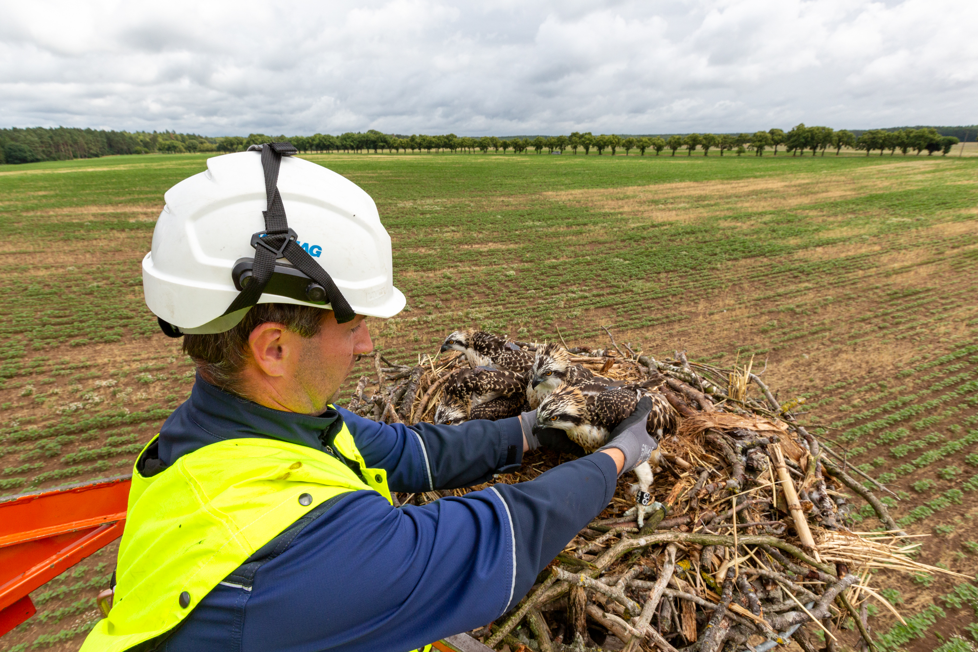 „Wir haben bisher 71 Jungtiere beringt. Ich schätze, dass wir in der ersten Juliwoche noch weitere 10 Tiere beringen können“, berichtet Torsten Marczak. Er ist ehrenamtlicher Landeskoordinator für Fischadler und Wanderfalken und arbeitet im Auftrag des Landesamtes für Umwelt, Naturschutz und Geologie. „Die Zusammenarbeit mit der WEMAG läuft sehr gut“, meint der Vogelschützer, der auch den Landwirten dankbar ist, die einen Teil ihrer Flächen für Ausweichmaste zur Verfügung stellen und die Zufahrt mit der Hubarbeitsbühne ermöglichen.