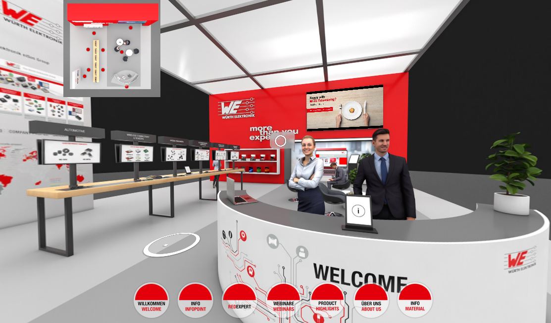 Das Team der Würth Elektronik bietet mit dem virtuellen Messestand eine kreative Antwort auf die aktuelle Situation. Interessierte Entwickler und Hersteller können über diese Plattform im engen, persönlichen Gespräch mit dem Hersteller bleiben. Produkte werden mit ihren technischen Daten visualisiert und können mit Würth Elektronik Spezialisten im Chat besprochen werden. Bauteilemuster und Entwicklerunterstützung lassen sich direkt aus dem virtuellen Messestand heraus anfordern. Auch im Zugriff: Hilfsmittel zur präzisen Produktauswahl wie die messdatenbasierende Applikation REDEXPERT sowie Bestellformulare, Kataloge und Fachbücher.