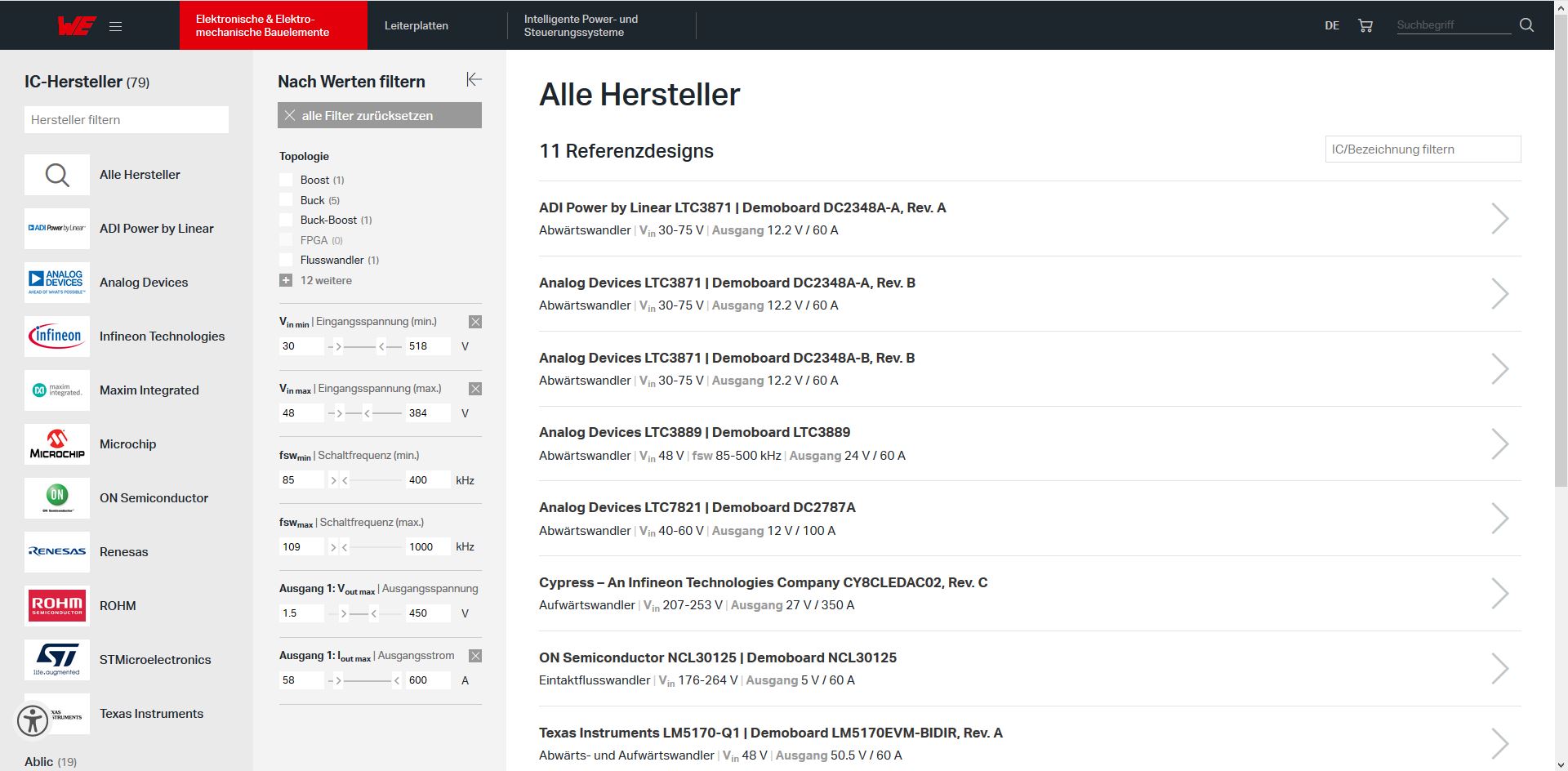 Die IC-Referenzdesignsuche beginnt mit der Auswahl des Herstellers oder des passenden ICs. Umfangreiche Filterfunktionen und Parametereinstellungen vermitteln den Entwicklern einen schnellen Überblick über alle für ihr Design passenden und verfügbaren Würth-Elektronik-Komponenten. Der Online-Service ermöglicht das Filtern nach IC-Hersteller, IC-Nummern oder Topologie wie Buck, Boost, Sepic sowie nach Parametern wie Eingangsspannung, Schaltfrequenz, Ausgangsspannung oder Ausgangsstrom.