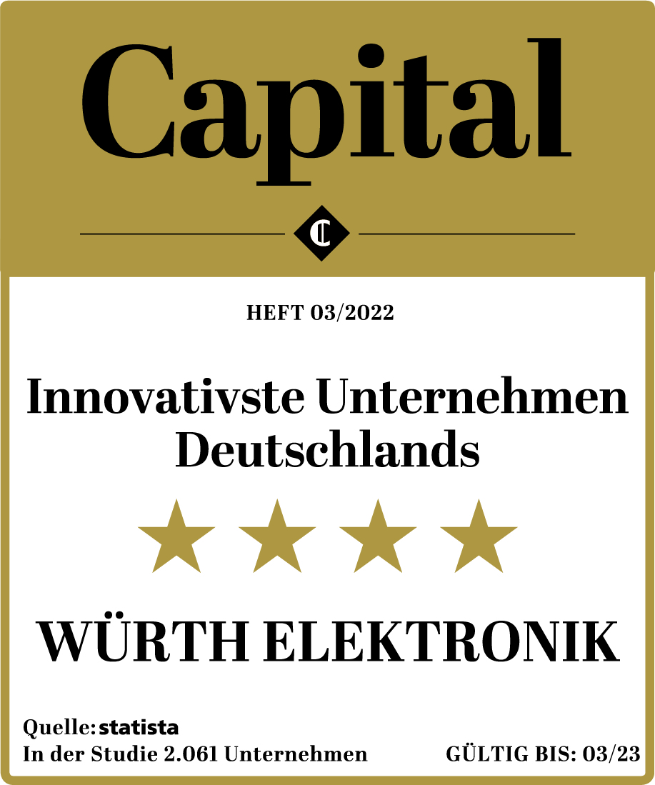 (pressebox) (Waldenburg, 26.04.2022) Die Würth Elektronik Unternehmensgruppe wurde erneut von der renommierten Fachzeitschrift Capital ausgezeichnet: Die Organisation erhielt in Heft 3/2022 vier Sterne in der Rubrik „Innovativste Unternehmen Deutschlands“. Die Auszeichnung folgte einer Befragung unter Innovationsfachleuten.