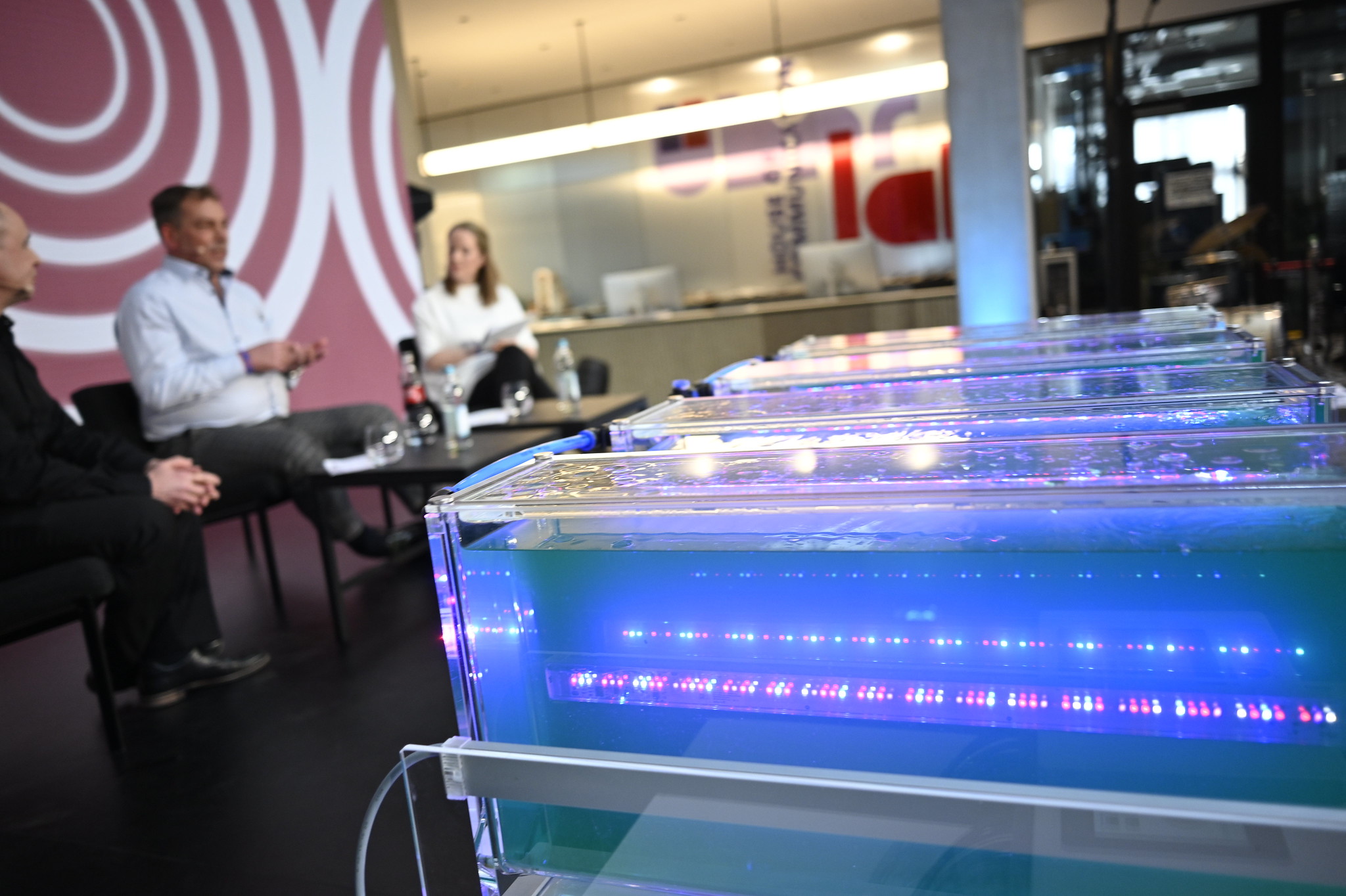 Alexander Gerfer, CTO bei Würth Elektronik eiSos und Martin Havers, Gründer von Agile Solutions, erläuterten das Konzept. In Deutschland erfolgt die Algenzucht in geschlossenen Indoor-Systemen unter kontrollierten Bedingungen. Dabei ist eine pflanzenoptimierte Beleuchtung entscheidend für den Ertrag. In Kooperation mit Würth Elektronik hat Agile Solutions einen speziellen LED-Vorhang entwickelt, der mit 700 Mid-Power LEDs die Algenkulturen mit optimalem Licht versorgt.