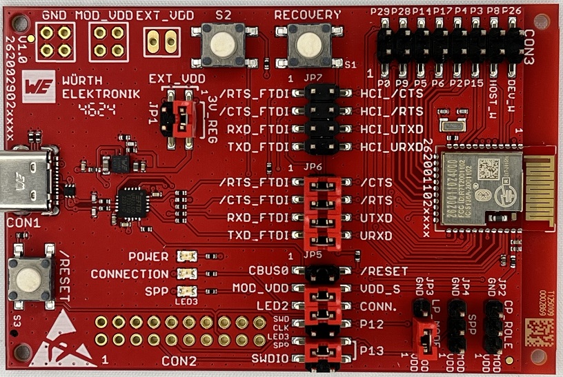 Mit der WE Bluetooth® LE Terminal App steht eine schnelle und einfache Möglichkeit zum Testen als auch eine Basis für neue, kundenspezifische Apps zur Verfügung. Dazu kommen als weitere Services das Wireless Connectivity SDK, das WE UART Terminal und ein Evaluationsboard, welches unkompliziert an einen PC angeschlossen werden kann und alle Modul-Pins zum Testen herausgeführt hat.