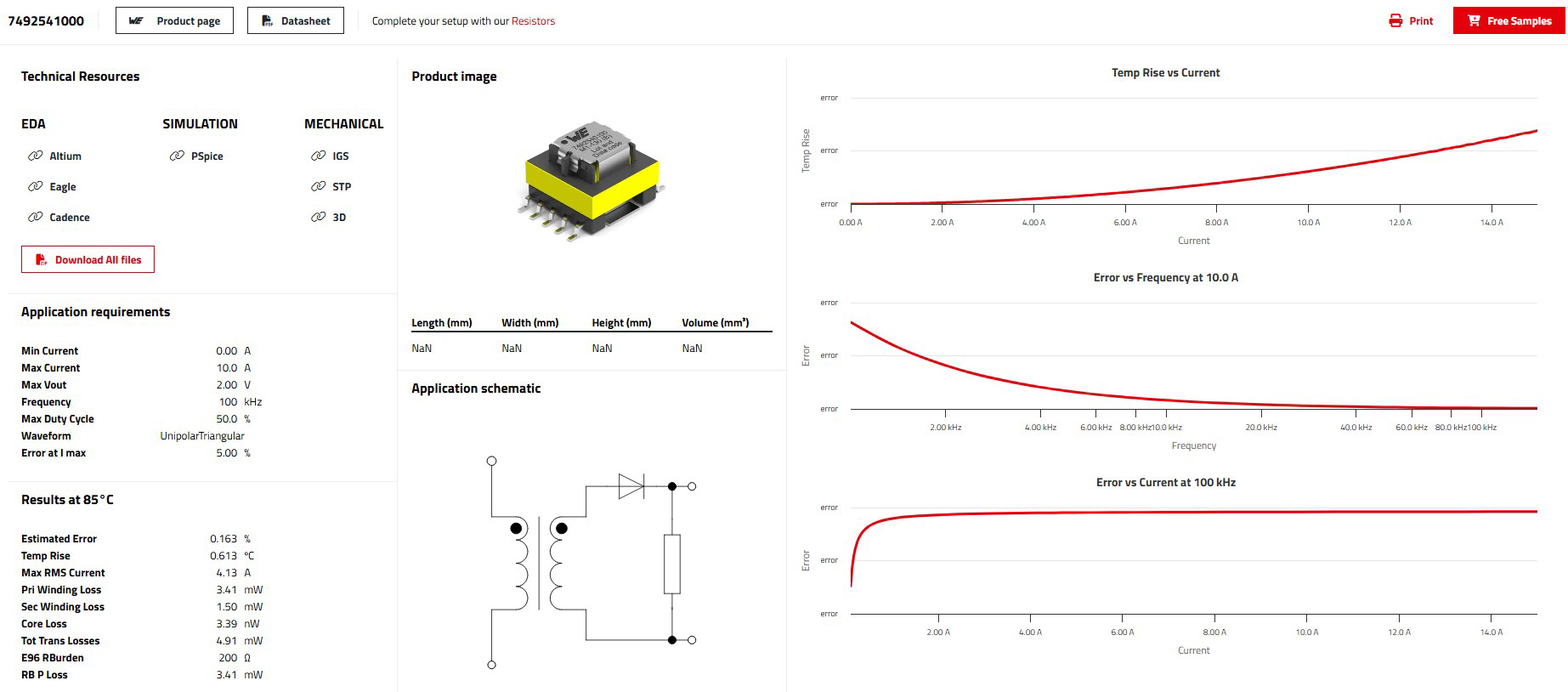 Nach Eingabe der Parameter Strom, Frequenz, Signaltyp und gewünschter maximaler Fehlerrate findet der Selector alle verfügbaren Optionen in der Produktdatenbank von Würth Elektronik, die diesen Kriterien entsprechen. Das Tool liefert eine Liste der Bauteile mit den entsprechenden Parametern und simuliert den Temperaturanstieg sowie den Fehler über Frequenz und Strom. Darüber hinaus erlaubt das Tool den direkten Vergleich verschiedener Optionen in einer Simulationsansicht und stellt für das ausgewählte Bauteil eine Übersichtsseite mit sämtlichen relevanten Informationen bereit. Diese auf Messreihen basierenden Simulationen ersparen Entwicklerinnen und Entwicklern eigene Tests für die Auswahl von CST.