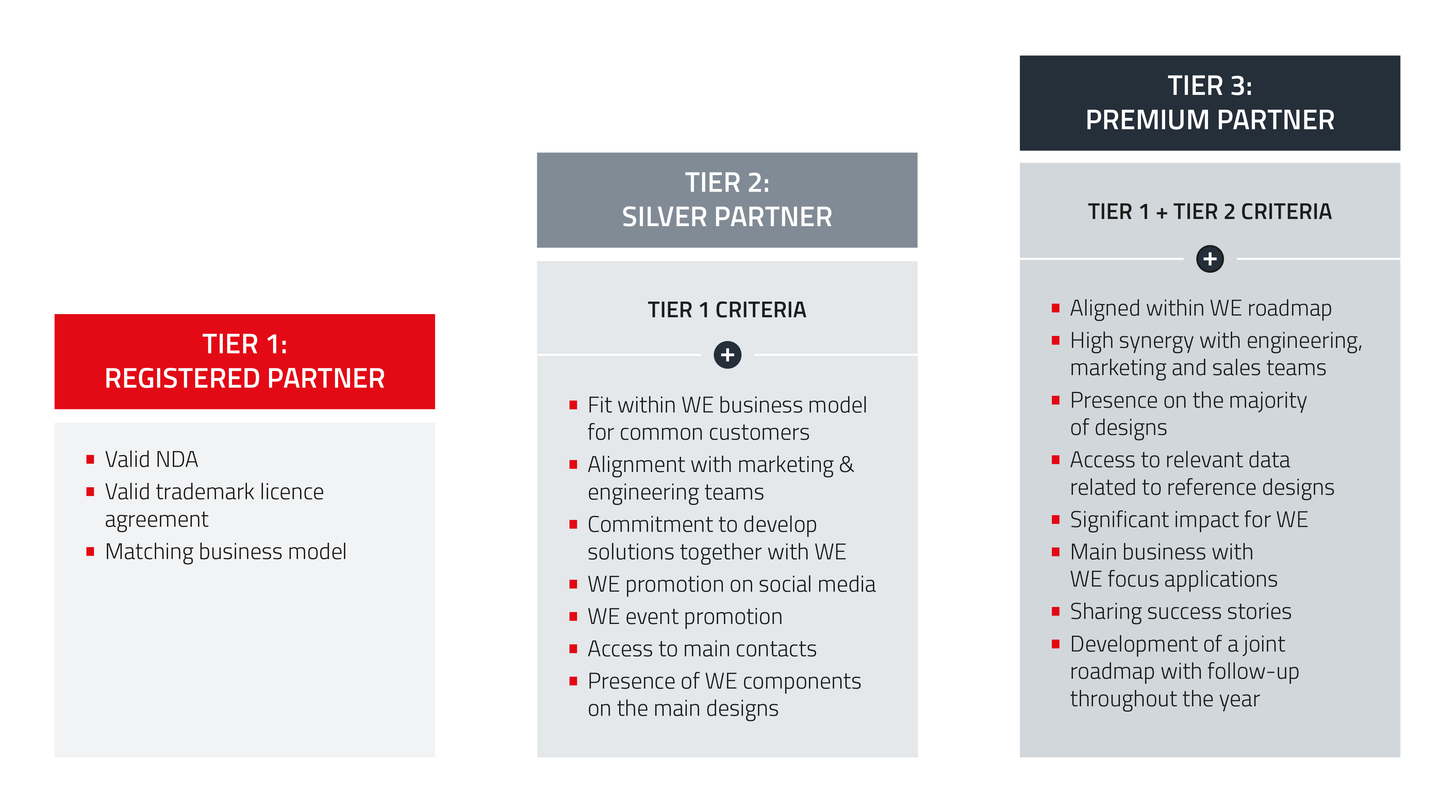 Das Würth Elektronik Partnerprogramm ist in drei Stufen gegliedert. Der Einstieg gelingt bereits mit einer Geheimhaltungsvereinbarung, einer Markenlizenz und einem Geschäftsmodell. Auf Basis klar definierter Kriterien – etwa dem Engagement für die Marke, gemeinsamen Wachstumszielen und der Integration von Würth Elektronik Bauelementen in die eigenen Designs – können sich teilnehmende Unternehmen anschließend schrittweise vom Einstiegsniveau über den Silver-Status bis hin zum Premiumpartner entwickeln.