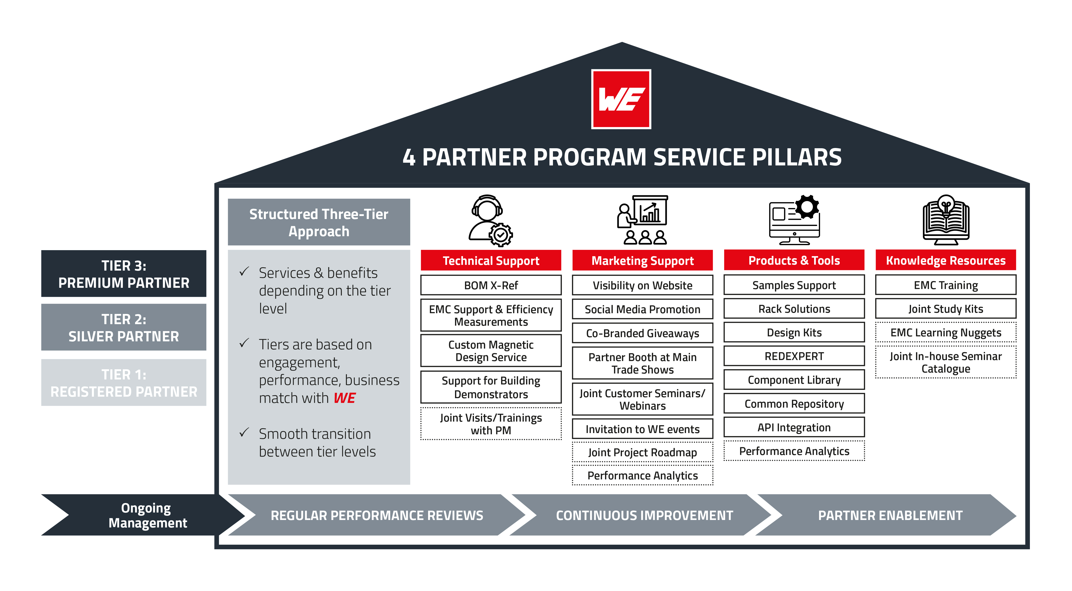 Basierend auf den drei Partnerschaftsstufen bietet Würth Elektronik ein spezielles Service- und Unterstützungsprogramm. Es besteht aus vier Säulen: technischer Support, Produkte und Tools, Marketing-Support sowie Wissenstransfer und Training. So entsteht ein leistungsstarkes Netzwerk, das Technologieführer, Geschäftsbereiche und Stakeholder zusammenbringt. Die Partner können neue Marktpotenziale erschließen, Produktinnovationen beschleunigen und ihren Kunden ein nahtloses One-Stop-Shop-Konzept anbieten.