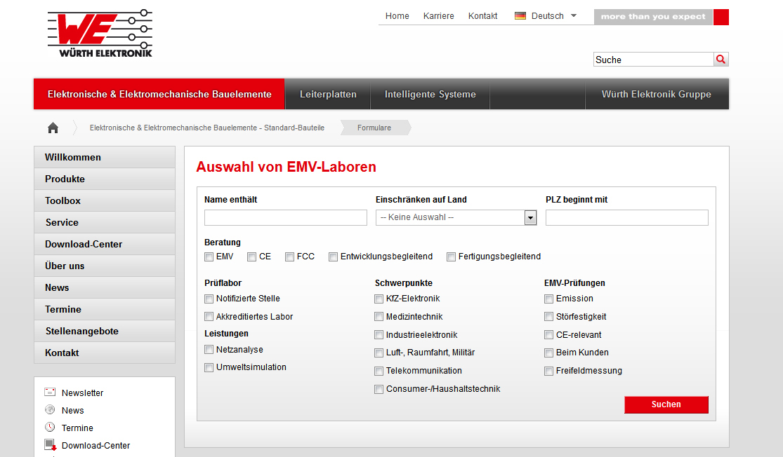 Elektronikhersteller können im EMV-Laborverzeichnis von Würth Elektronik nach Dienstleistern suchen, die sie zu den Themen EMV-, CE- oder FCC-Prüfsiegel entwicklungs- oder fertigungsbegleitend beraten. Die Dienstleister, notifizierte Stellen und akkreditierte Labore, geben bei der Eintragung an, welche Arten von EMV-Prüfungen sie anbieten, also beispielsweise Emission und Störfestigkeit, ob sie CE-relevant prüfen und ob sie Messungen beim Kunden vor Ort durchführen. Auch nach Laboren, die Netzanalysen oder Umweltsimulationen durchführen, kann man im Verzeichnis suchen. Besondere Branchenschwerpunkte werden ebenfalls zur Eingrenzung der Auswahl verwendet, etwa die Spezialisierung auf Telekommunikation oder auf die Anforderungen der Automobilindustrie, der Luft- und Raumfahrt oder der Medizintechnik.