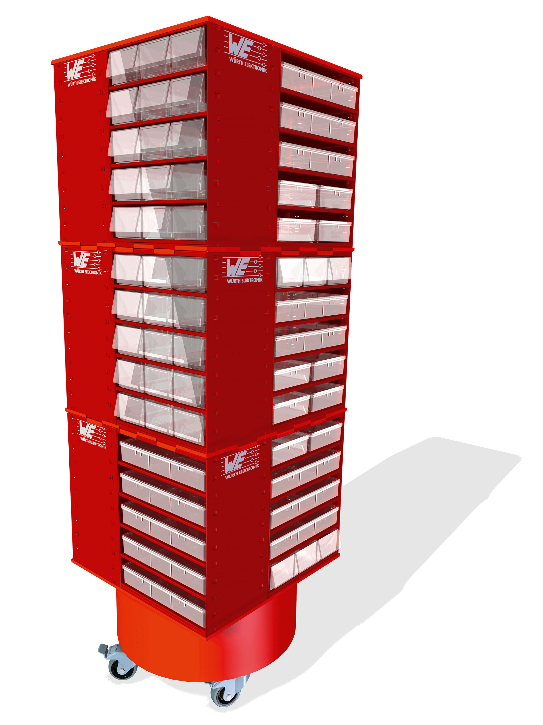 (pressebox) (Waldenburg, 22.07.2015) Die Design Kits von Würth Elektronik eiSos sind für viele Entwickler seit langem eine praktische Unterstützung bei der Entwicklungsarbeit. Nun gibt es für diese Laborsortimente mit lebenslanger kostenloser Wiederbefüllung zwei praktische Regalsysteme. In den beiden Ausführungen αRack und ΩRack sorgen diese flexibel kombinierbaren Regale für Übersicht und Ordnung bei EMV-Komponenten, Induktivitäten und Steckverbindern. Das αRack ist modular erweiterbar und wahlweise mit Wandhalterung oder als mobiler Drehturm erhältlich. Geschlossene Schütten schützen die Bauteile vor Staub. Praktisch: Die wichtigsten technischen Daten stehen auf der Schütte und ein QR-Code erlaubt den schnellen Zugriff auf das jeweilige Onlinedatenblatt.