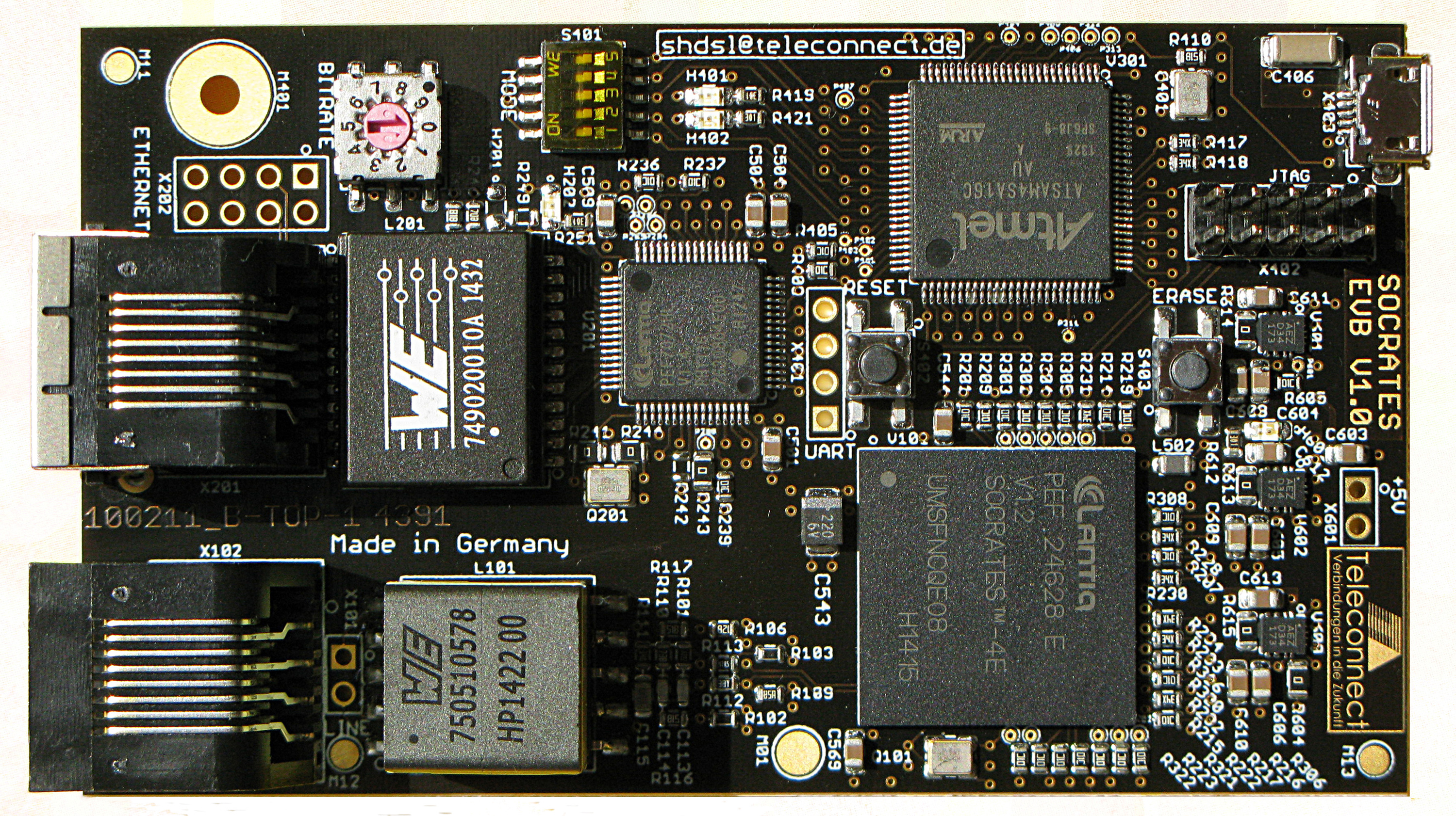Das SOCRATES™ Evaluation Kit kann als EFM-Modem, SHDSL-EFM-Modul oder Plug & Play-Ethernet-Verlängerung verwendet werden. Die vielseitige Karte bietet fünf DIP-Schalter zur Auswahl verschiedener Modi, in denen der SOCRATES™-Chipsatz getestet werden kann. Zur Auswahl stehen 20 verschiedene Bitraten einschließlich Automodus. Die SOCRATES™-Produktfamilie unterstützt einen Maximaldurchsatz von 60 Mbit/s über vier Kupferleiter unter Verwendung gebündelter Übertragungsadern (4-Pair-Bonding). Kunden, die den SOCRATES™ bereits in der Praxis eingesetzt haben, haben je Leiterpaar Datenraten von bis zu 15 Mbit/s bzw. Maximalreichweiten von mehr als 15 km erzielen können. Mit diesem Evaluation Kit können Kunden den SOCRATES™-Chipsatz in einer Vielzahl neuartiger SHDSL-Anwendungen in den Bereichen Telekommunikation, Industrie und Smart City testen.