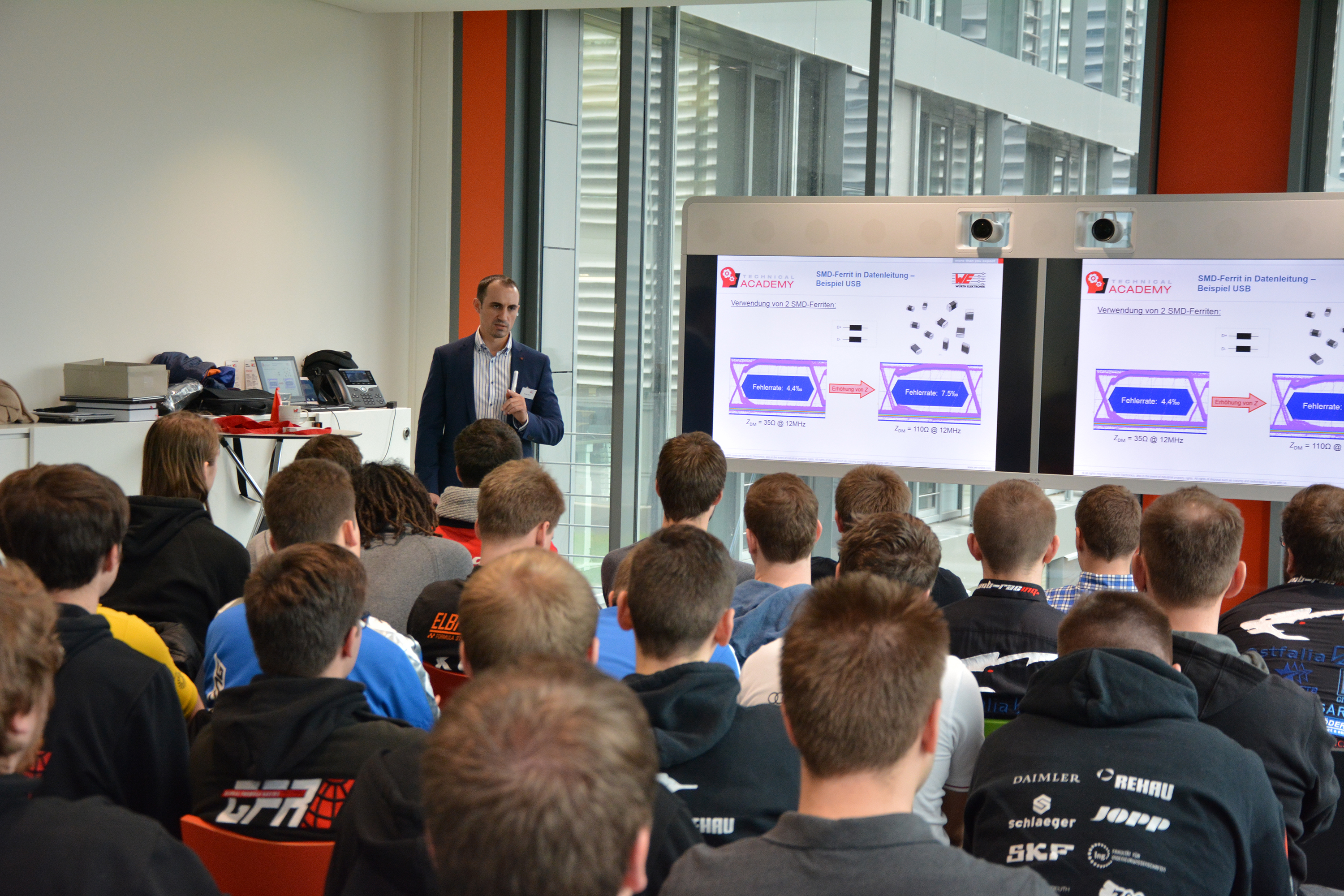 (pressebox) (Waldenburg, 05.12.2018) Würth Elektronik eiSos baut sein Engagement für Formula Student Teams weiter aus. Das Unternehmen hatte am Freitag, den 30. November 2018 über 50 interessierte Ingenieurstudenten aus ganz Deutschland nach Waldenburg eingeladen, um ihnen sein umfangreiches Unterstützungspaket vorzustellen. Ein Fachvortrag zur elektromagnetischen Verträglichkeit, ein gemeinsames Mittagessen und die anschließende Führung durch die Produkt- und Qualitätsmanagementlabore rundeten den Tag ab.