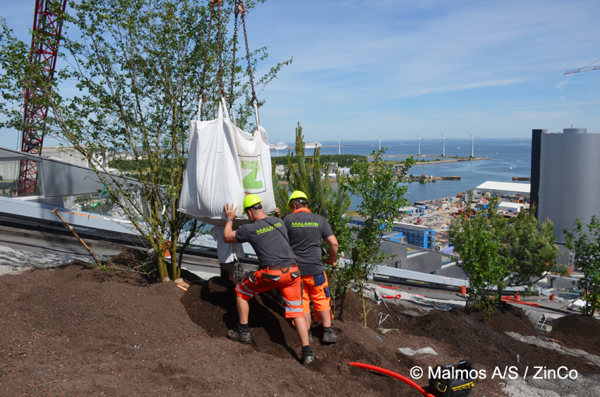Ganze 3.000 m² wurden auf dem „Berg“ als robuste Naturlandschaft bepflanzt. Dazu dienen die hoch belastbaren ZinCo-Dränageplatten Protectodrain PD 250 aus ABS-Kunststoff, die aufgrund ihrer unterseitig aufkaschierten Gummischutzmatte ebenfalls rutschhemmend sind. Auf das Systemfilter folgten sodann 5000 Tonnen ZinCo-Systemerde auf der Basis von recycelten Tonziegeln, teilweise aufgeblasen und teilweise über Förderbänder auf das Dach verteilt oder auch per Kran im Big Bag angeflogen. Die Substrathöhe variiert von etwa 20 bis über 100 cm im Bereich der Gehölze mit größeren Wurzelballen. Ausgewählt wurden für Dänemark typische Pflanzenarten – robust genug, um in dem besonderen Mikroklima auf dem Dach zu gedeihen. In sehr steilen und damit erosionsgefährdeten Bereichen setzte man gezielt Vegetationsmatten ein, die eigens dafür über ein Jahr lang vorkultiviert wurden. Das ist gerade unterhalb der Baumpflanzungen der Fall, welche einer besonderen Verankerung bedurften. Über die betonierten Widerlager legte man aufgekantete Gitter und schuf somit stabile Befestigungsmöglichkeiten für das Festzurren der Wurzelballen.