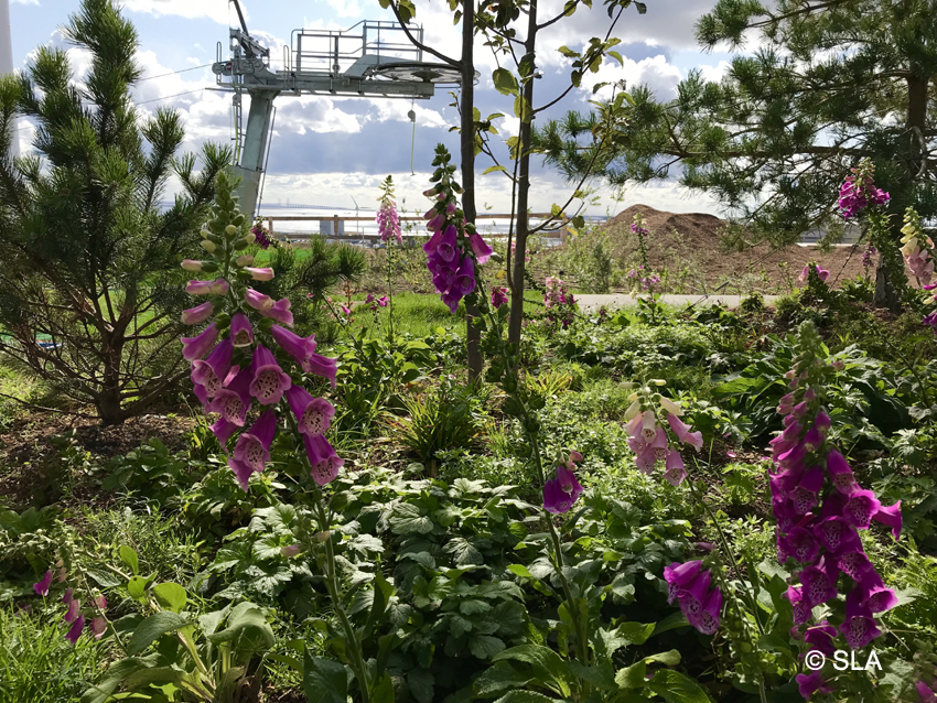 Eine Tropfschlauchbewässerung sorgt dafür, dass die grüne Bergwelt auch dauerhaft gedeiht. So kann und soll diese artenreiche Begrünung mit Gräsern, Kräutern, Stauden, Sträuchern und Bäumen auch als „grüne Wiege“ dienen für die Aussamung in die Umgebung von Copenhill.