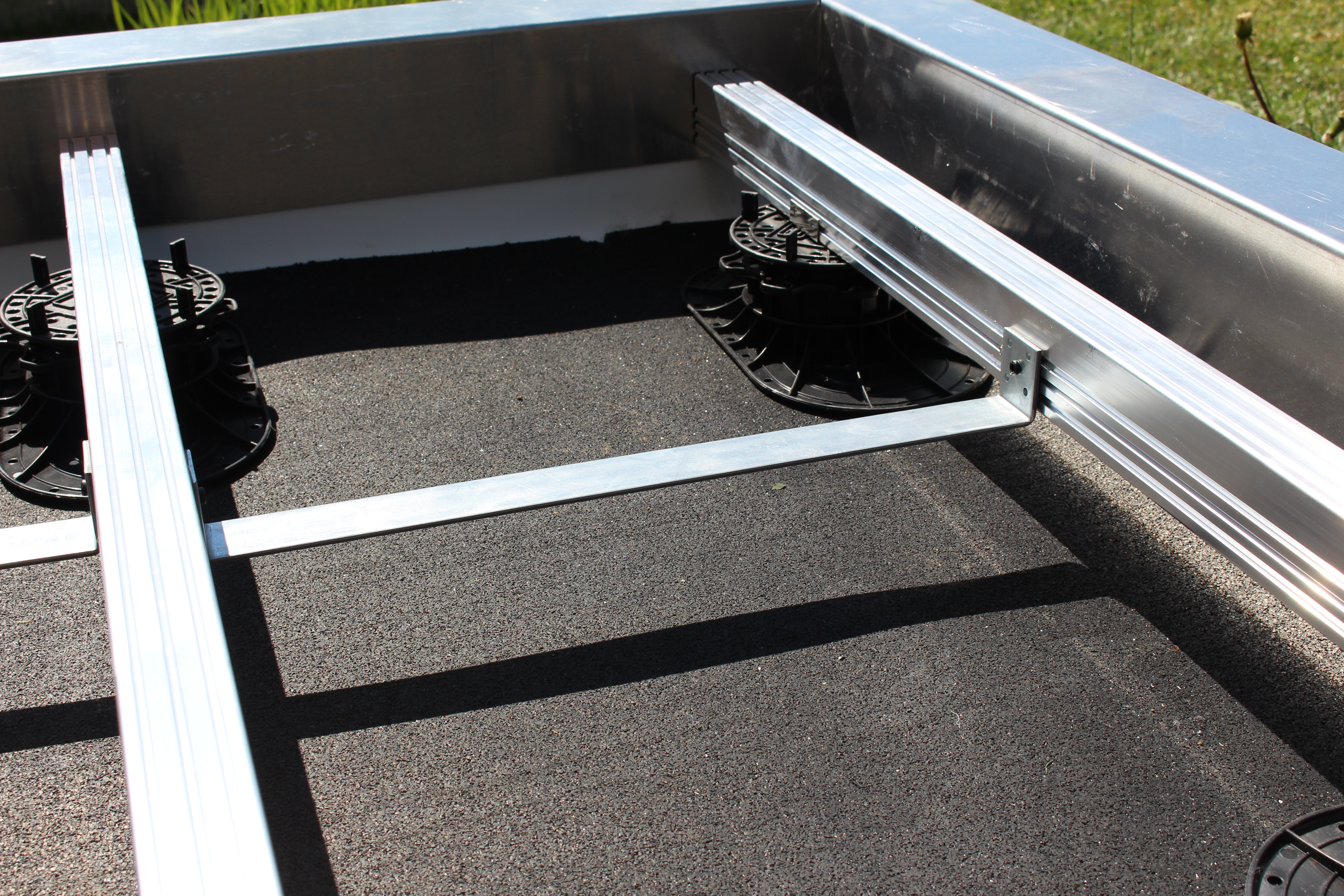 The various components are connected in an intelligent and therefore quick manner. First of all, retainer clips are clipped onto the Elefeet pedestals without the need for a tool, and the rails are clipped into these clips. The extruded aluminium profiles have double grooves on the side in which the punched studs of the rail connectors are positioned, flush and friction-locked. This prevents twisting and only a small screw on each side is required for fixing in the screw groove. There is no need for time-consuming pre-drilling Support plates are then placed on the rails, as required. They only have to be screwed to the rail at the edge area or in the case of high stress. Once the sub-structure is fitted, the flooring can be installed in no time at all, be it concrete or natural stone slabs, wood or WPC decking. Also ideal for thin-layered ceramic flooring, as you just have to work here with additional cantilever plates. And the entire system is weatherproof and can therefore be used again, for example, where a wooden deck has to be replaced.