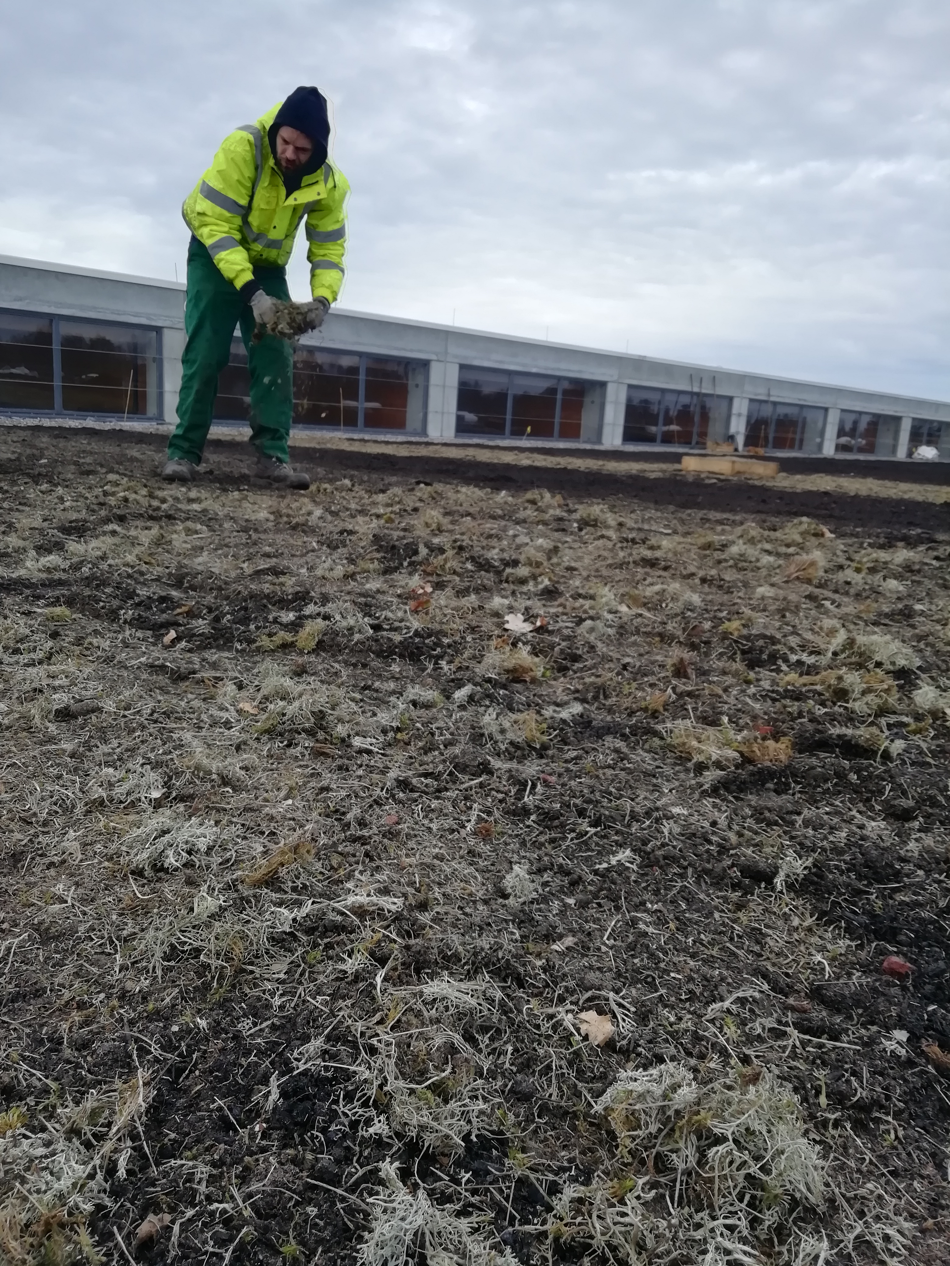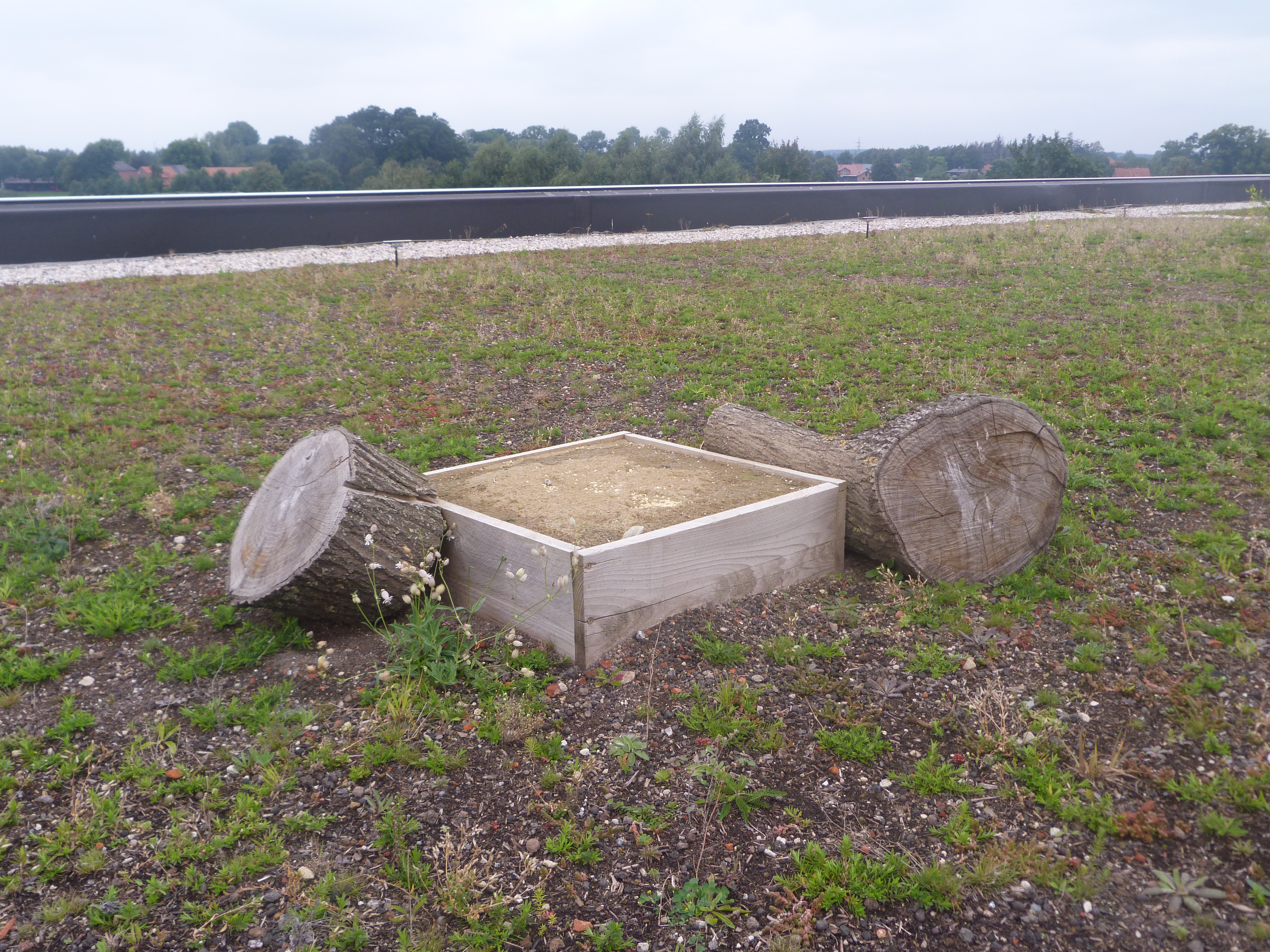 Auf abgegrenzten Bereichen wurden als hochwertigste Form der Vegetationsansiedlung zertifiziertes gebietseigenes Saatgut und samenhaltiges Rechgut aus Sandtrockenrasen der Region, das auch Moose und Flechten enthielt, auf den vorbereiteten Substratflächen ausgebracht. Ergänzend wurden Sedum-Sprossen gebietseigener Herkunft verwendet. Genau diese regionaltypischen Arten der Nordwestdeutschen Sandtrockenrasen stellen das passende Nahrungsangebot für viele heimische Tierarten dar. Diese nutzen das Angebot aber nur, wenn sie auch Unterschlupf auf dem Dach finden, denn Wildbienen z.B. haben einen Aktionsradius von wenigen 100 Metern. Daher wurden auch vegetationsfreie Flächen wie Sandlinsen, Totholz und kleine Wasserflächen als Lebensraum und Brutstätten angelegt. Über eine besonders augenscheinliche Brutstätte dürfen sich die Störche freuen, denn ihr Nest thront über allem.