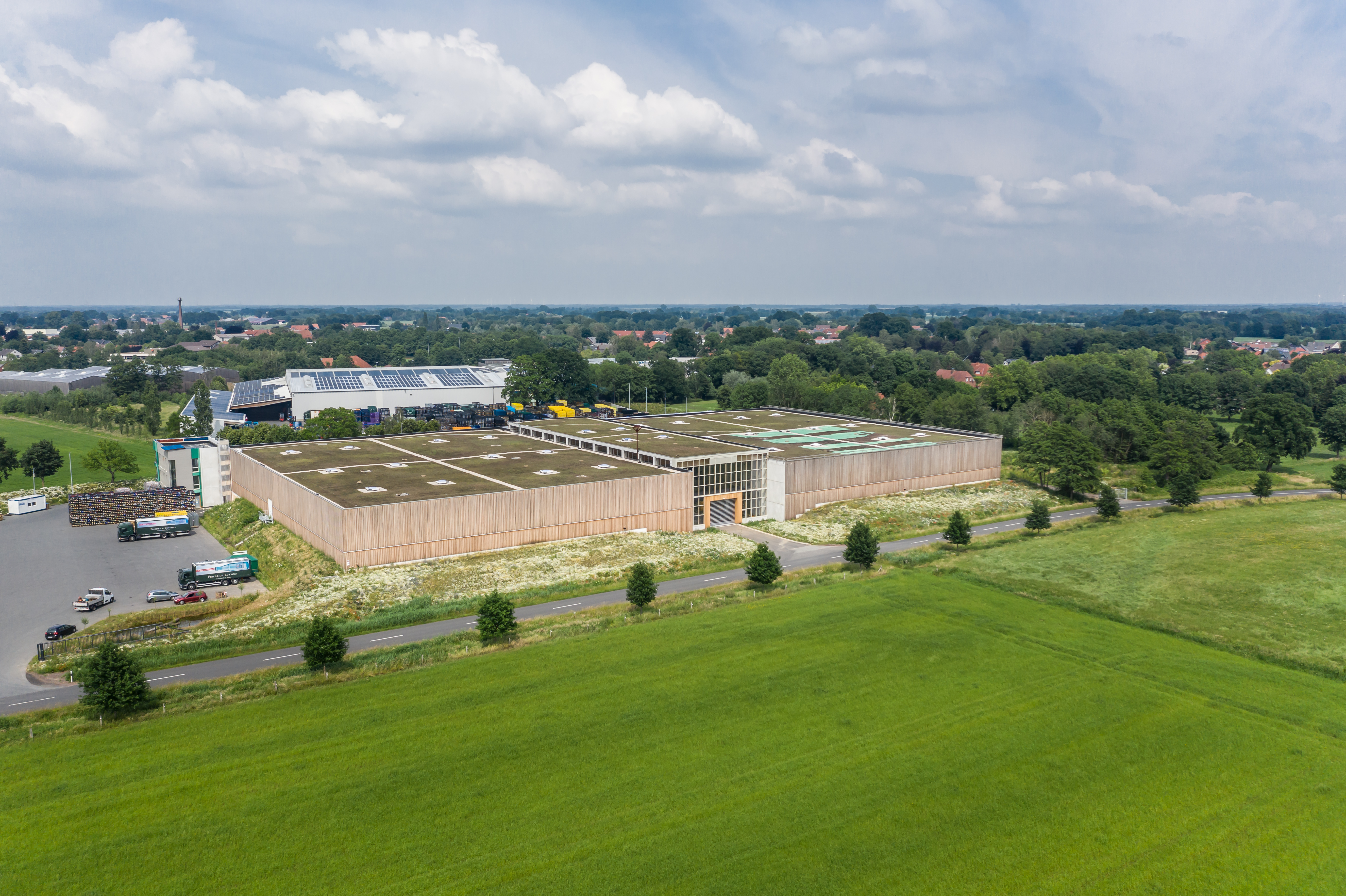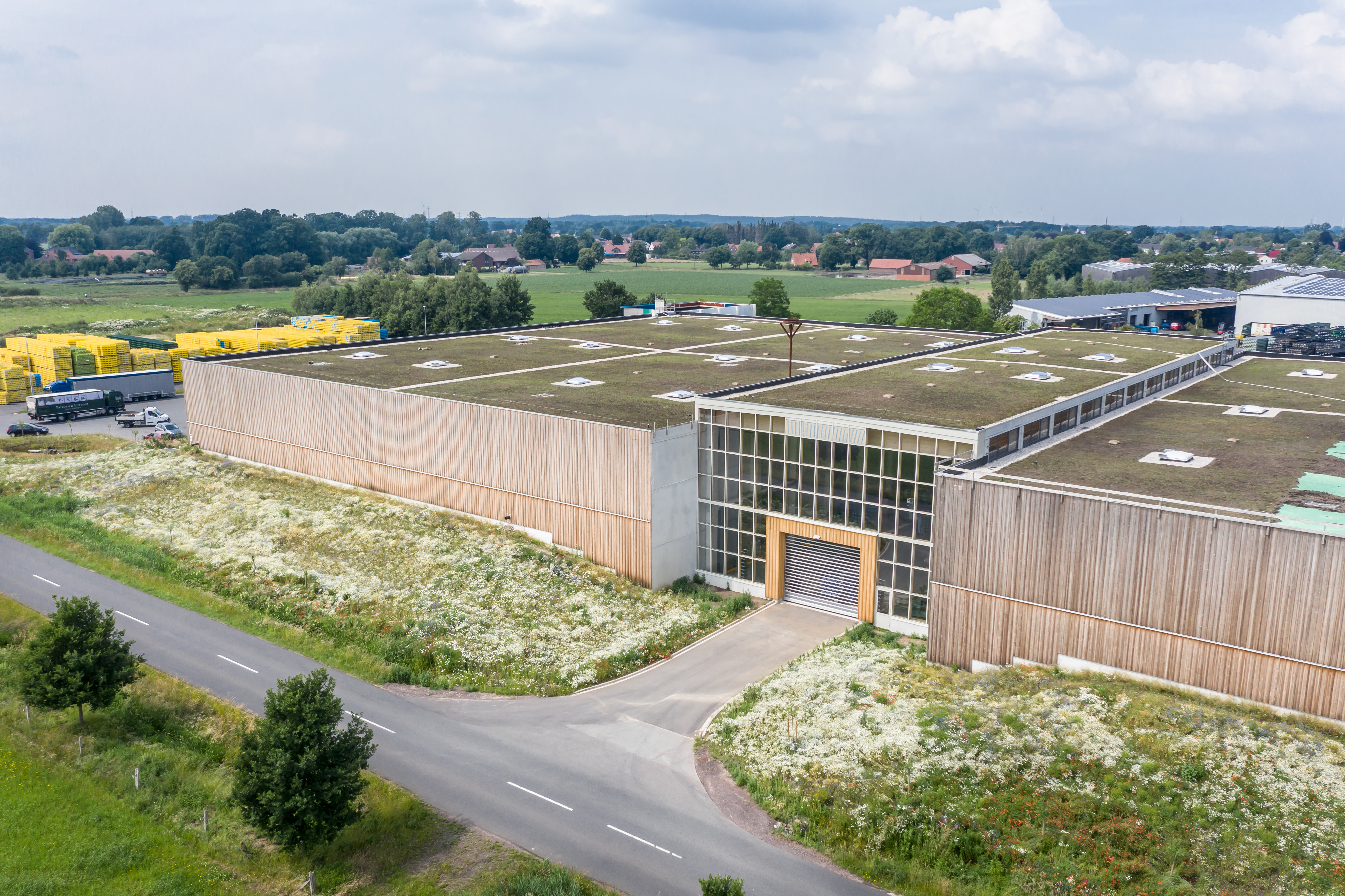 „Wie baut man in Zeiten von Flächenfraß, Artensterben und Klimawandel ein umweltfreundliches Lager?“ fragte sich Dirk Lütvogt, damaliger Geschäftsführer des in vierter Generation geführten Familienbetriebes aus dem Kreis Diepholz, das „Nachhaltigkeit“ in seinen Unternehmensgrundsätzen verankert hat. Darum war Dirk Lütvogt auch sofort begeistert von der Gründach-Idee, die während der Planungsphase für die neue Halle mit dem zuständigen Diepholzer Fachdienstleiter für Kreisentwicklung, Detlef Tänzer, zur Sprache kam. Dass sich hieraus sogar eine Kooperation mit der Hochschule Osnabrück ergab, hing auch mit dem Dachbegrünungshersteller ZinCo und dessen gemeinsamen Projekt mit der Hochschule zusammen. Dirk Lütvogt bewies großes Engagement und setzte die Ideen gemeinsam mit allen Projektbeteiligten in die Tat um.