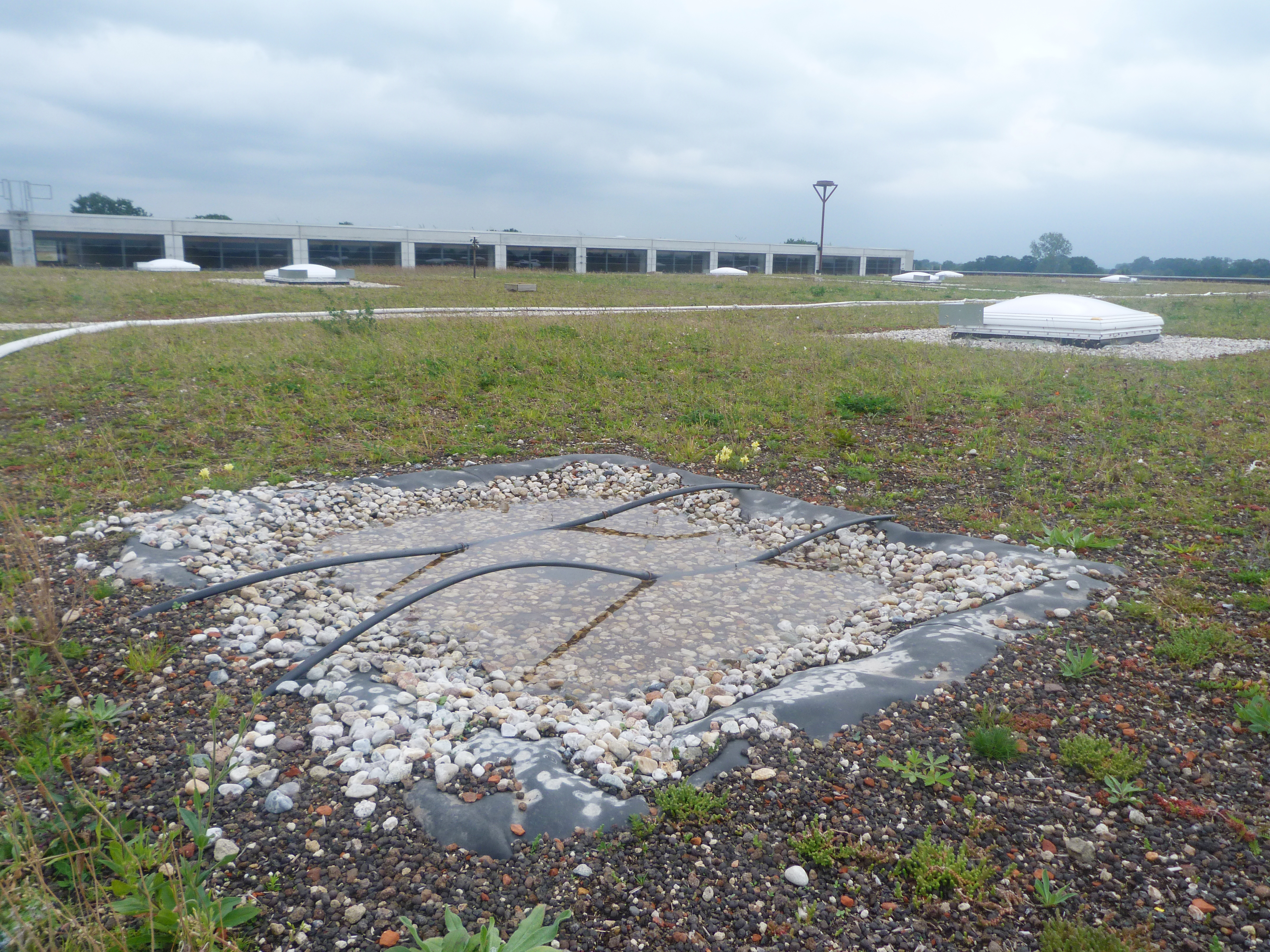 Die Wissenschaftler teilten das Dach in unterschiedliche Teilflächen, um das Wachstum heimischen Saat- bzw. Rechguts in Abhängigkeit verschiedener Substrat- und Bewässerungsmengen zu beobachten und schließlich die beste Kombination zu finden. Umgesetzt wurden dabei Systemvarianten mit den Wasserverteil-, Speicher- und Dränelementen Aquatec AT45 und darüber hinaus mit der Dränage-Rollenware Fixodrain XD 20.