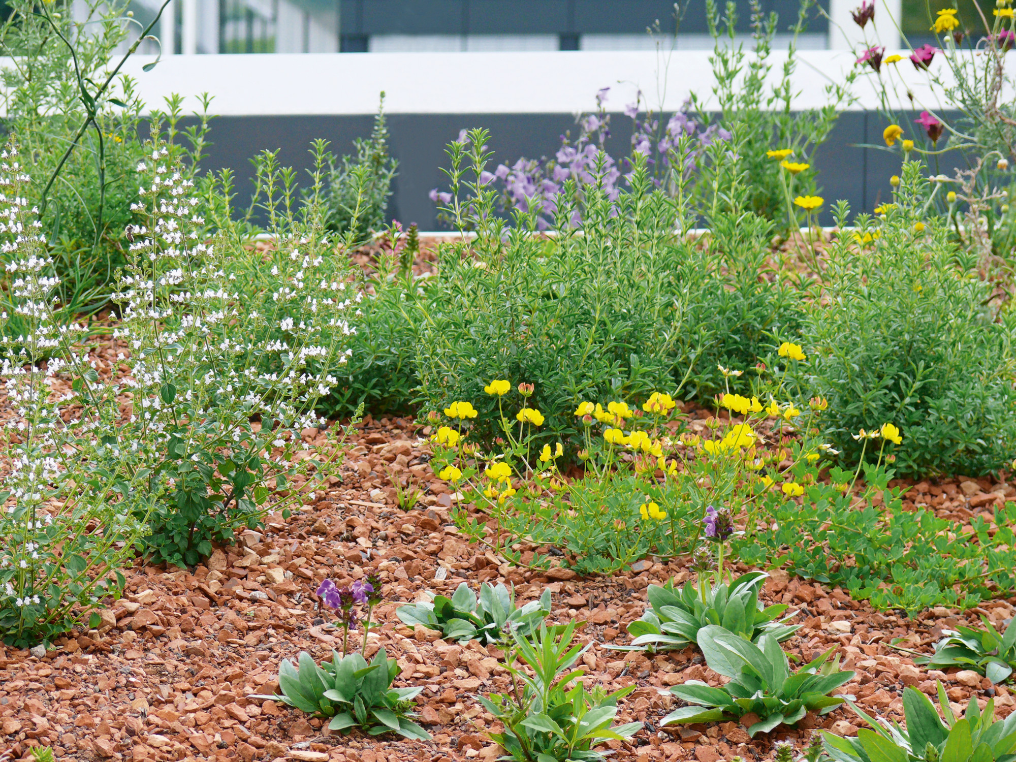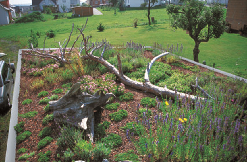 Für die Umwelt lohnt sich jeder Quadratmeter noch viel mehr, da der Natur wertvoller Lebensraum zurückgegeben wird. Um Arterhalt und Artenreichtum gezielt zu fördern, hat ZinCo die Pflanzengemeinschaft „Bienenweide“ im Garagenpaket. Sie beinhaltet mehr als 35 verschiedene, nektar- und pollenreiche Pflanzenarten mit Blühkraft vom zeitigen Frühjahr bis in den späten Herbst. Wer zusätzlich Nistkästen und Totholz aufbringt oder sogar Anhügelungen schafft und ergänzende Stauden pflanzt, der steigert die Biodiversität weiter. So entsteht eine pflegearme Begrünung, die ihrerseits einen wertvollen Beitrag für das Kleinklima schafft (durch die Verdunstung) sowie Staub und Schadstoffe bindet. Außerdem bietet die Begrünung Schallschutz und Wärmedämmung.