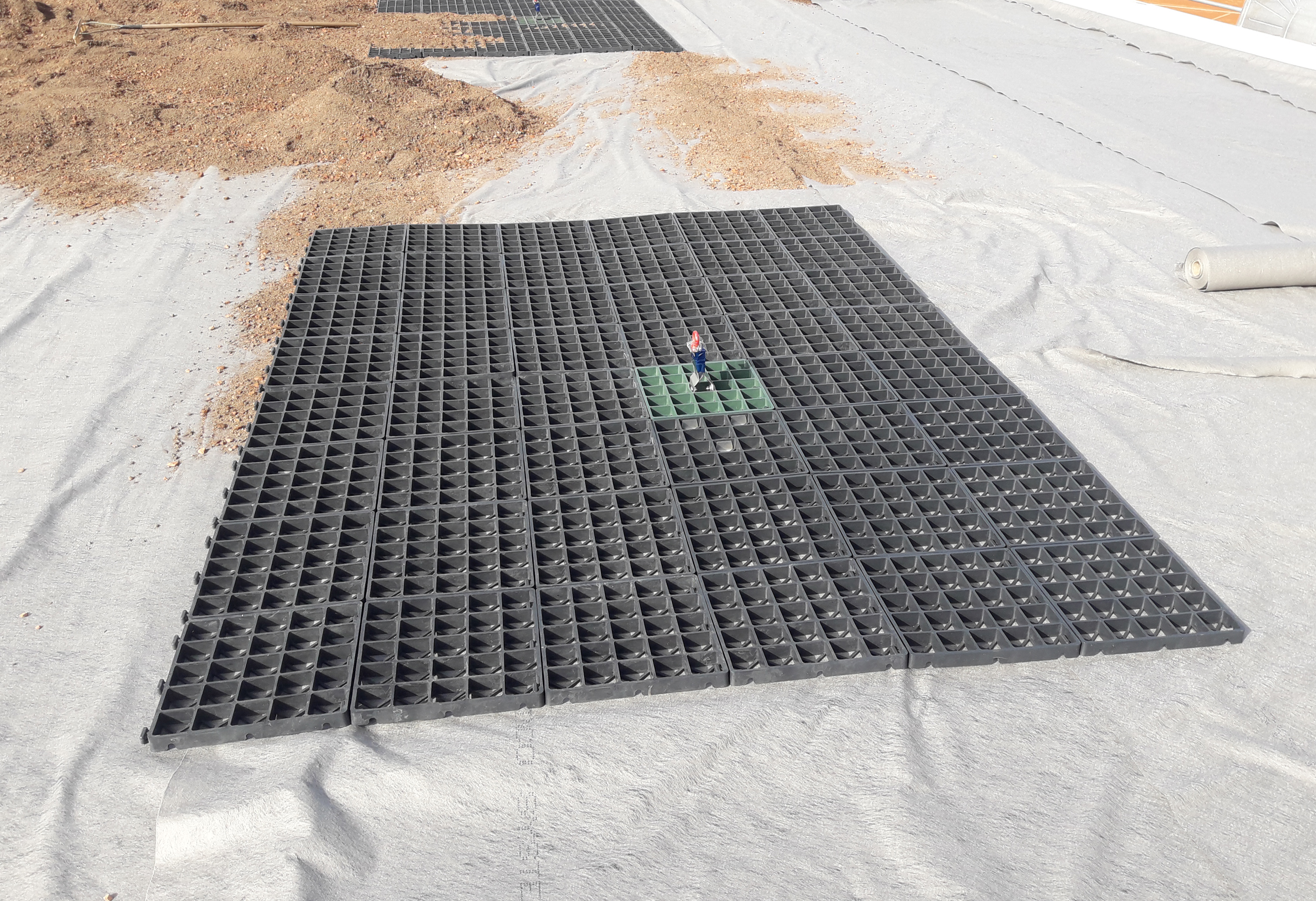 Das Altdach war nach statischer Prüfung sehr gut für das geplante Biodiversitäts-Gründach geeignet. Es konnte als Grundlage für den neuen Aufbau dienen und musste nicht einmal abgeräumt werden. Nach dem Entfernen der Solarthermie-Module erhielt es zunächst eine Zusatzdämmung sowie eine wurzelfeste Kunststoffabdichtung. Auf dieser Basis startete der ZinCo-Systemaufbau mit der Schutz- und Speichermatte SSM 45 und dem Drän- und Wasserspeicherelement Floradrain FD 25. Dieses speichert Regenwasser in seinen oberseitigen Mulden und führt Überschusswasser auf der Unterseite sicher den Dachabläufen zu. Zur Abdeckung der Dränschicht folgte das Systemfilter SF, so dass keine Feinteile aus der darüber liegenden Substratschicht eindringen können.