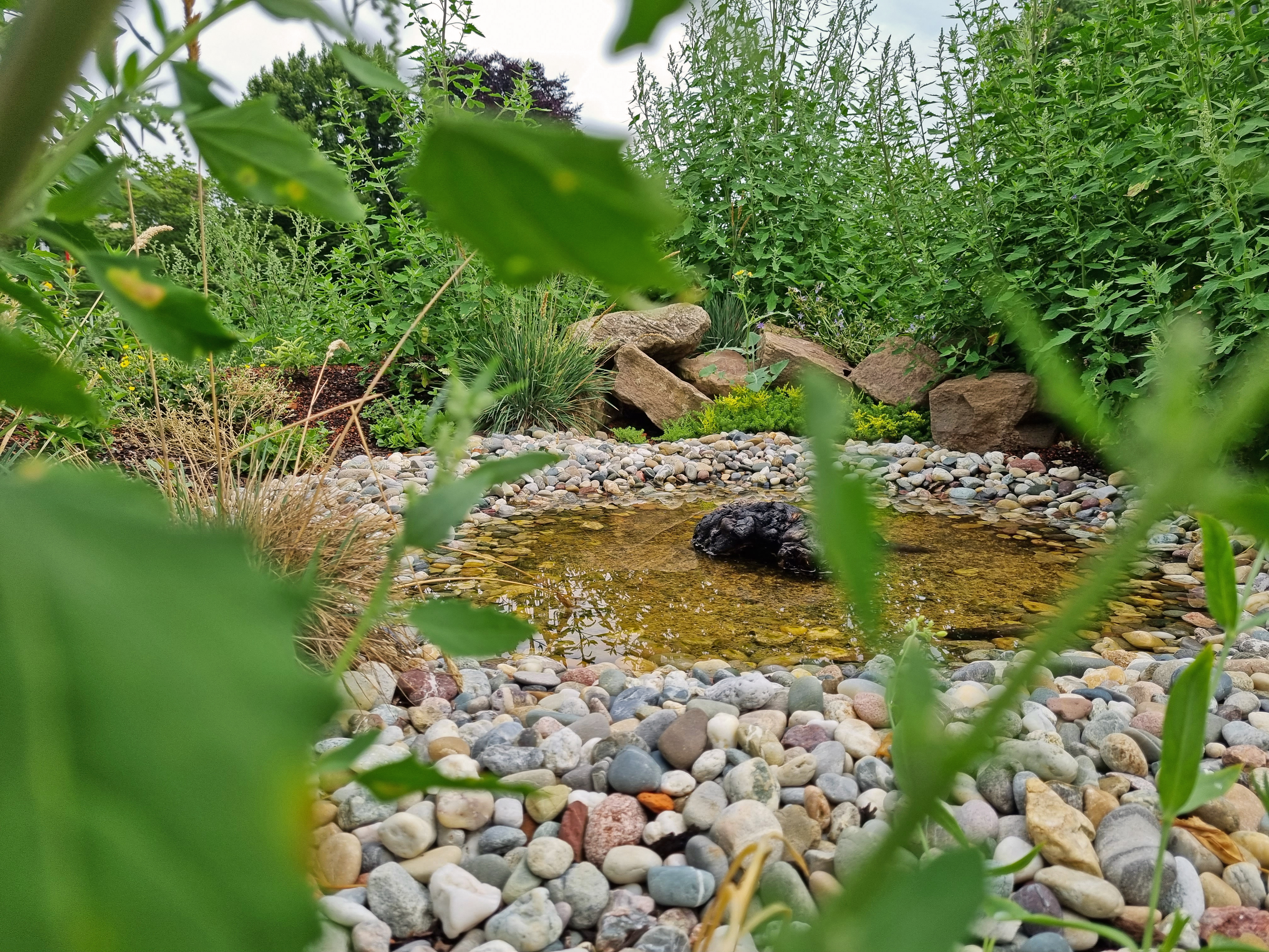 Eine breite Palette an Biodiversitäts-Modulen ergänzt die eigentliche Bepflanzung, damit Insekten, Schmetterlinge und Vögel nicht nur Futter auf dem Dach finden, sondern auch artgerechte Nistplätze und Rückzugsbereiche. Dazu dienen vegetationsfreie Flächen wie Sandlinsen, Grobkiesbeete, Steinanhäufungen und Totholz. Zum Biodiversitätsdach gehört zudem eine kleine Wasserfläche, die als Vogel- und Insektentränke dient. Zu guter Letzt sind zwei tolle Insektenhotels installiert.