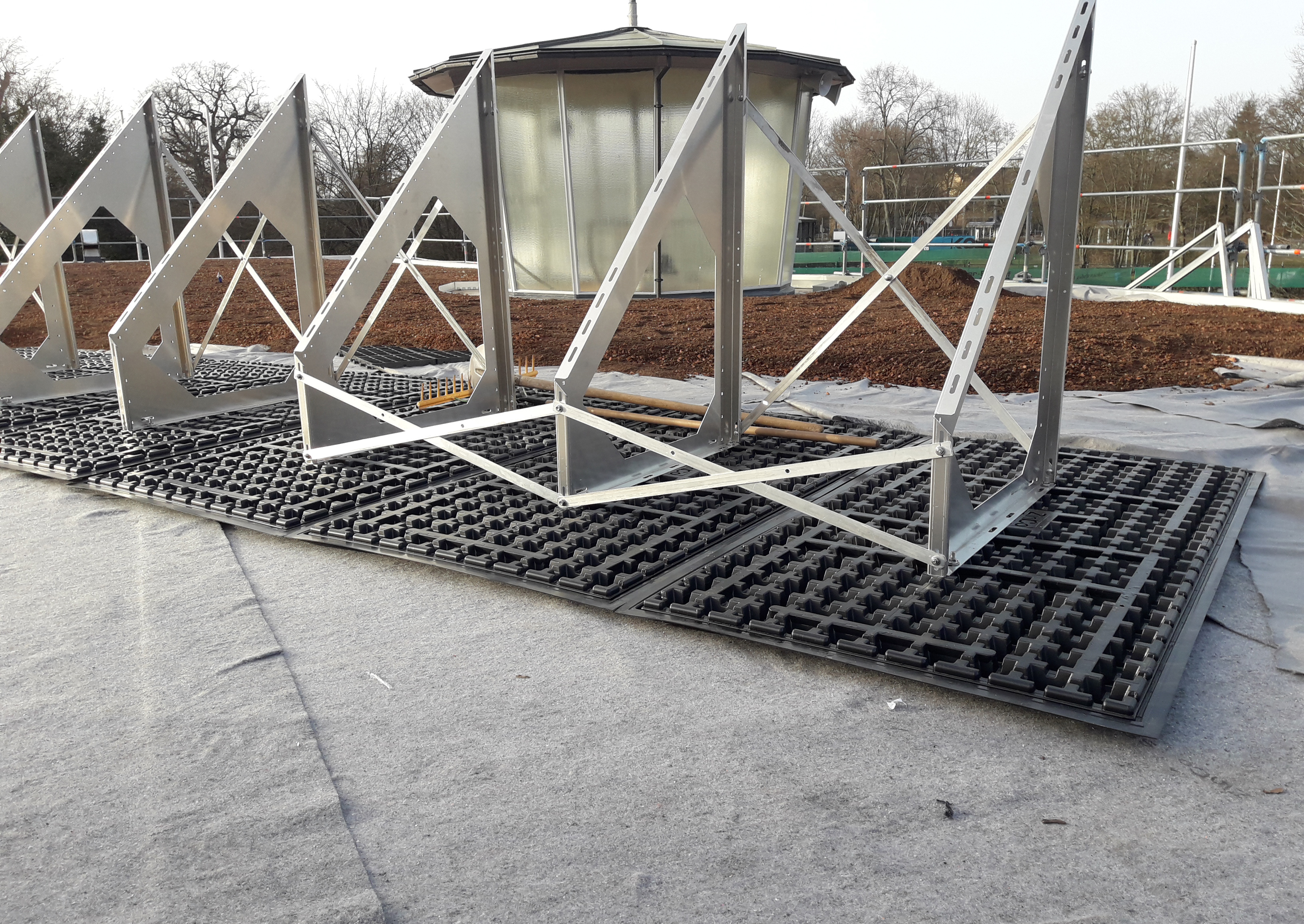 Ebenfalls nach dem Auflastprinzip sind die Aufständerungen für die Solaranlage verankert. Für die Fläche von 14 m² kamen sieben Solarbasis-Platten SB 200 in den Systemaufbau mit jeweils einem Solargrundrahmen zur Befestigung der Module. Diese auflastgehaltene Bauweise erübrigt Dachdurchdringungen und vermeidet damit etwaige Schwachstellen in der Dachabdichtung.