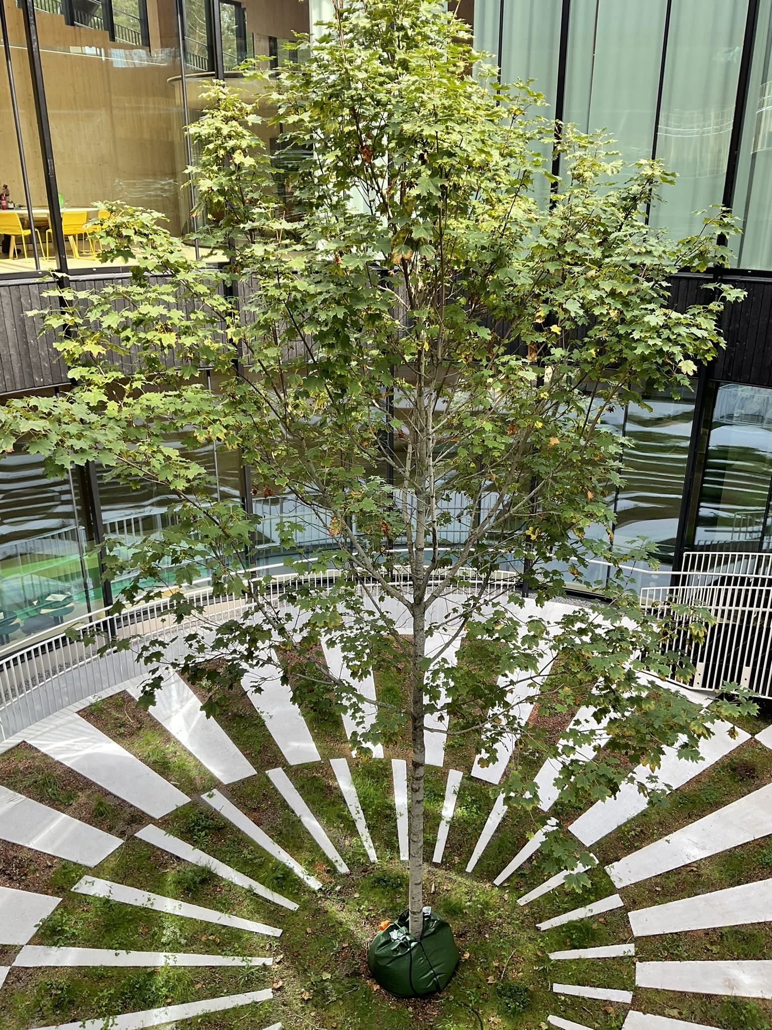 Vestre and BIG combined the wish for a building that would be economic, sustainable and social at the same time. This is when the idea was conceived of embedding the factory directly in planted pine woods and of creating an experience centre of the building and the 300 Ha of woods that would be accessible to all. Visitors can get to know all about furniture manufacturing during a guided tour, and about energy generation, recycling, water treatment or the life cycle of materials. At the same time, they experience the “woods” as a resource, and can picnic or camp there. What’s special about the overall structure of The Plus building is that you have a direct view of the production process from all angles through the enormous, glazed facades, as if they were shop windows. And, there are many points of access to this, the most open and transparent factory in the whole world. For example, two 150 m long linear staircases run in opposite directions up to the 6,350 m² large roof area. From there you can see not only into each wing of the cross-shaped factory but also into the central circular courtyard with its solitary maple tree. A circular staircase sweeps down to the courtyard. If you prefer to slide, you can take the alternative of the curved slide from the roof top right down to ground level.